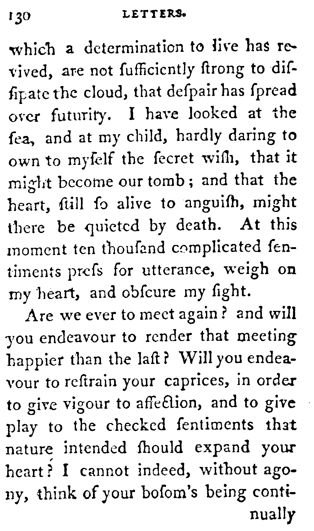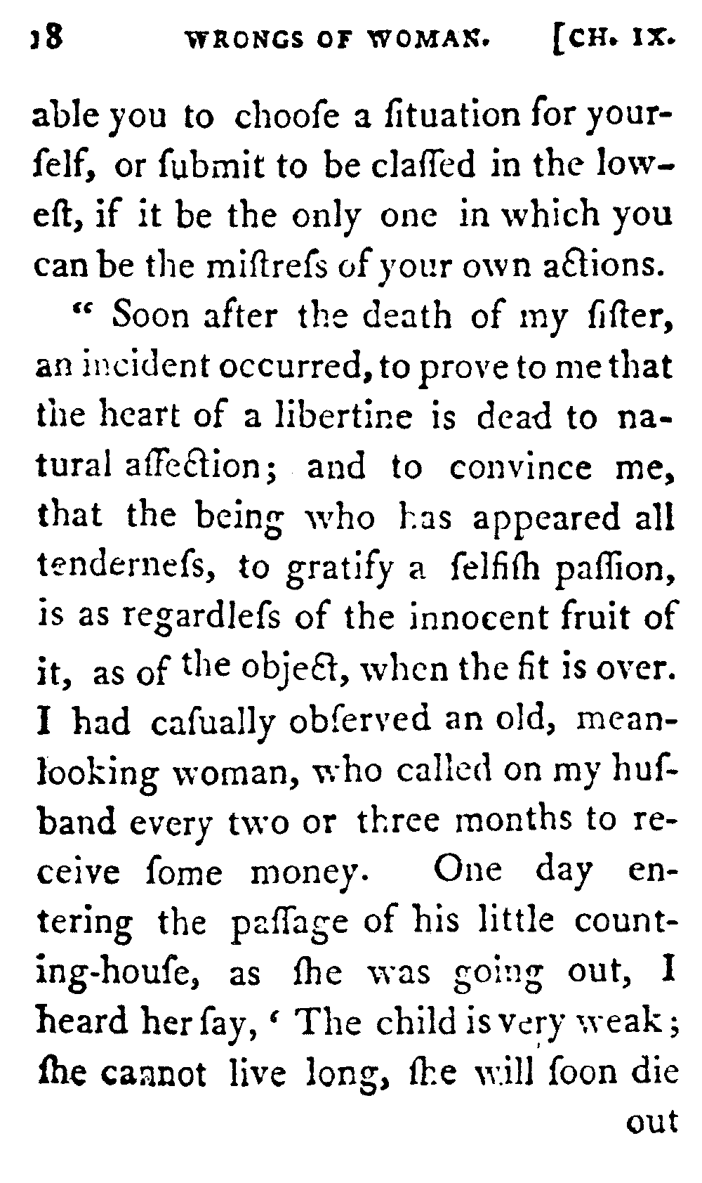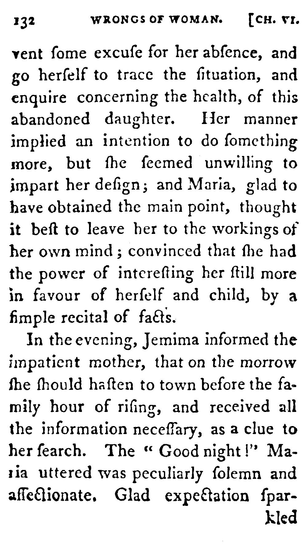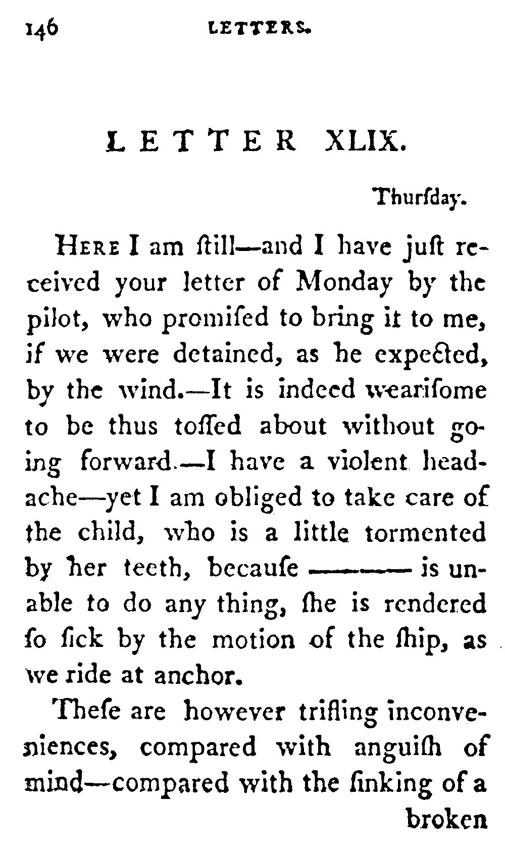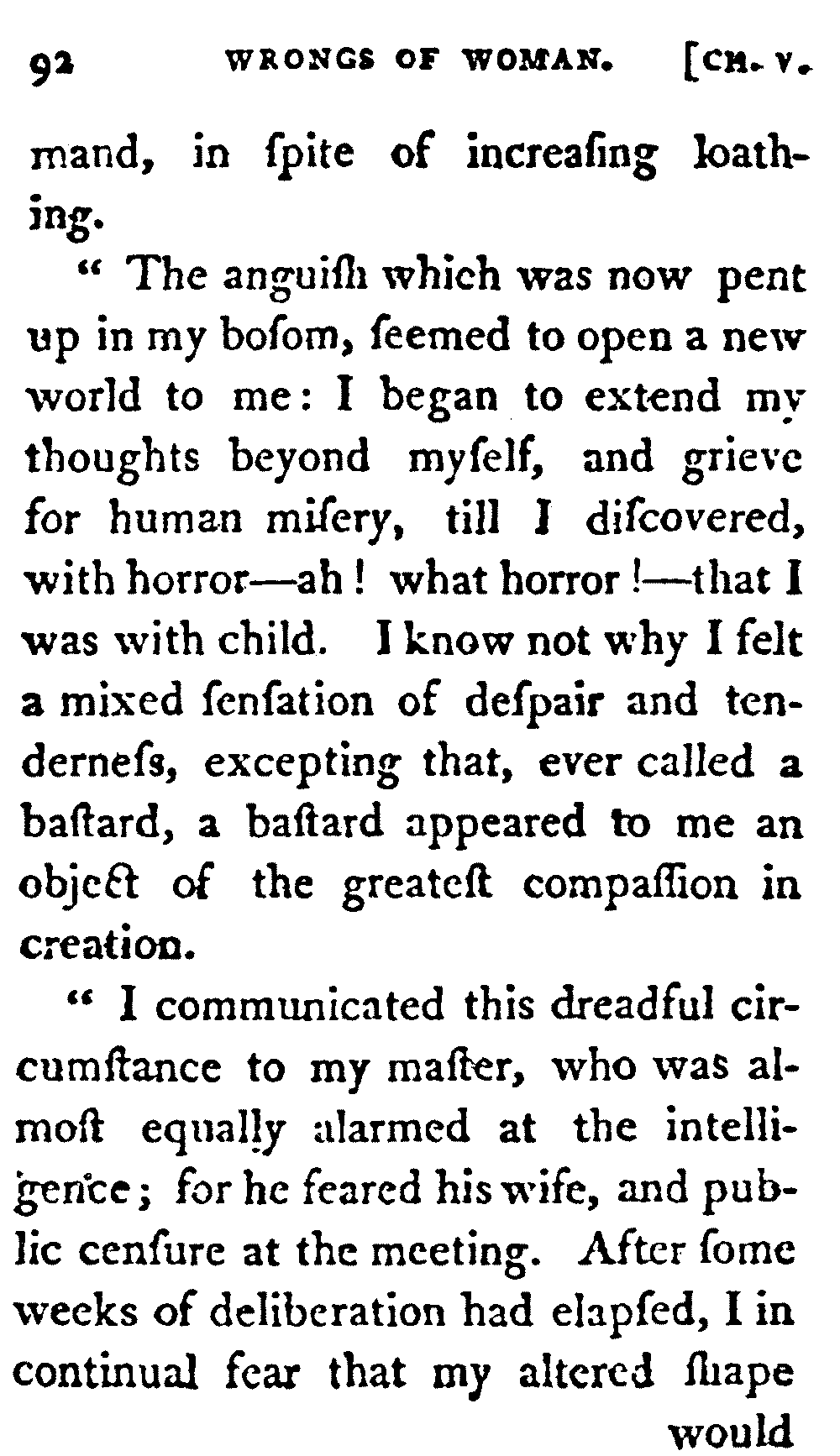 The retreating shadows of former sorrows rushed back in a gloomy train, and seemed to be pictured on the walls of her prison, magnified by the state of mind in which they were viewed—Still she mourned for her child, lamented she was a daughter, and anticipated the aggravated ills of life that her sex rendered almost inevitable, even while dreading she was no more. To think[4] that she was blotted out of existence was agony, when the imagination had been long employed to expand her faculties; yet to suppose her turned adrift on an unknown sea, was scarcely less afflicting.