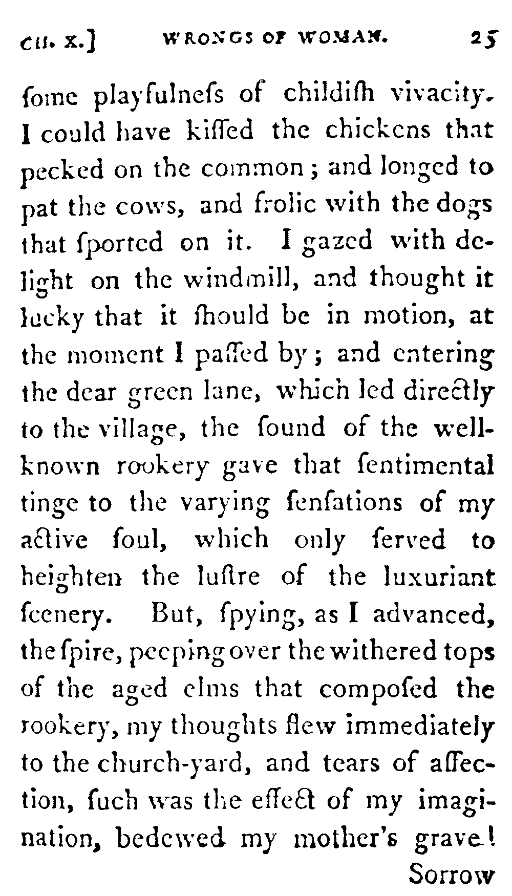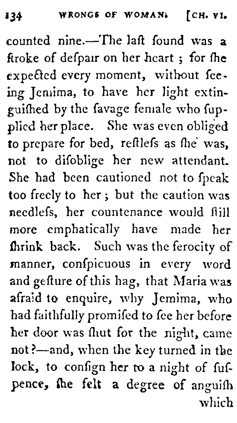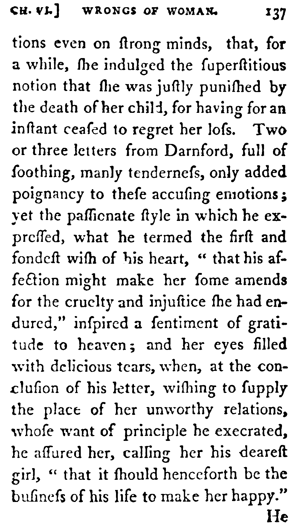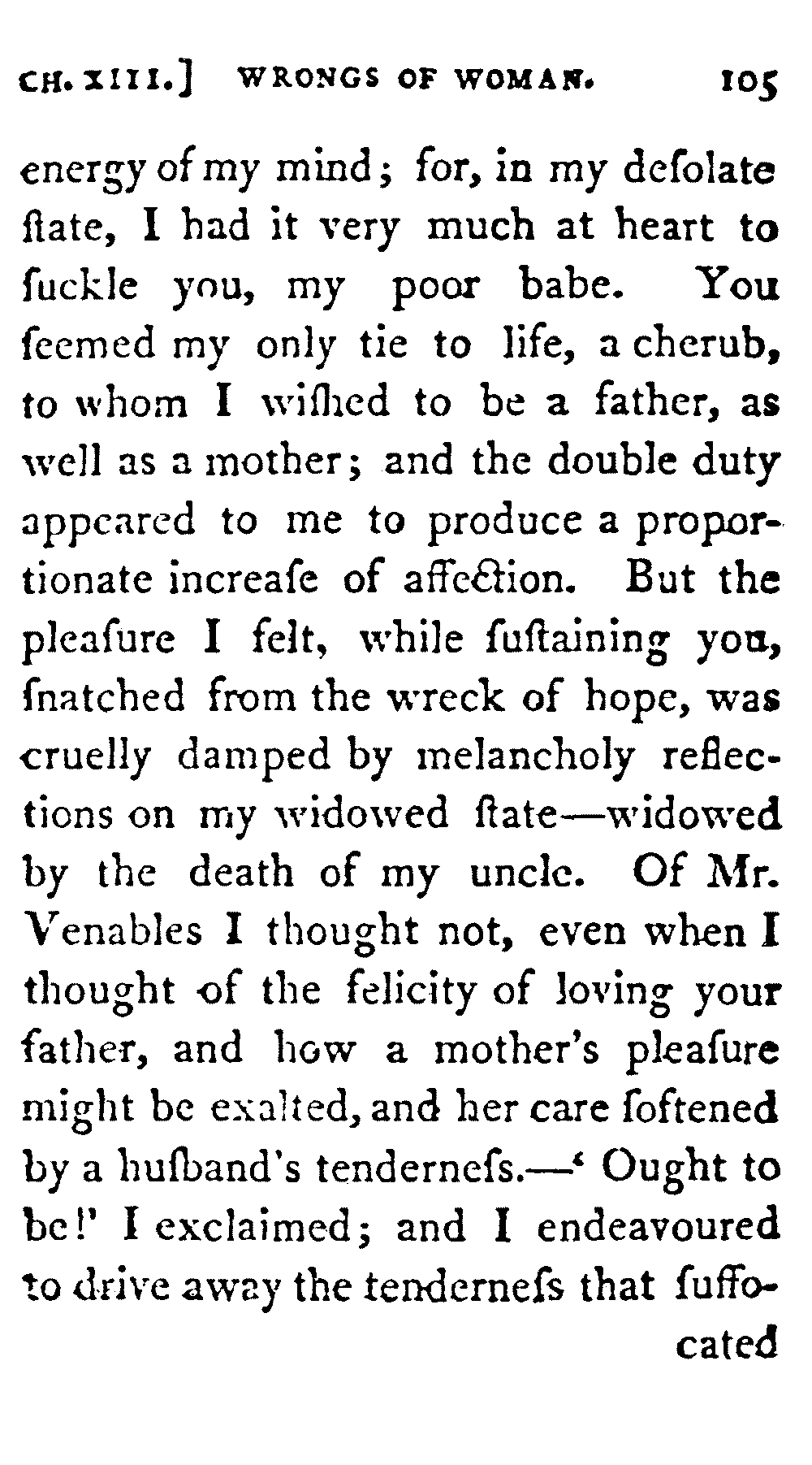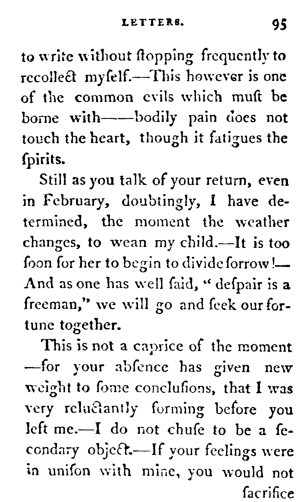 The retreating shadows of former sorrows rushed back in a gloomy train, and seemed to be pictured on the walls of her prison, magnified by the state of mind in which they were viewed—Still she mourned for her child, lamented she was a daughter, and anticipated the aggravated ills of life that her sex rendered almost inevitable, even while dreading she was no more. To think[4] that she was blotted out of existence was agony, when the imagination had been long employed to expand her faculties; yet to suppose her turned adrift on an unknown sea, was scarcely less afflicting.