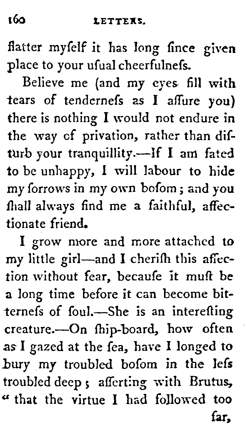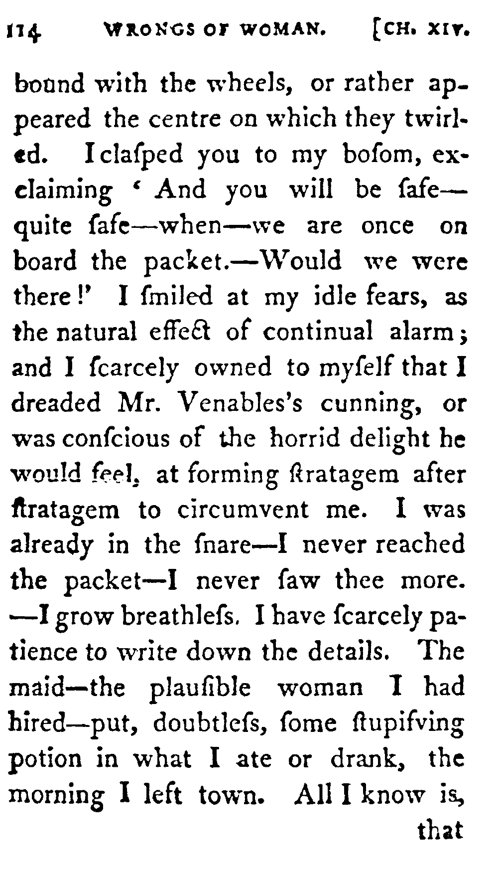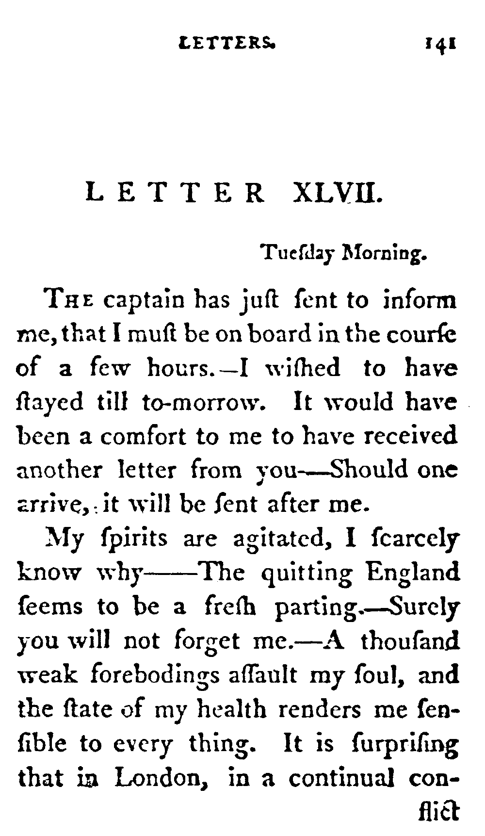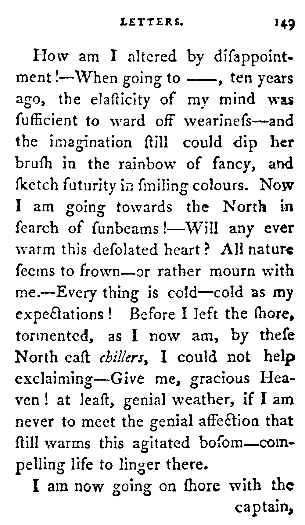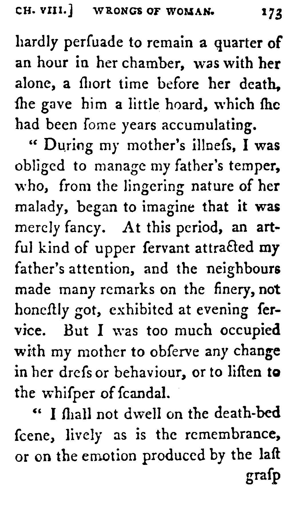 The retreating shadows of former sorrows rushed back in a gloomy train, and seemed to be pictured on the walls of her prison, magnified by the state of mind in which they were viewed—Still she mourned for her child, lamented she was a daughter, and anticipated the aggravated ills of life that her sex rendered almost inevitable, even while dreading she was no more. To think[4] that she was blotted out of existence was agony, when the imagination had been long employed to expand her faculties; yet to suppose her turned adrift on an unknown sea, was scarcely less afflicting.