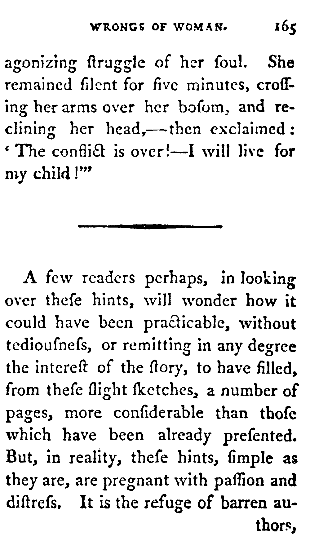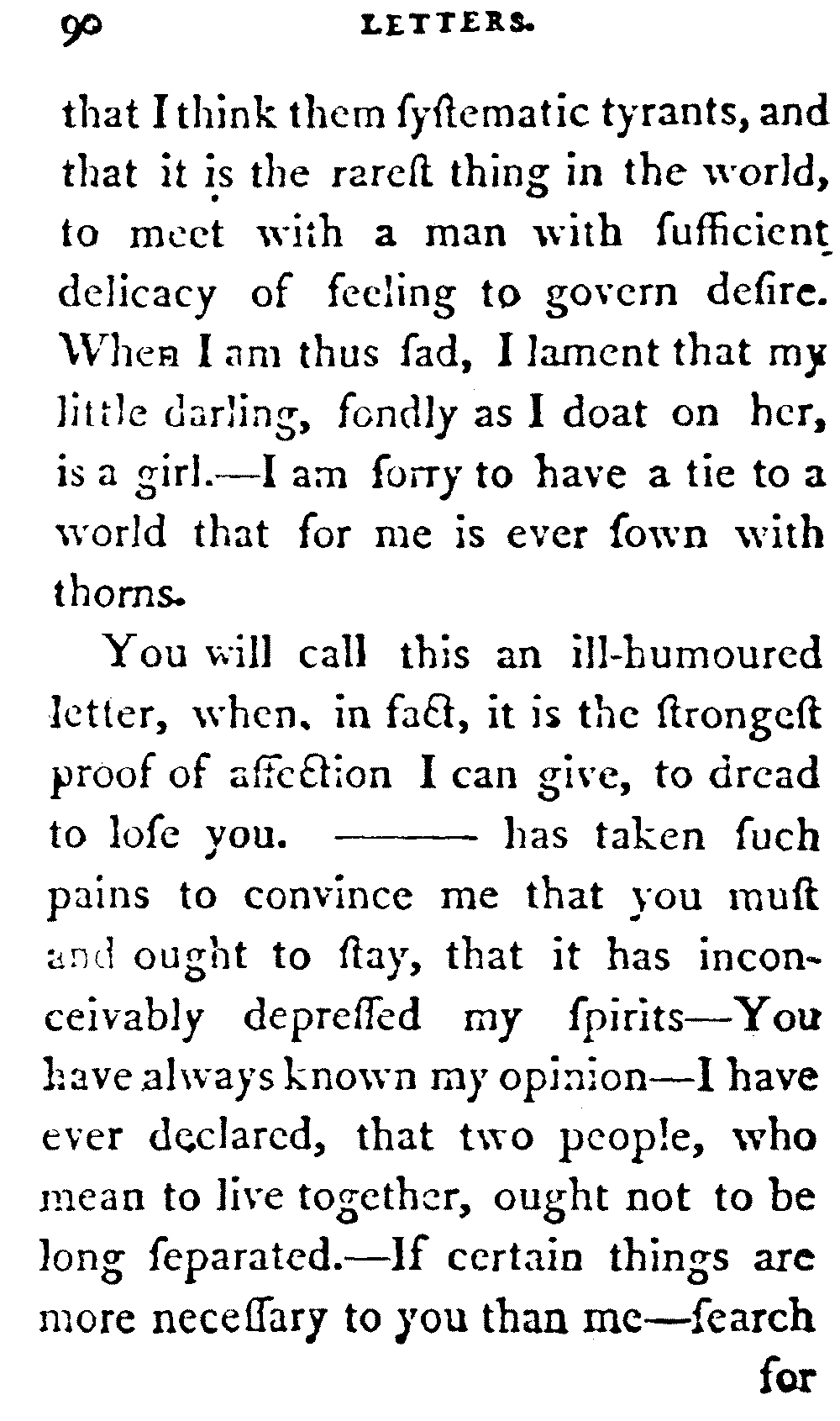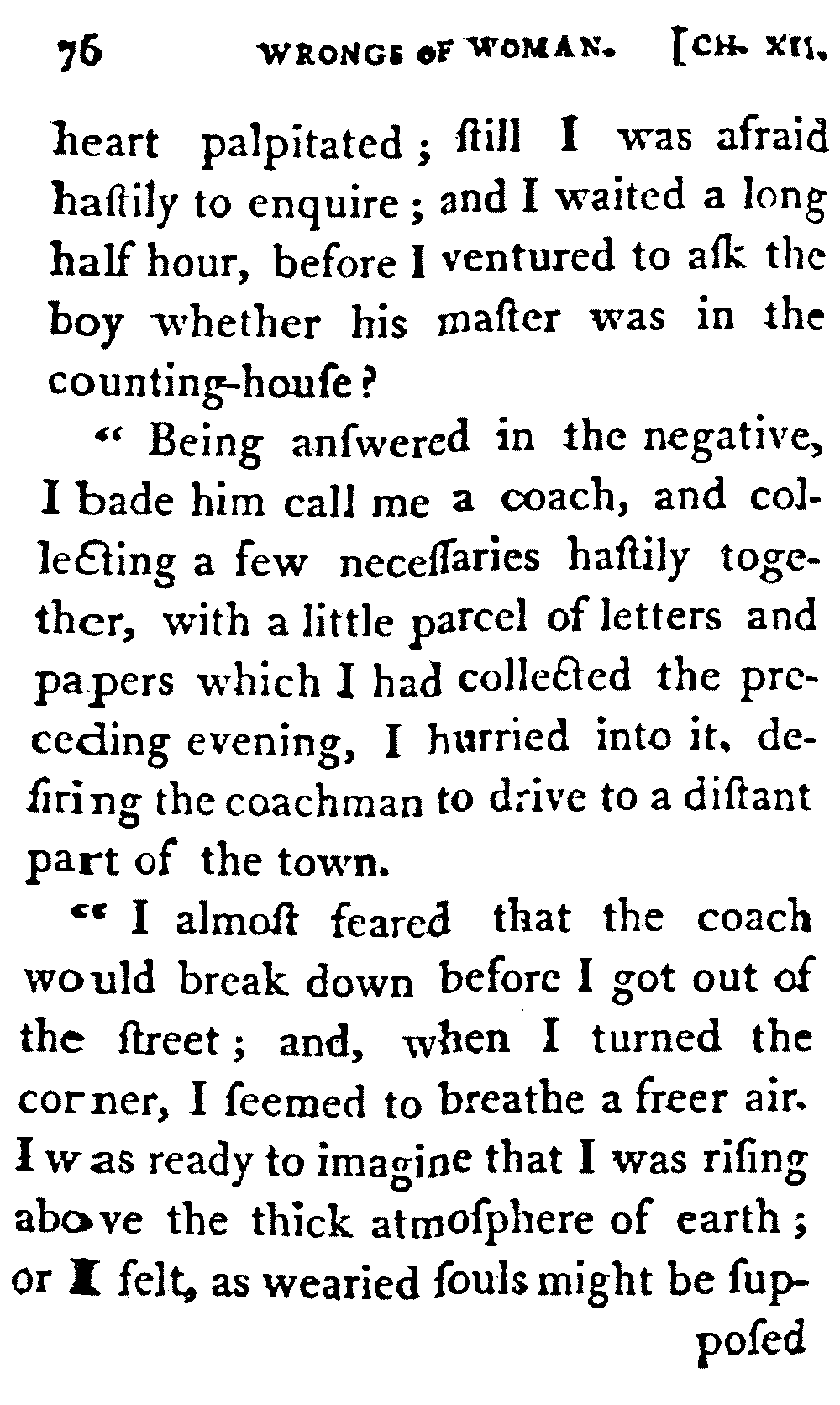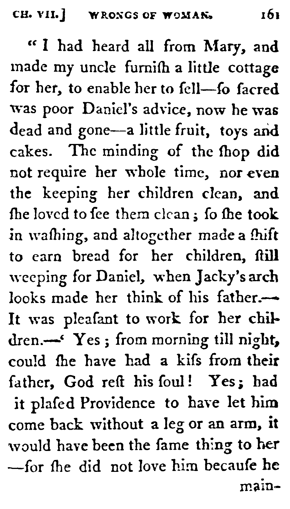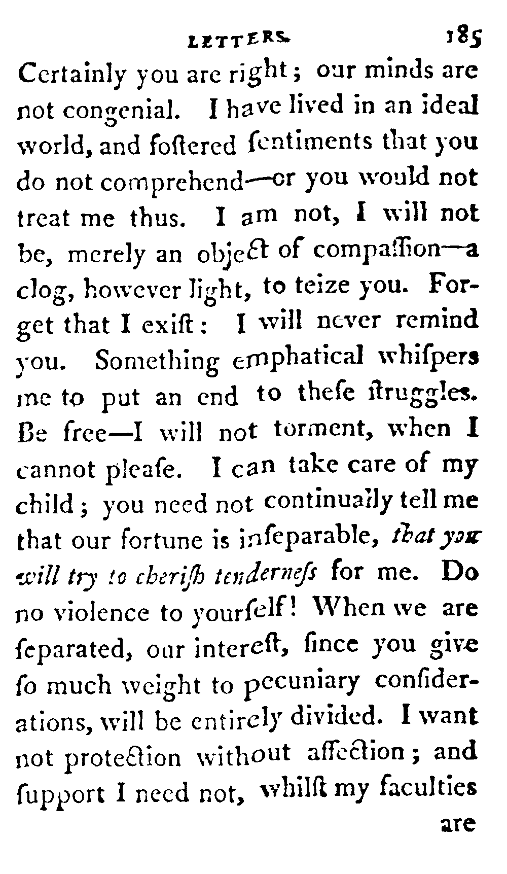 The retreating shadows of former sorrows rushed back in a gloomy train, and seemed to be pictured on the walls of her prison, magnified by the state of mind in which they were viewed—Still she mourned for her child, lamented she was a daughter, and anticipated the aggravated ills of life that her sex rendered almost inevitable, even while dreading she was no more. To think[4] that she was blotted out of existence was agony, when the imagination had been long employed to expand her faculties; yet to suppose her turned adrift on an unknown sea, was scarcely less afflicting.