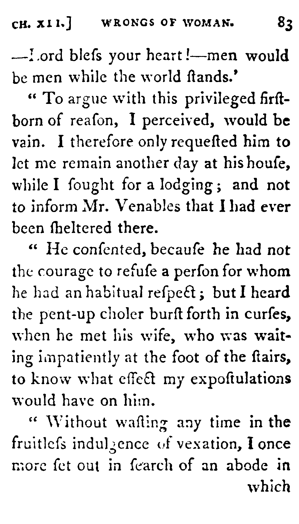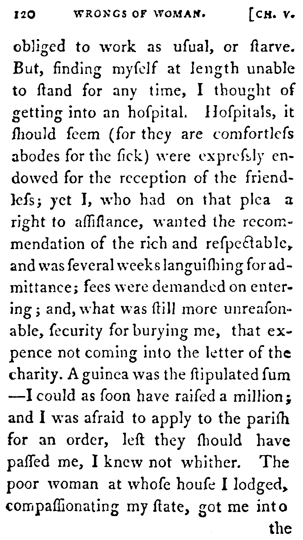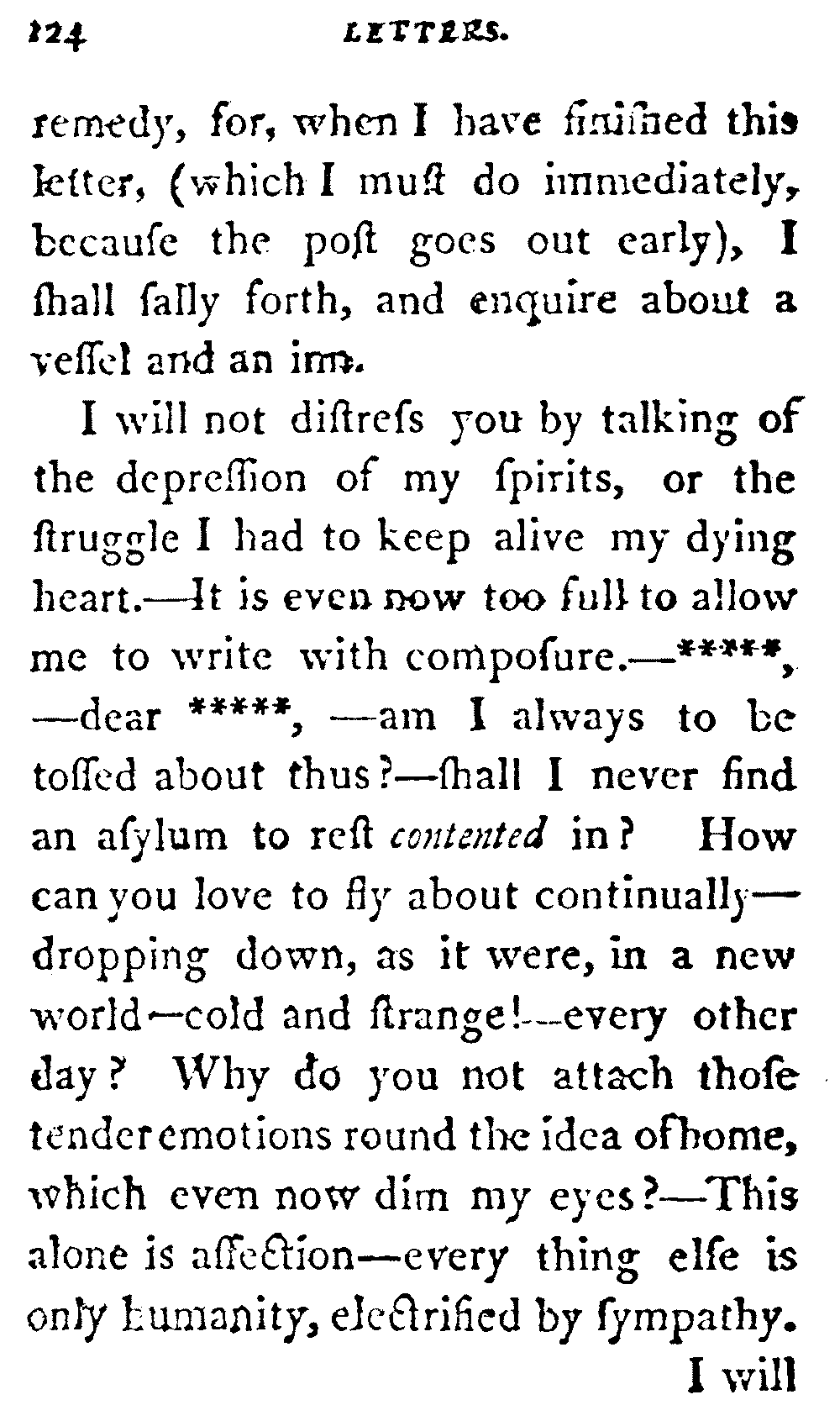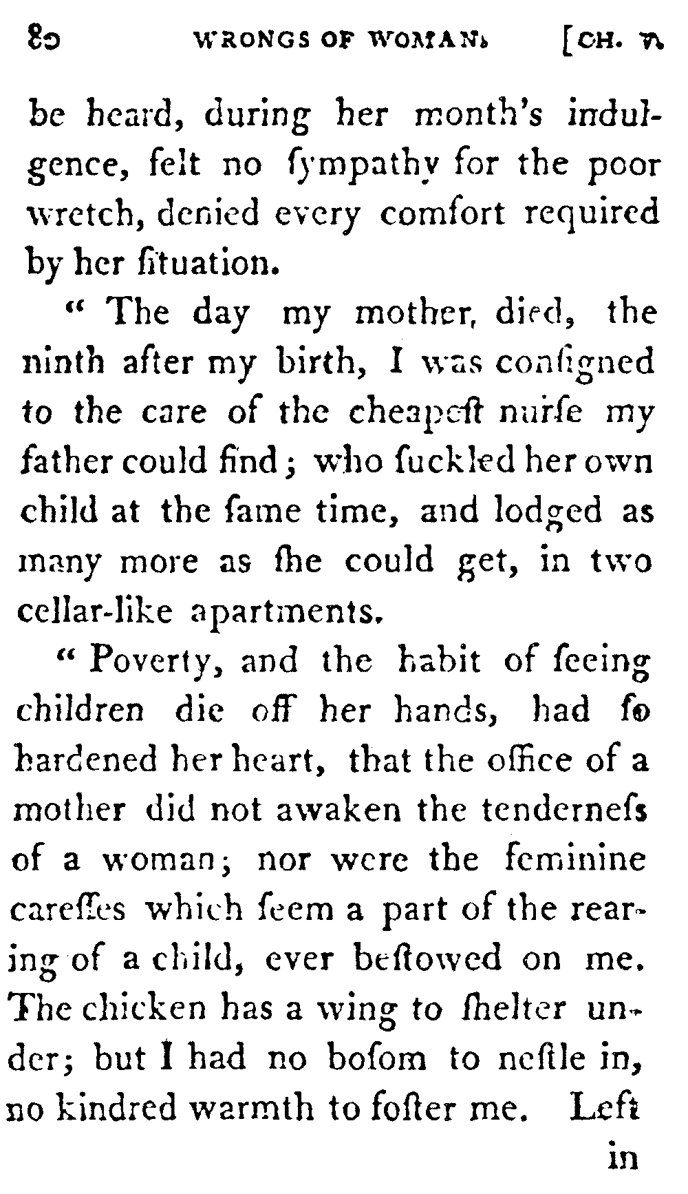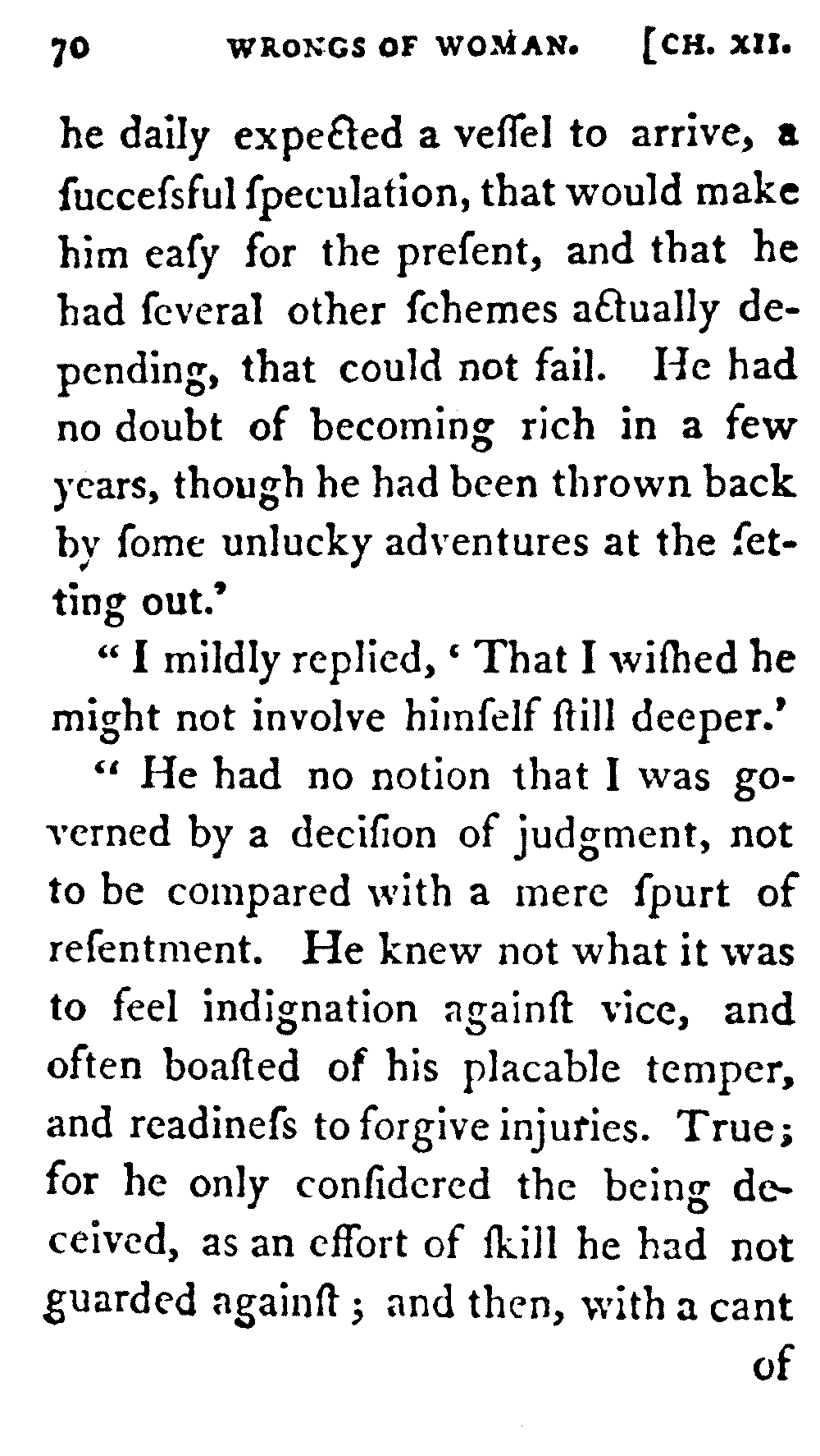 The retreating shadows of former sorrows rushed back in a gloomy train, and seemed to be pictured on the walls of her prison, magnified by the state of mind in which they were viewed—Still she mourned for her child, lamented she was a daughter, and anticipated the aggravated ills of life that her sex rendered almost inevitable, even while dreading she was no more. To think[4] that she was blotted out of existence was agony, when the imagination had been long employed to expand her faculties; yet to suppose her turned adrift on an unknown sea, was scarcely less afflicting.