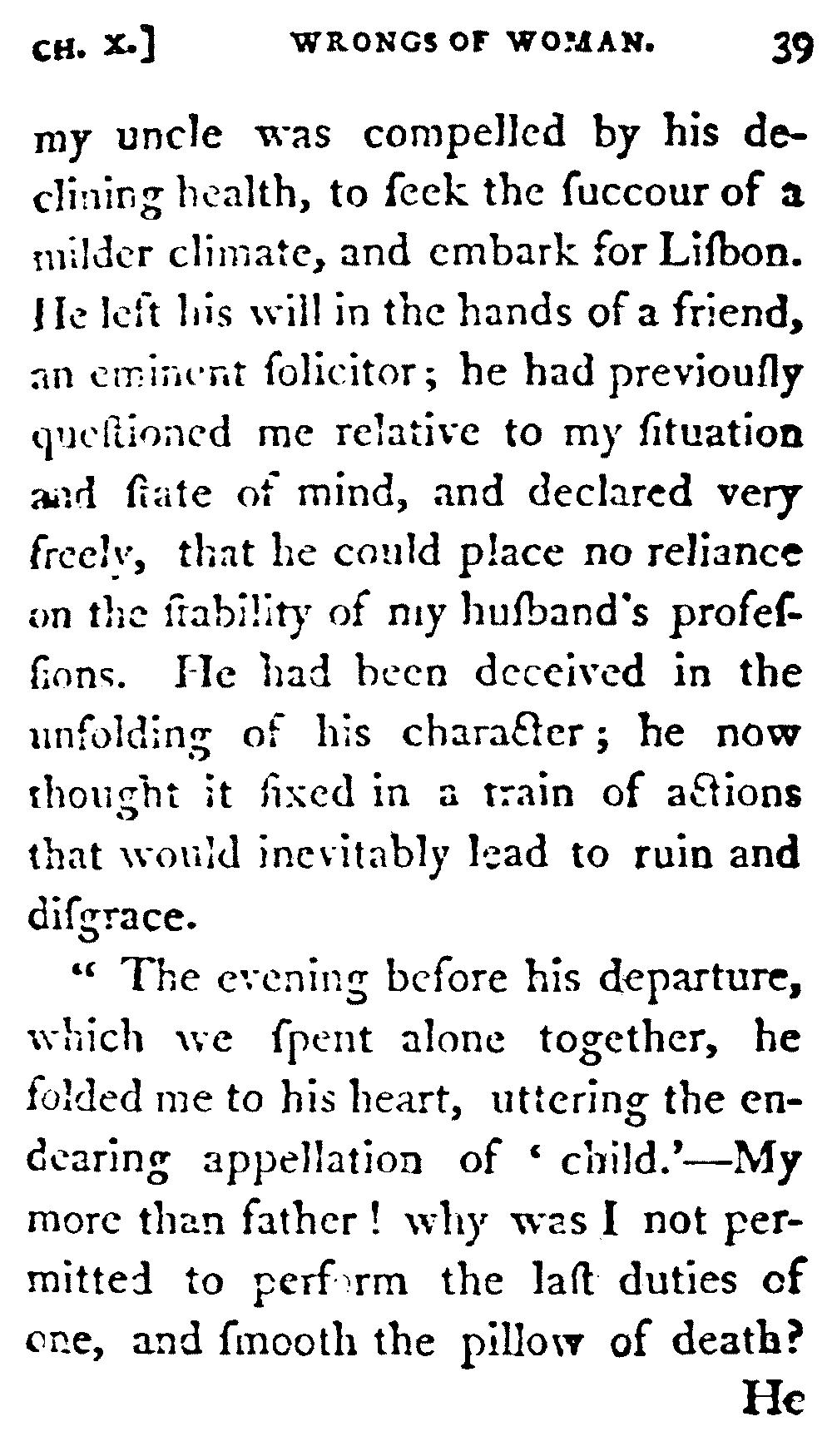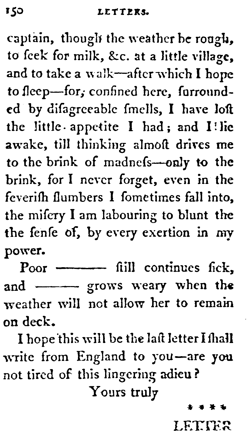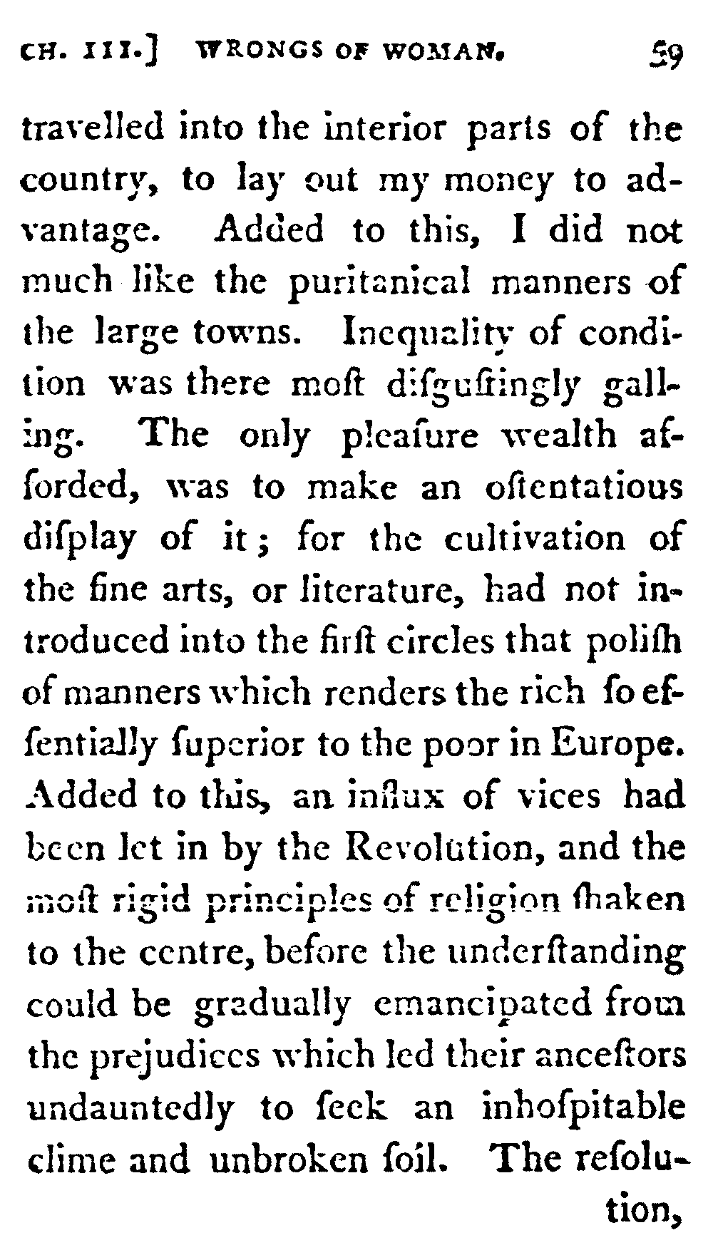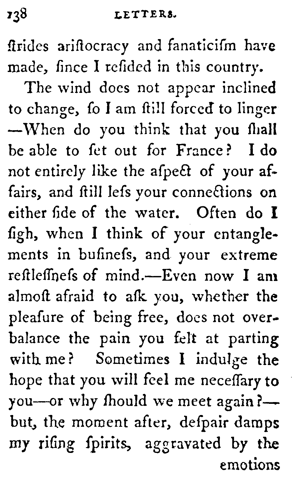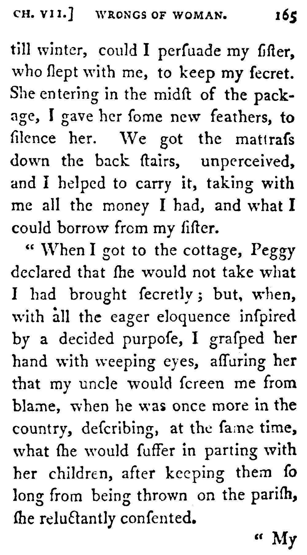 The retreating shadows of former sorrows rushed back in a gloomy train, and seemed to be pictured on the walls of her prison, magnified by the state of mind in which they were viewed—Still she mourned for her child, lamented she was a daughter, and anticipated the aggravated ills of life that her sex rendered almost inevitable, even while dreading she was no more. To think[4] that she was blotted out of existence was agony, when the imagination had been long employed to expand her faculties; yet to suppose her turned adrift on an unknown sea, was scarcely less afflicting.