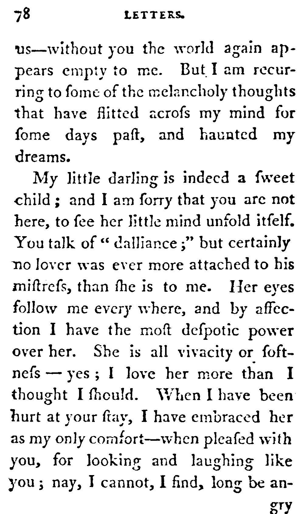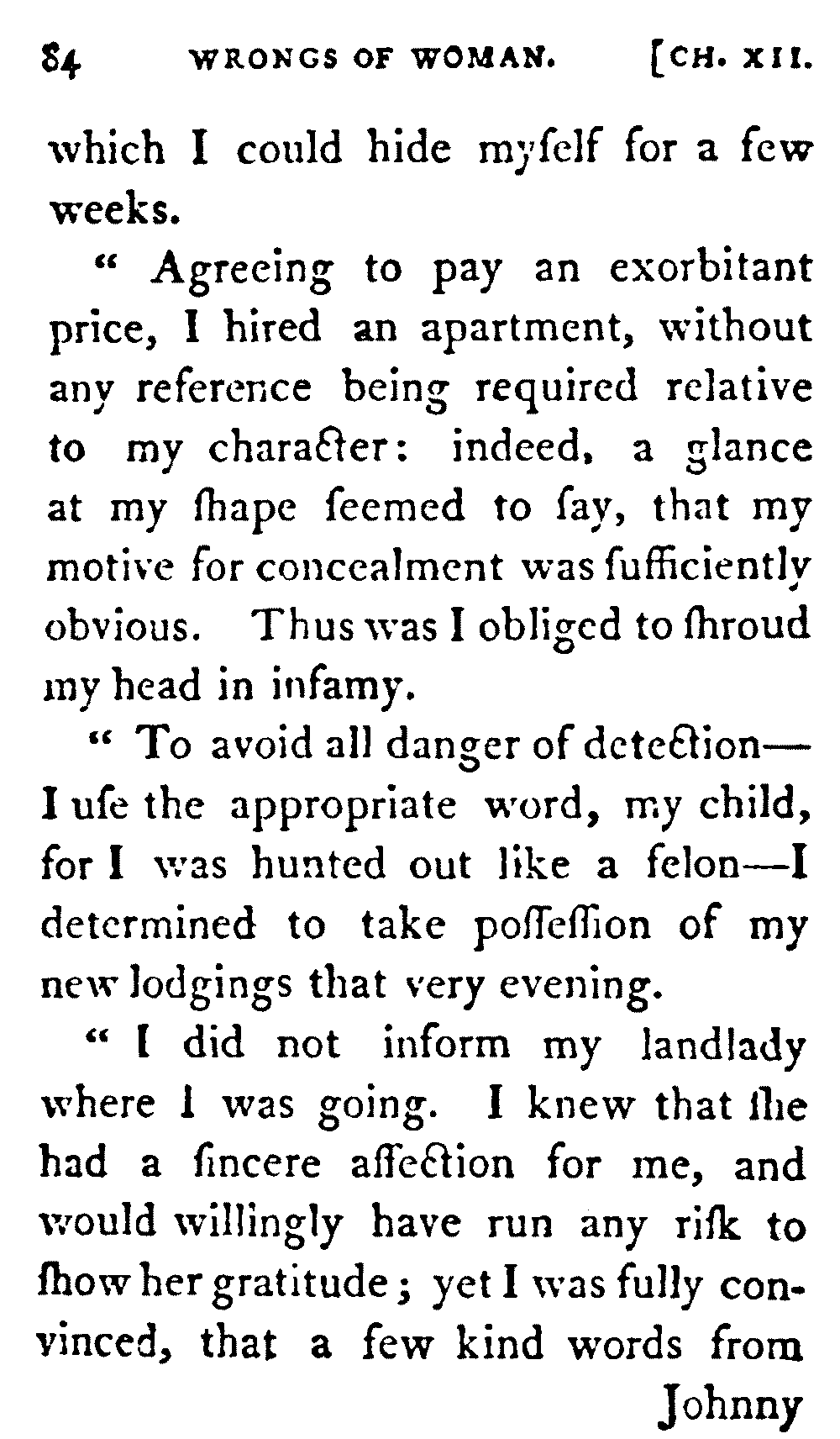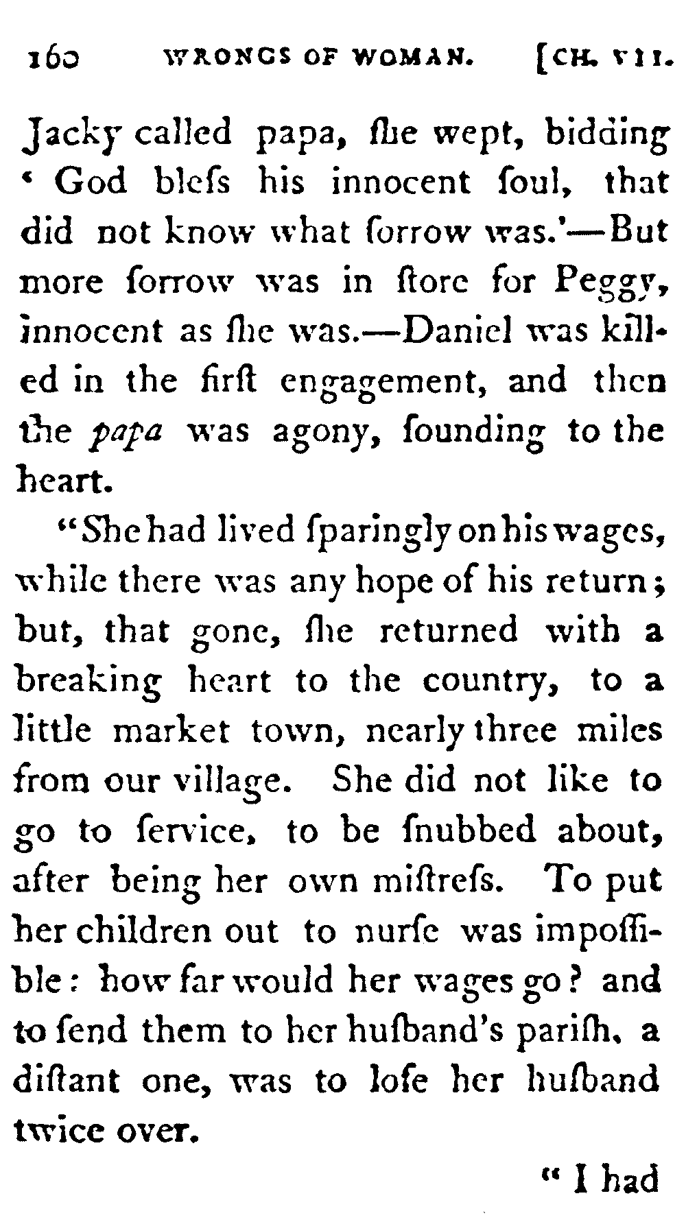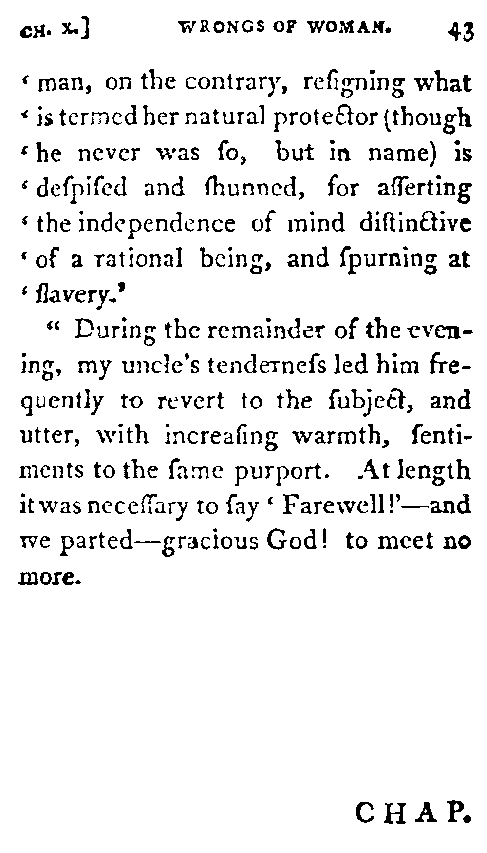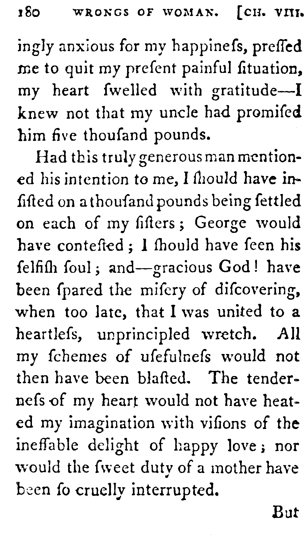 The retreating shadows of former sorrows rushed back in a gloomy train, and seemed to be pictured on the walls of her prison, magnified by the state of mind in which they were viewed—Still she mourned for her child, lamented she was a daughter, and anticipated the aggravated ills of life that her sex rendered almost inevitable, even while dreading she was no more. To think[4] that she was blotted out of existence was agony, when the imagination had been long employed to expand her faculties; yet to suppose her turned adrift on an unknown sea, was scarcely less afflicting.