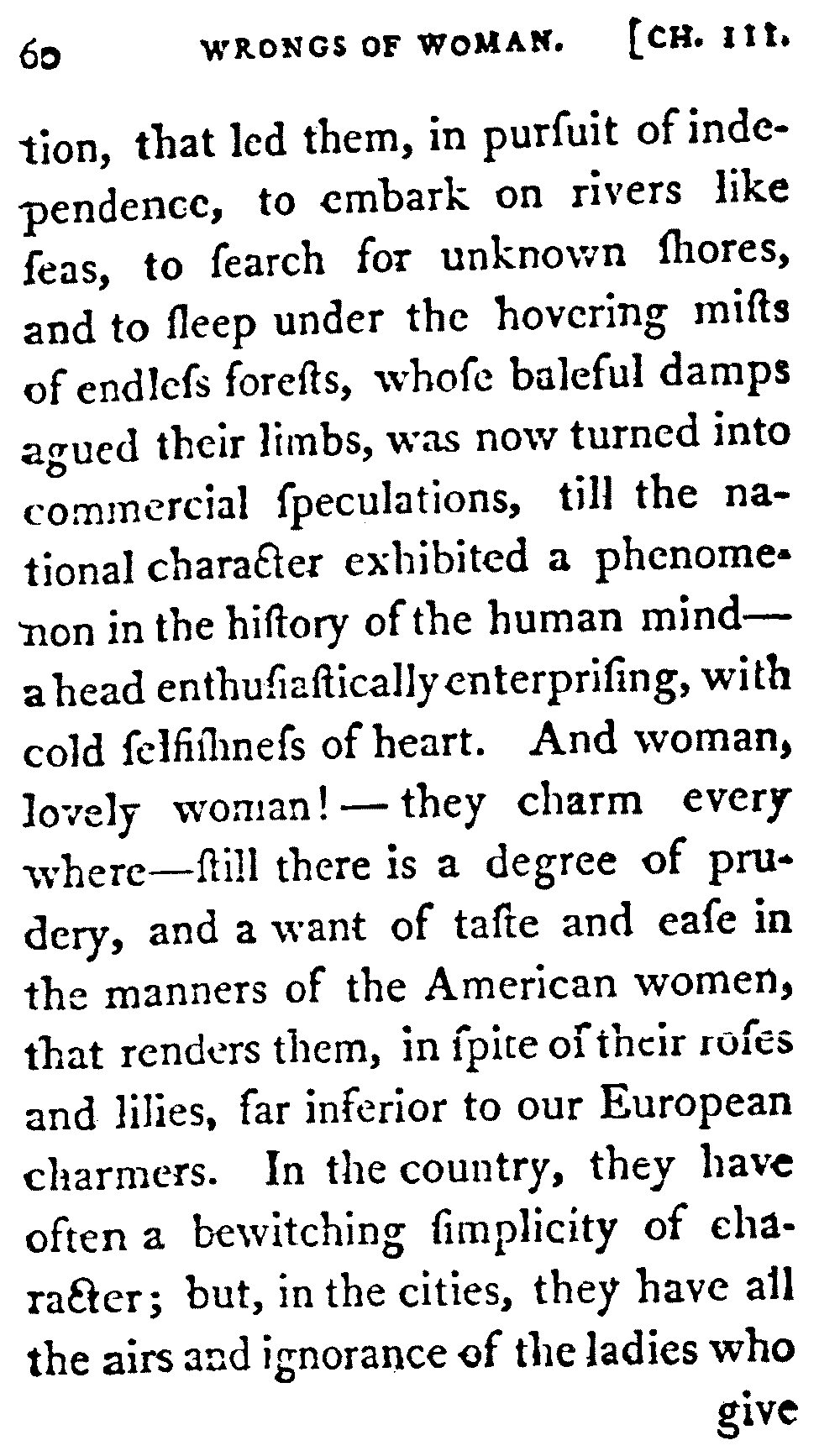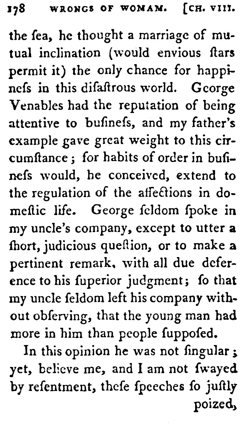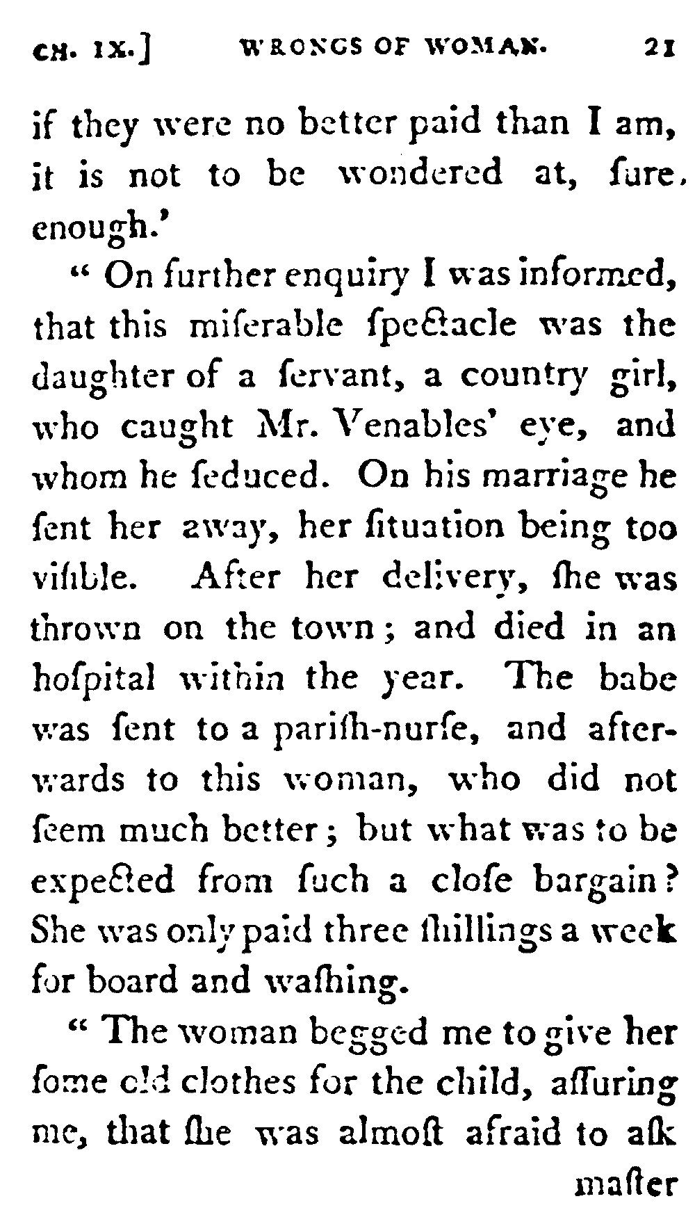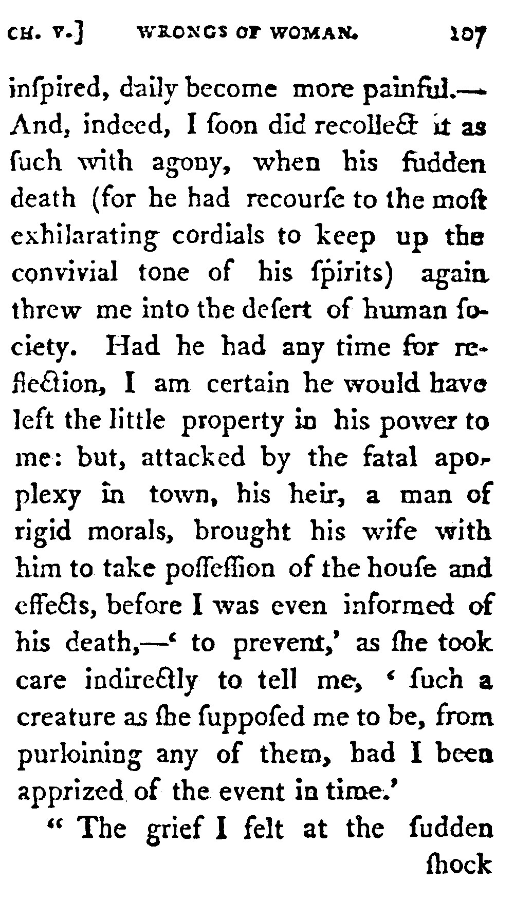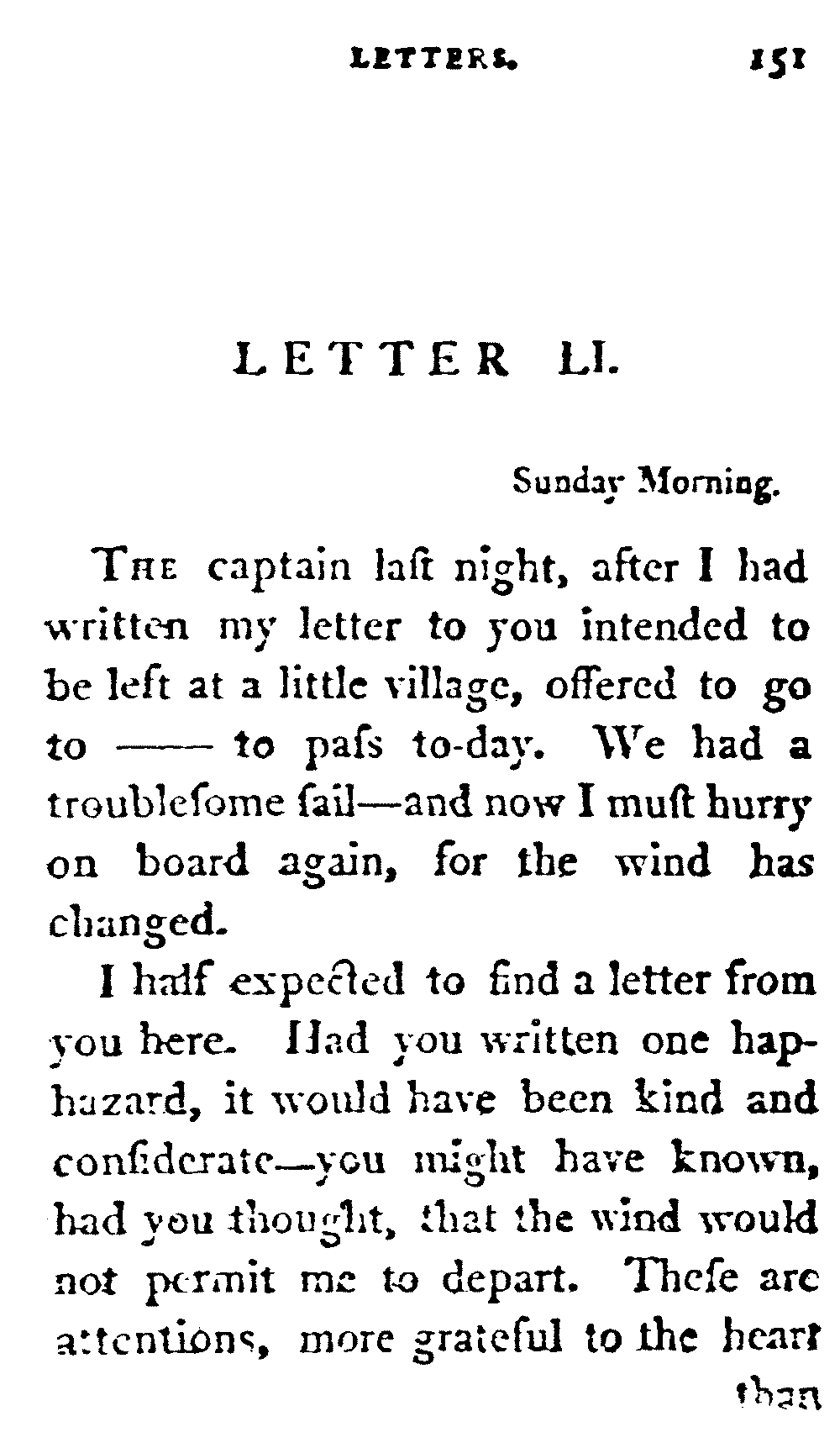 The retreating shadows of former sorrows rushed back in a gloomy train, and seemed to be pictured on the walls of her prison, magnified by the state of mind in which they were viewed—Still she mourned for her child, lamented she was a daughter, and anticipated the aggravated ills of life that her sex rendered almost inevitable, even while dreading she was no more. To think[4] that she was blotted out of existence was agony, when the imagination had been long employed to expand her faculties; yet to suppose her turned adrift on an unknown sea, was scarcely less afflicting.