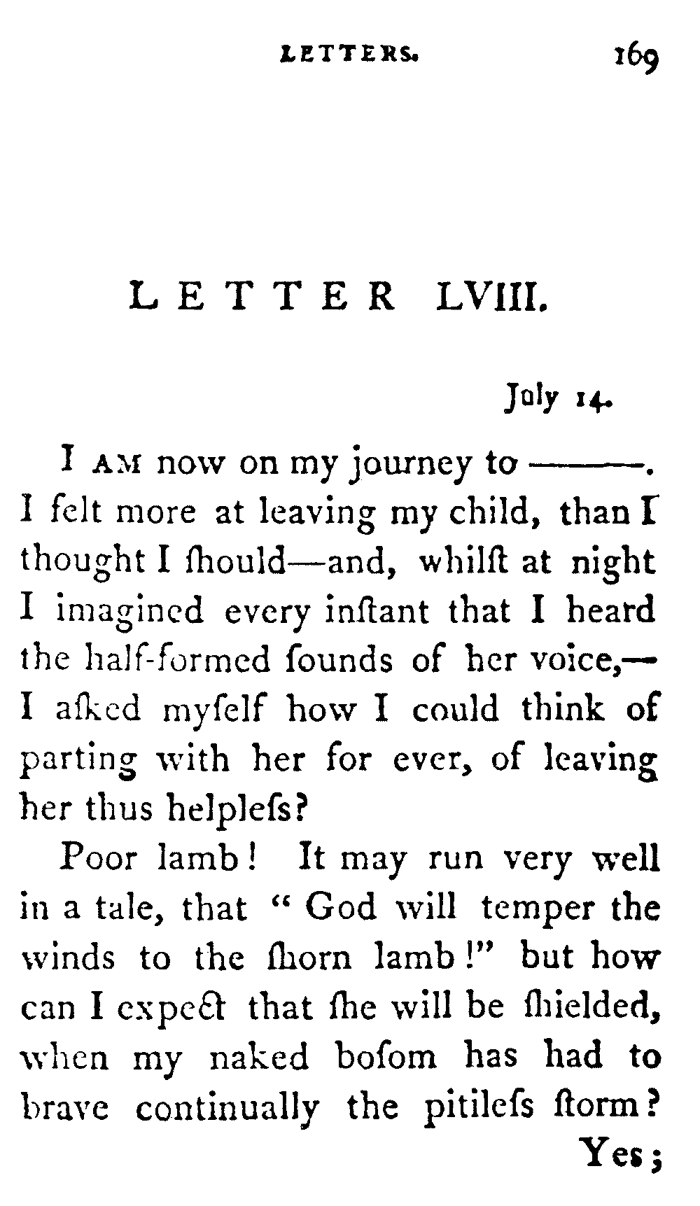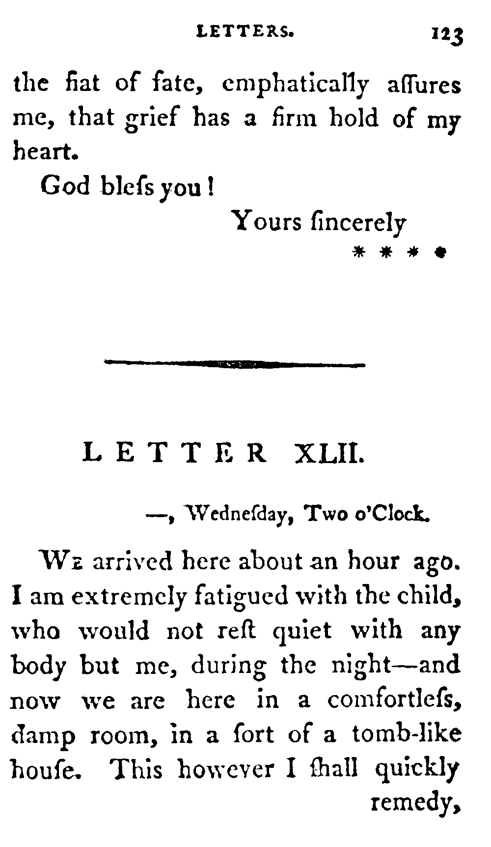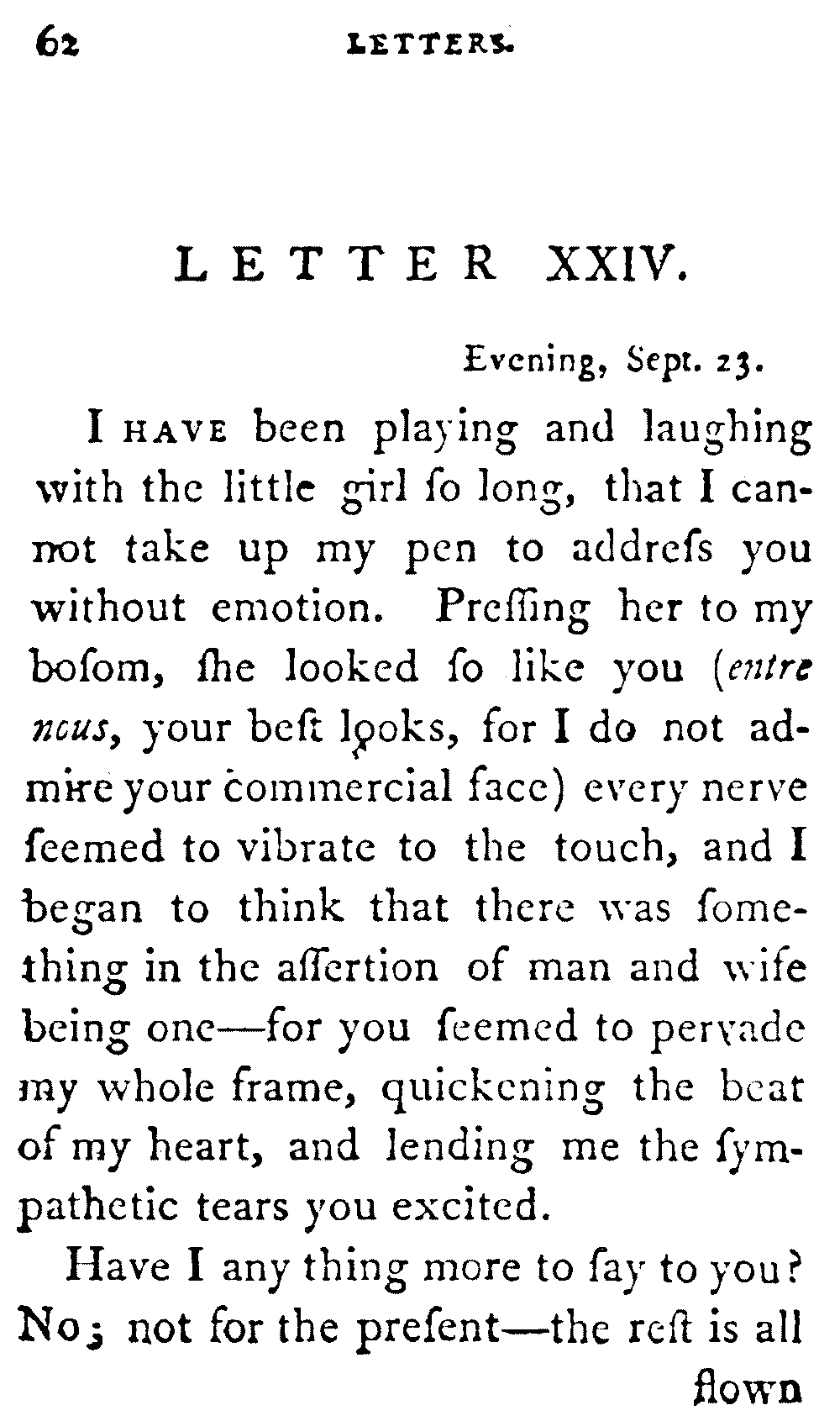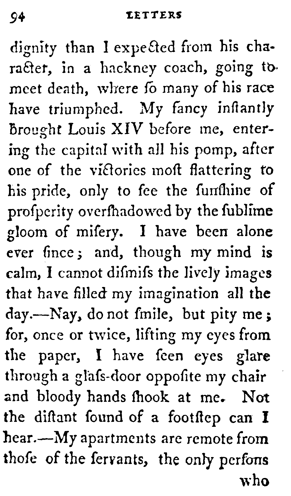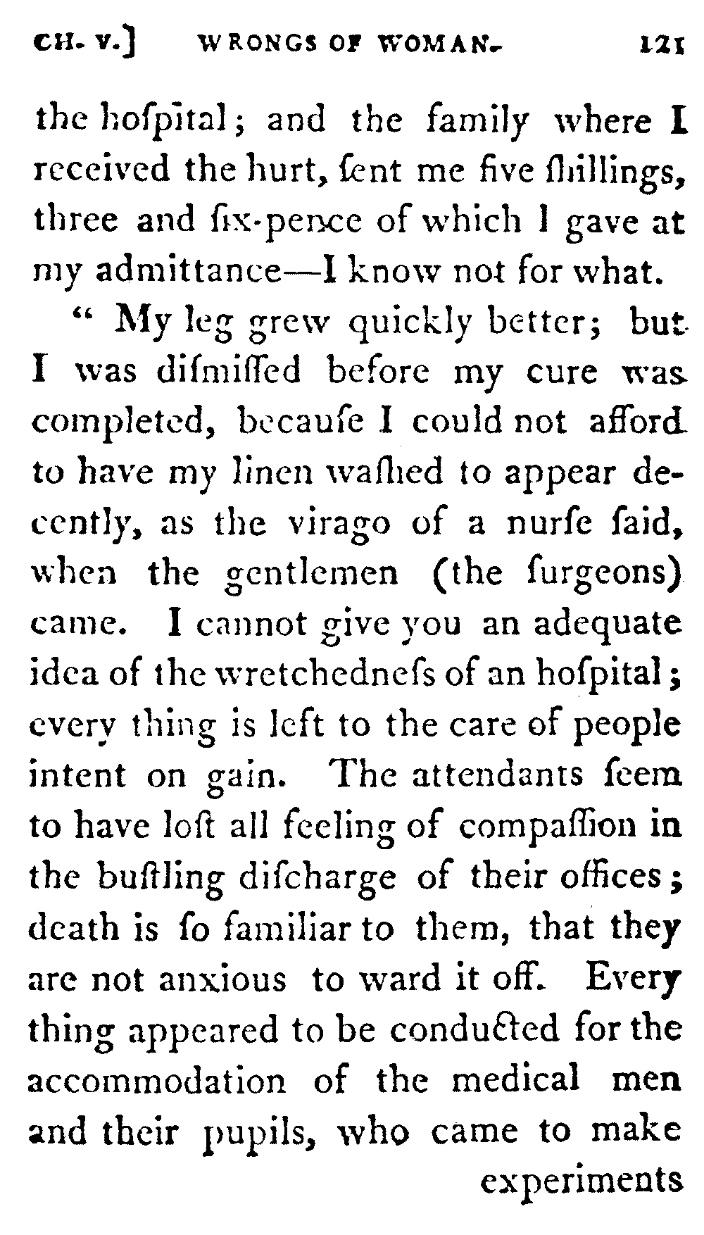 The retreating shadows of former sorrows rushed back in a gloomy train, and seemed to be pictured on the walls of her prison, magnified by the state of mind in which they were viewed—Still she mourned for her child, lamented she was a daughter, and anticipated the aggravated ills of life that her sex rendered almost inevitable, even while dreading she was no more. To think[4] that she was blotted out of existence was agony, when the imagination had been long employed to expand her faculties; yet to suppose her turned adrift on an unknown sea, was scarcely less afflicting.