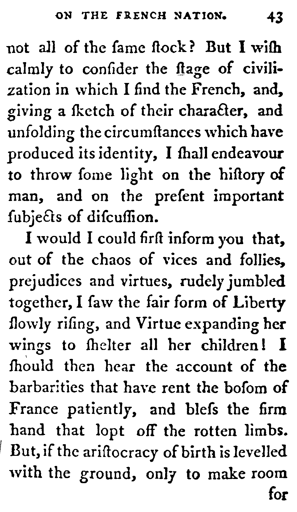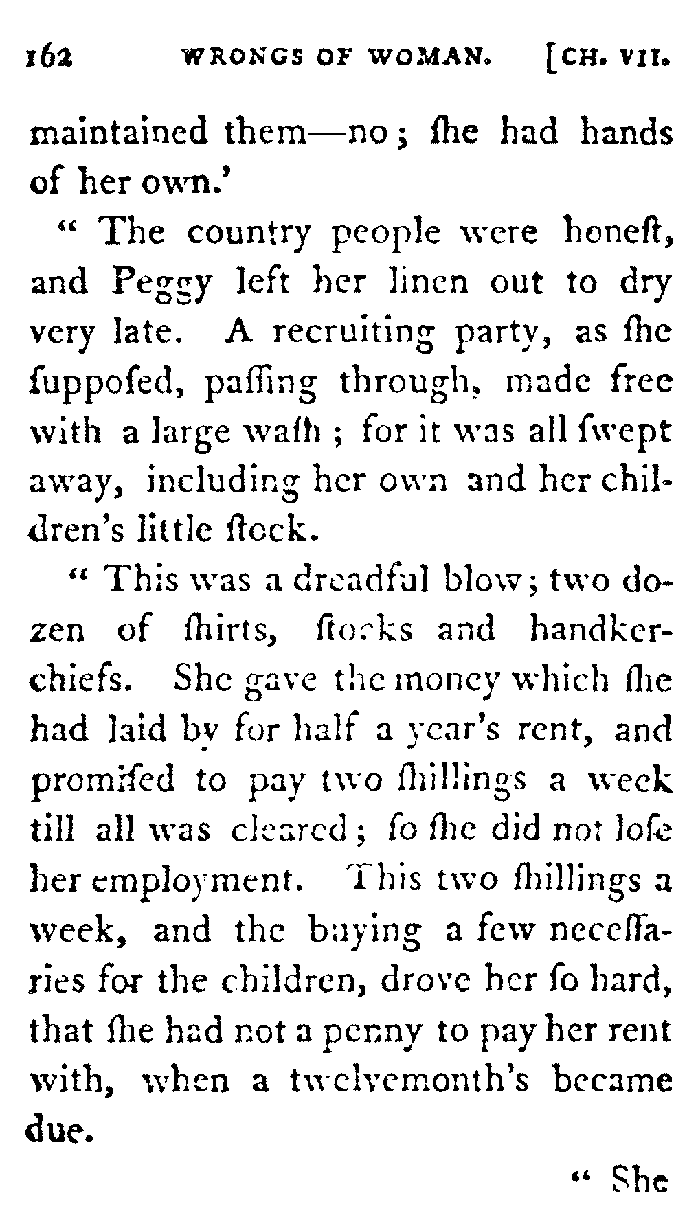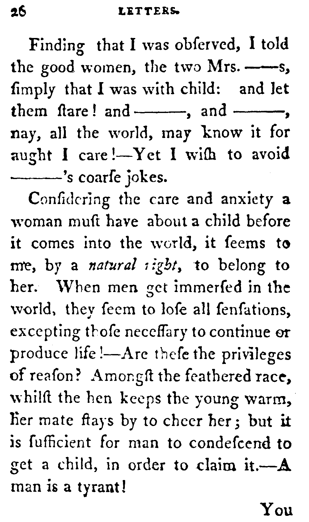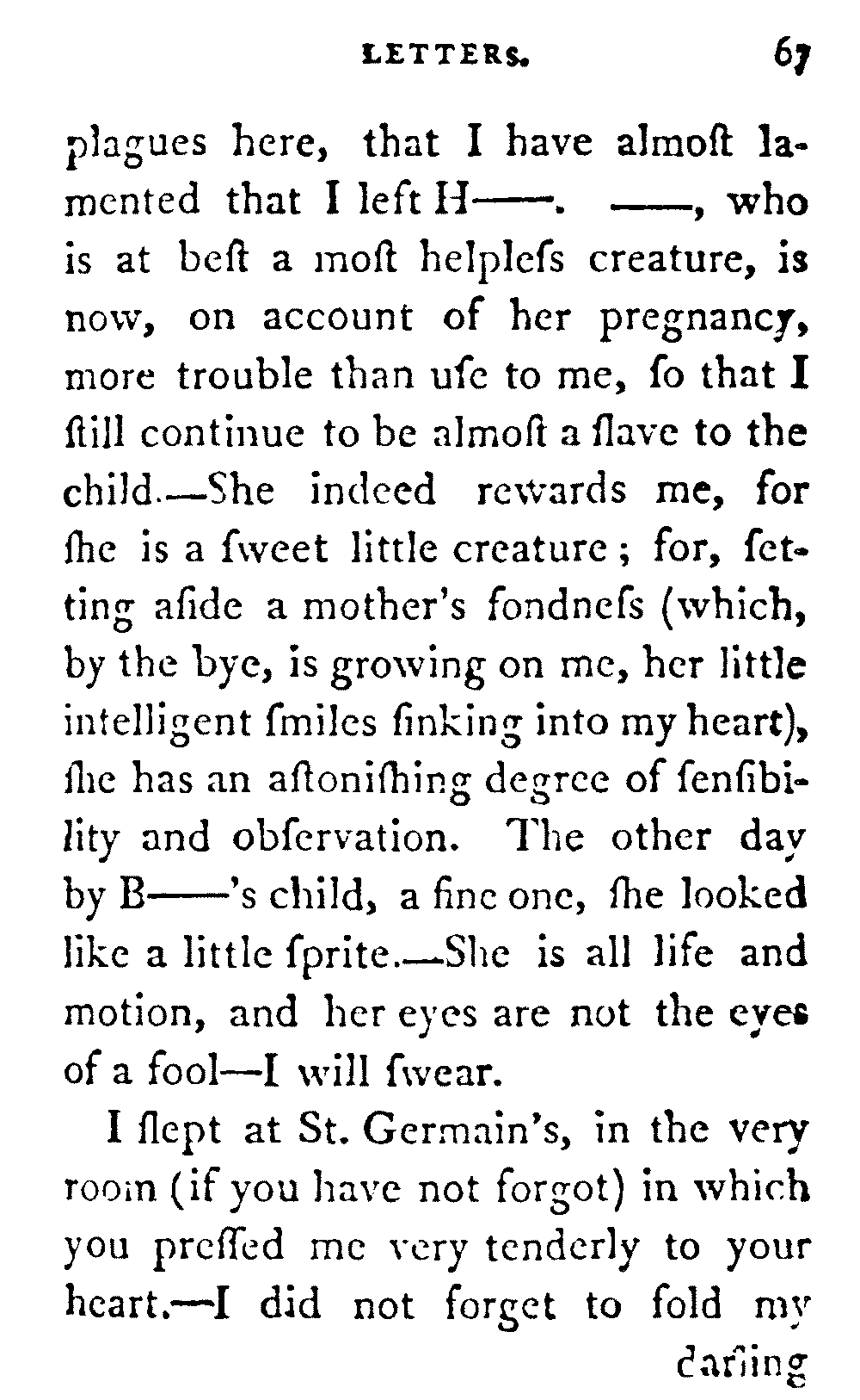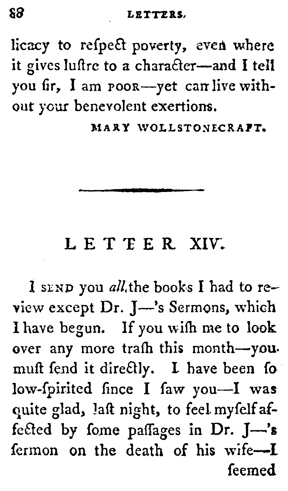 The retreating shadows of former sorrows rushed back in a gloomy train, and seemed to be pictured on the walls of her prison, magnified by the state of mind in which they were viewed—Still she mourned for her child, lamented she was a daughter, and anticipated the aggravated ills of life that her sex rendered almost inevitable, even while dreading she was no more. To think[4] that she was blotted out of existence was agony, when the imagination had been long employed to expand her faculties; yet to suppose her turned adrift on an unknown sea, was scarcely less afflicting.
