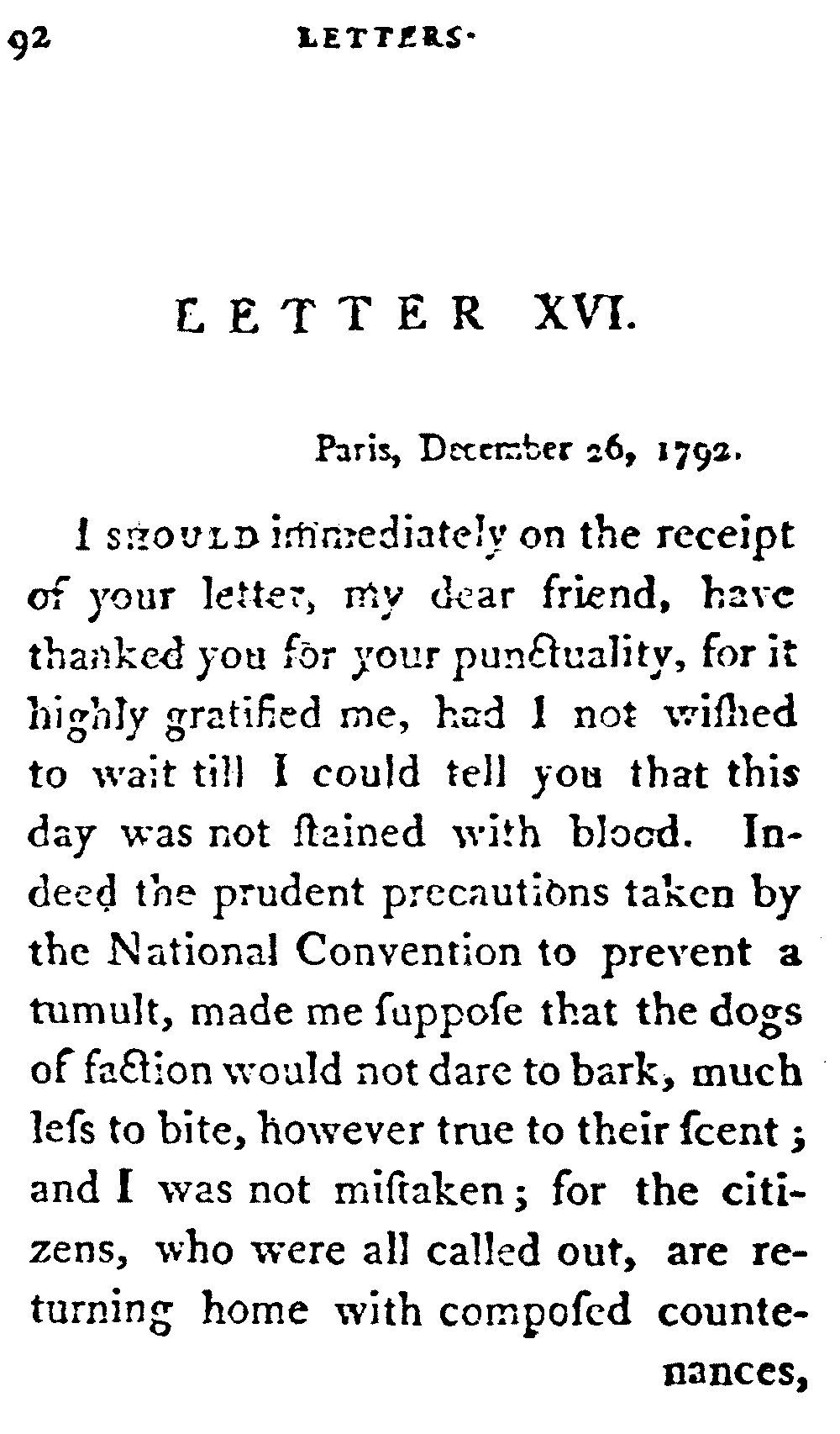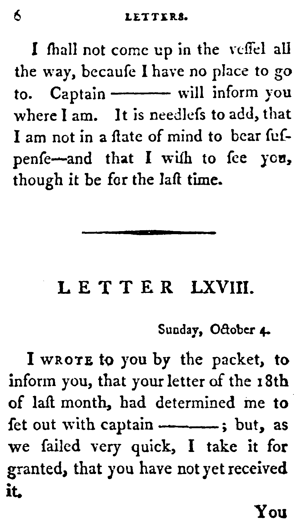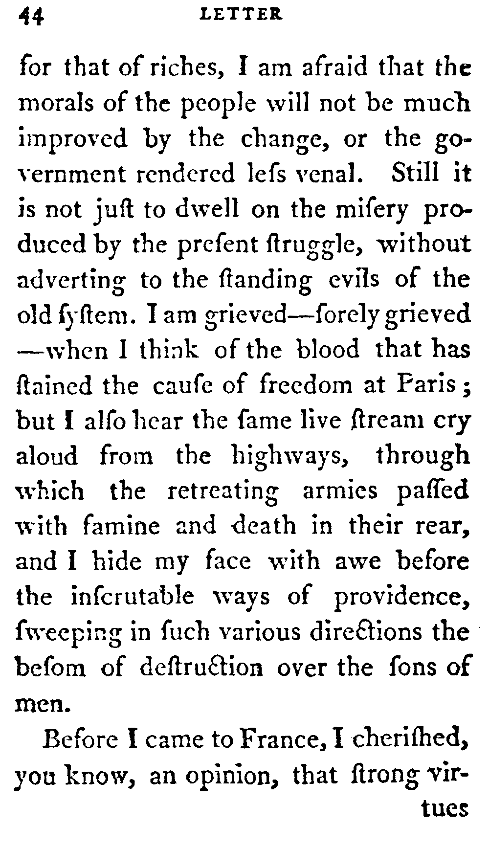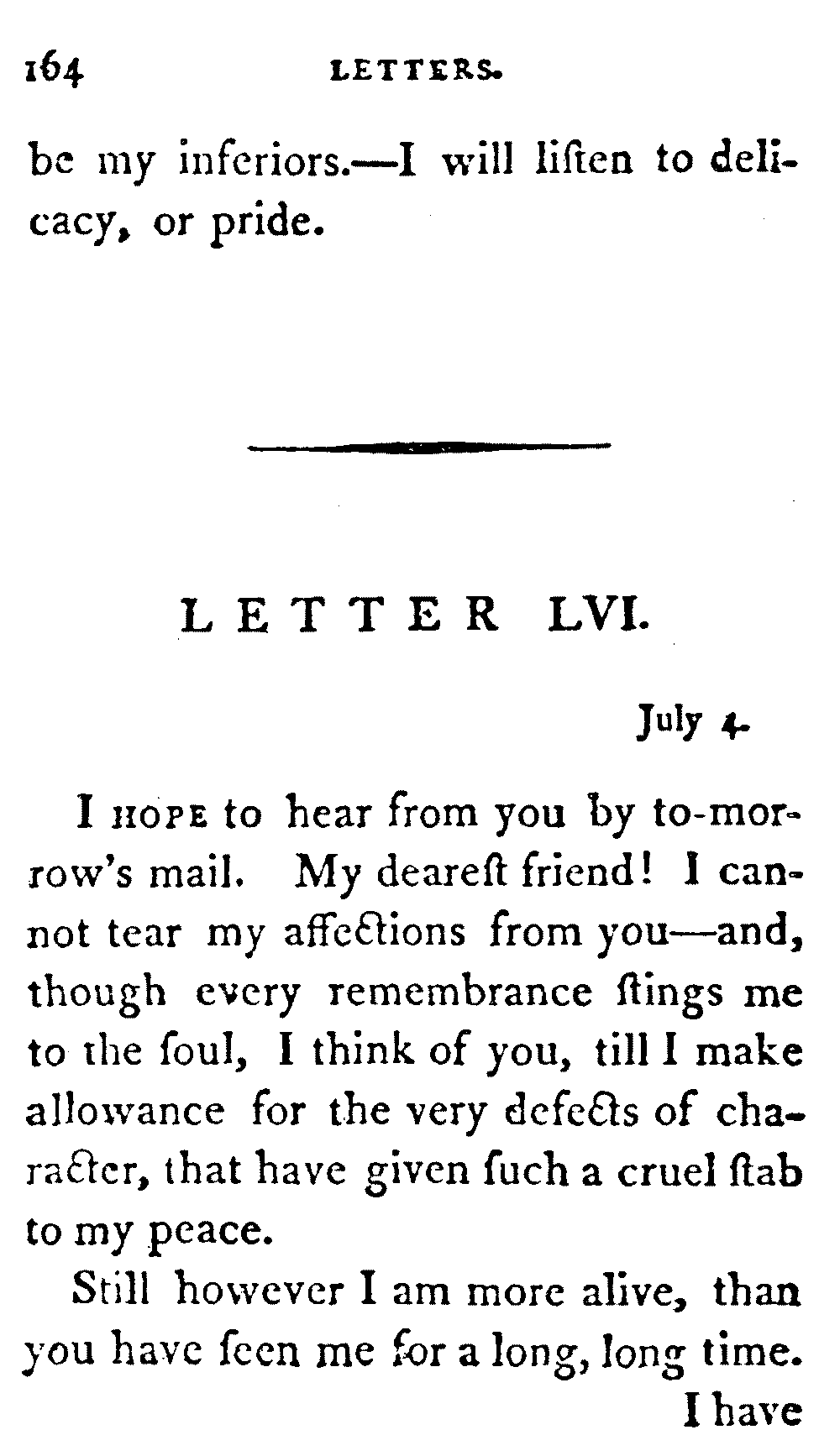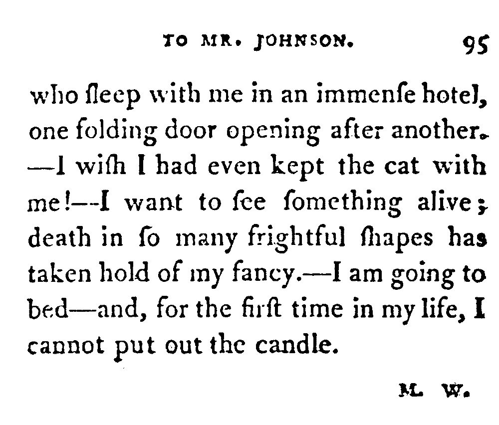 The retreating shadows of former sorrows rushed back in a gloomy train, and seemed to be pictured on the walls of her prison, magnified by the state of mind in which they were viewed—Still she mourned for her child, lamented she was a daughter, and anticipated the aggravated ills of life that her sex rendered almost inevitable, even while dreading she was no more. To think[4] that she was blotted out of existence was agony, when the imagination had been long employed to expand her faculties; yet to suppose her turned adrift on an unknown sea, was scarcely less afflicting.