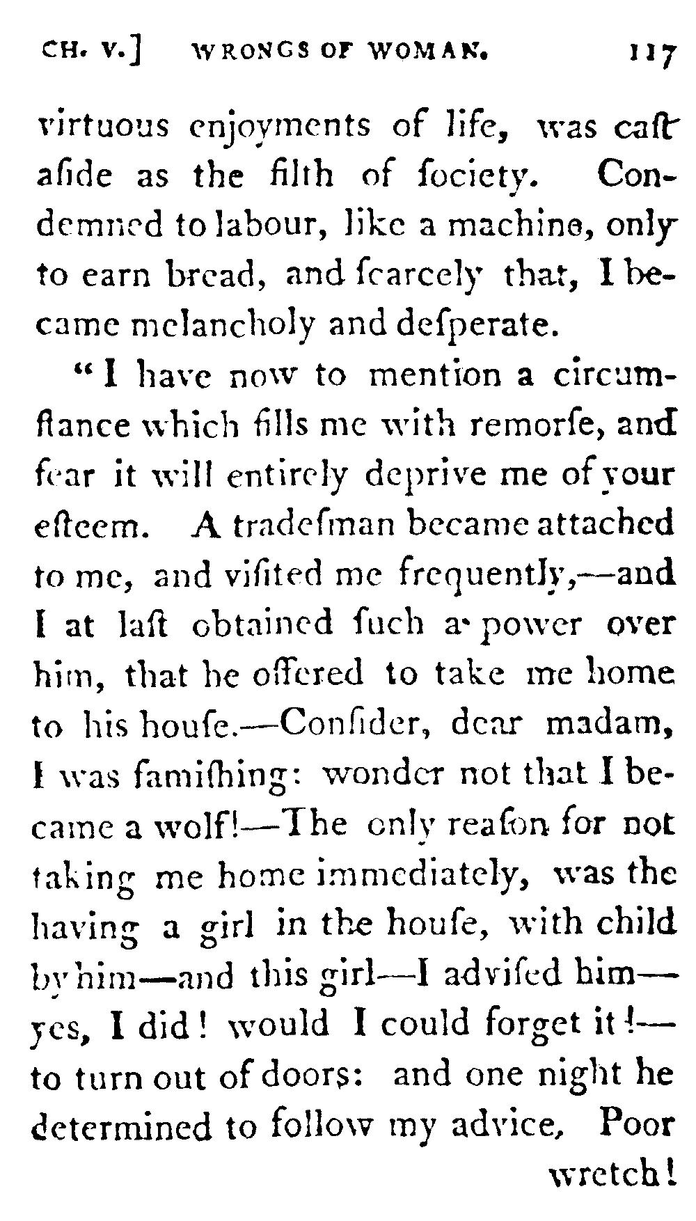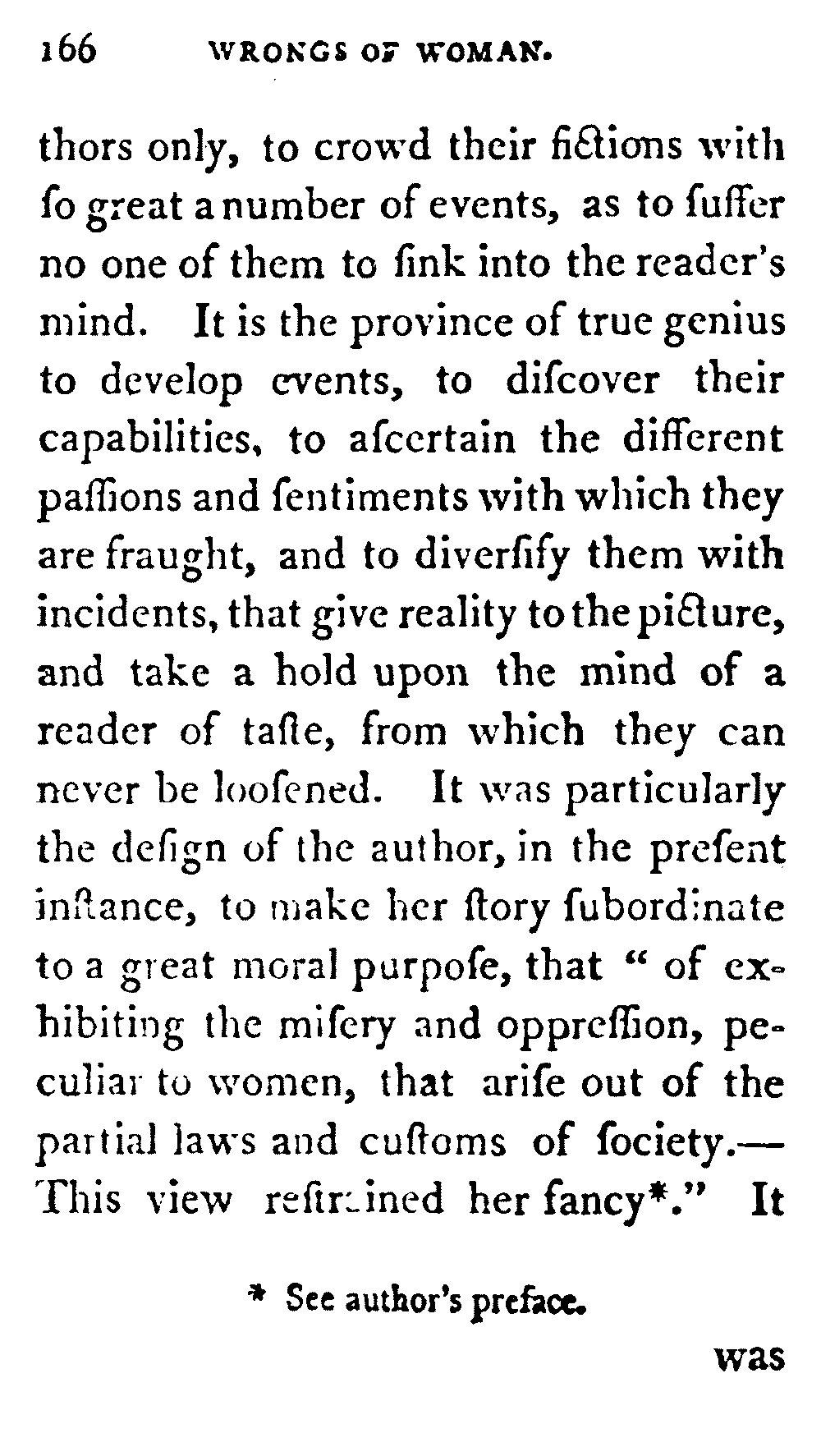 In many instances I could have made the incidents more dramatic, would I have sacrificed my main object, the desire of exhibiting the misery and oppression, peculiar to women, that arise out of the partial laws and customs of society.