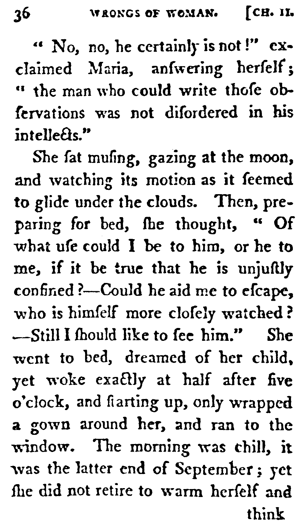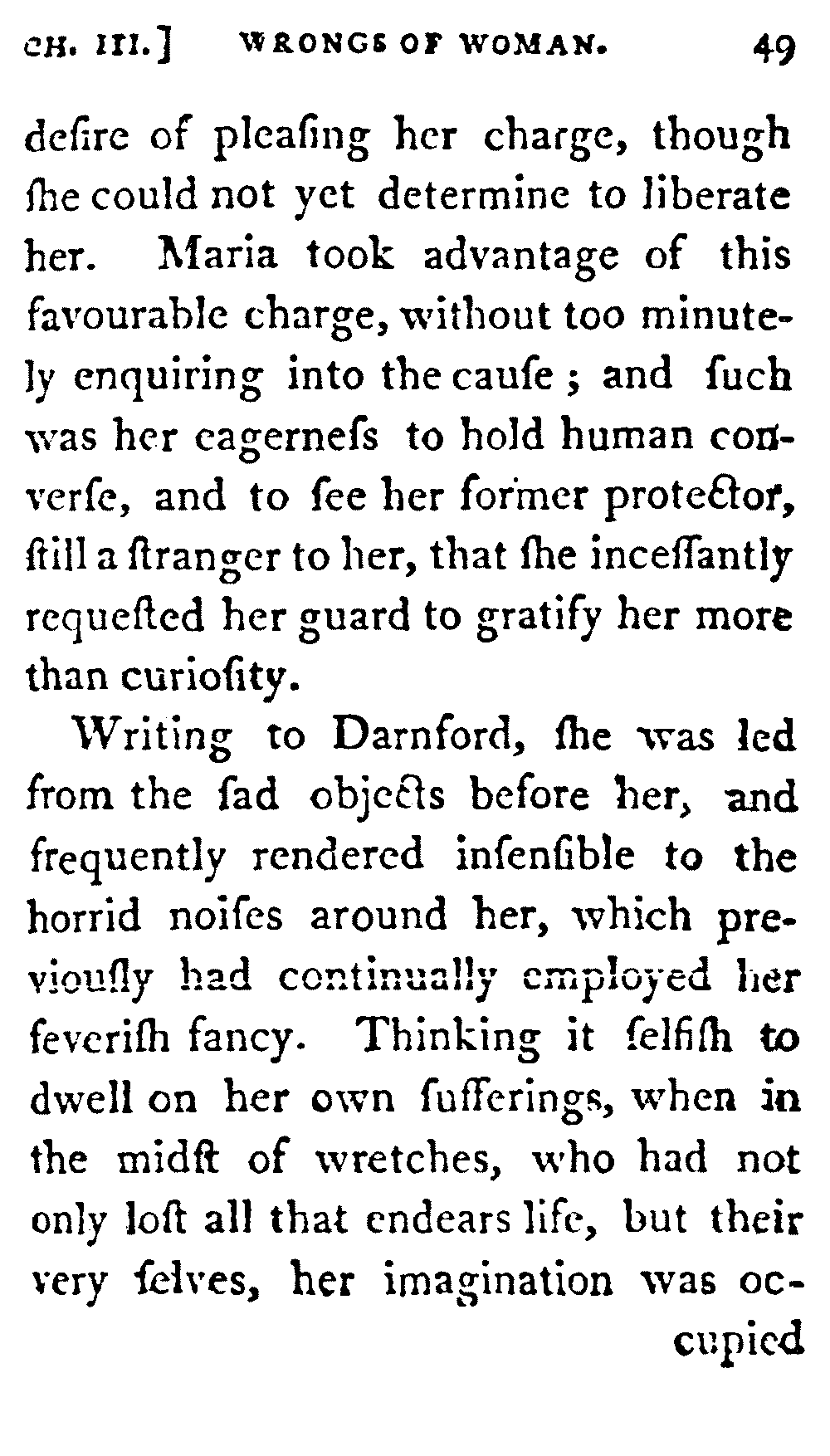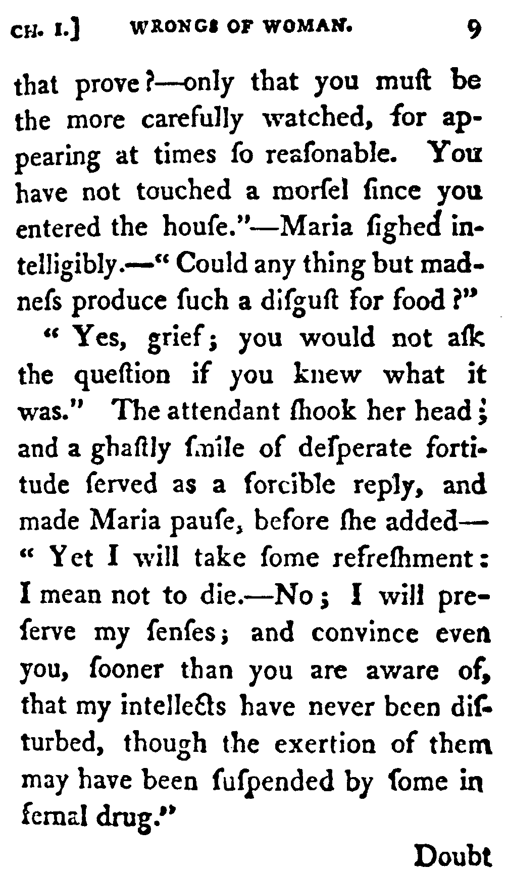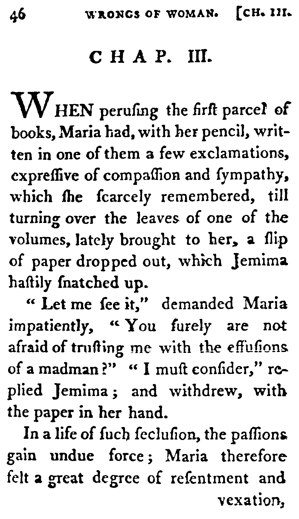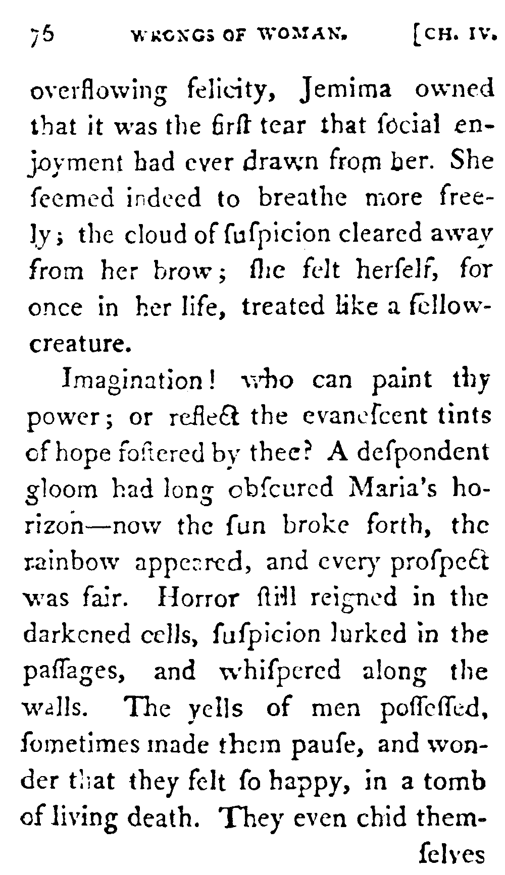 Maria took up the books with emotion. "They come," said she, "perhaps, from a wretch condemned, like me, to reason on the nature of madness, by having wrecked minds continually under his eye; and almost to wish himself—as I do—mad, to escape from the contemplation of it." Her heart throbbed with sympathetic alarm; and she turned over the leaves with awe, as if they had become sacred from passing through the hands of an unfortunate being, oppressed by a similar fate.