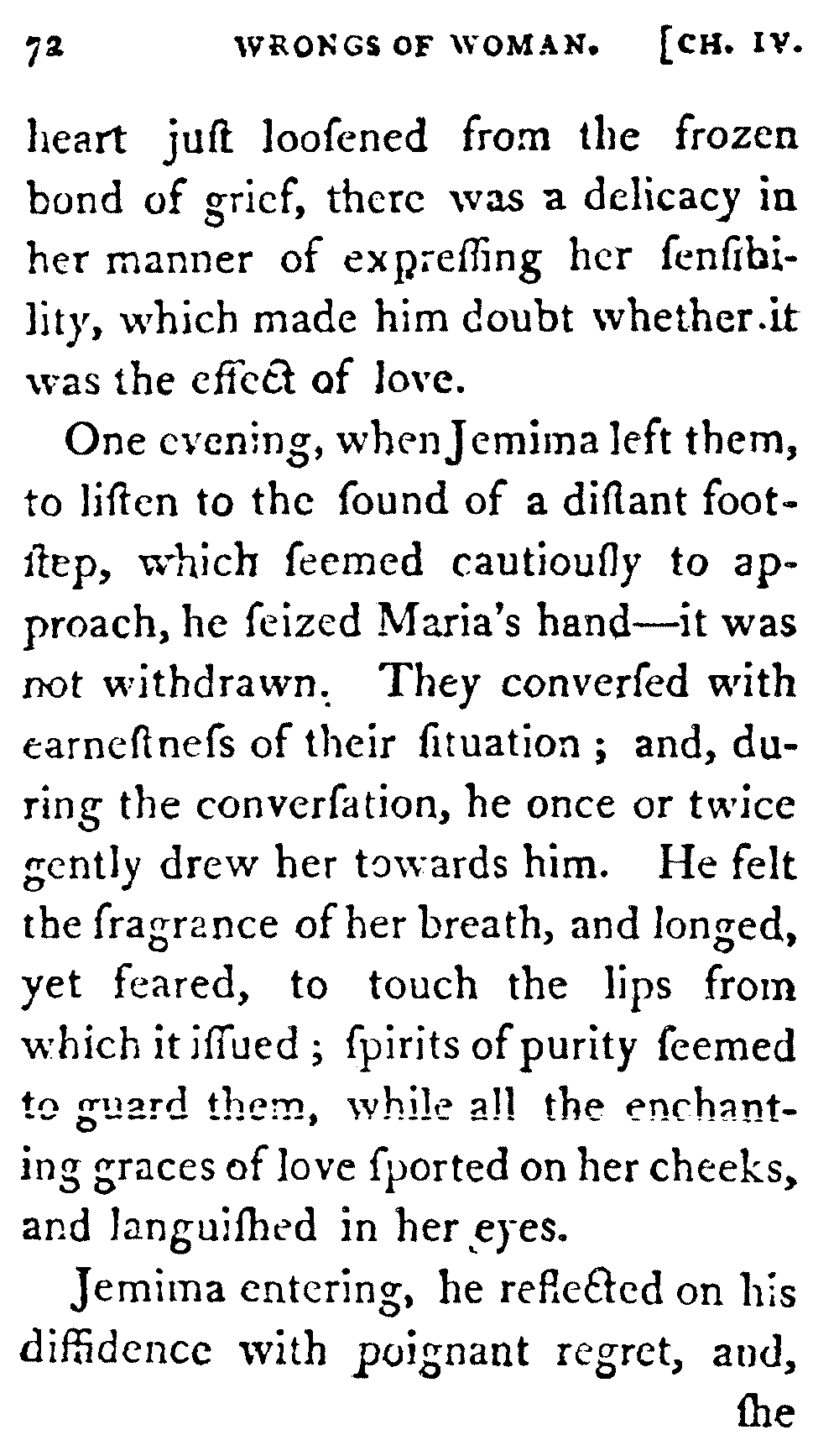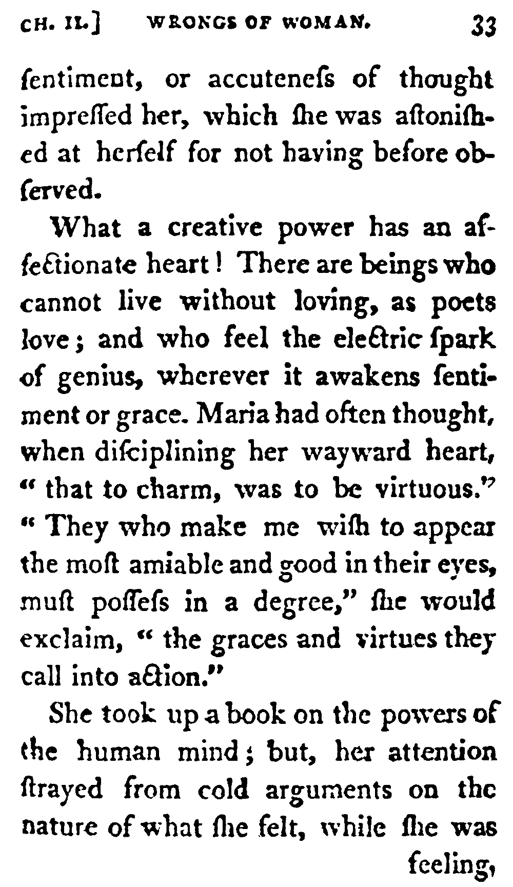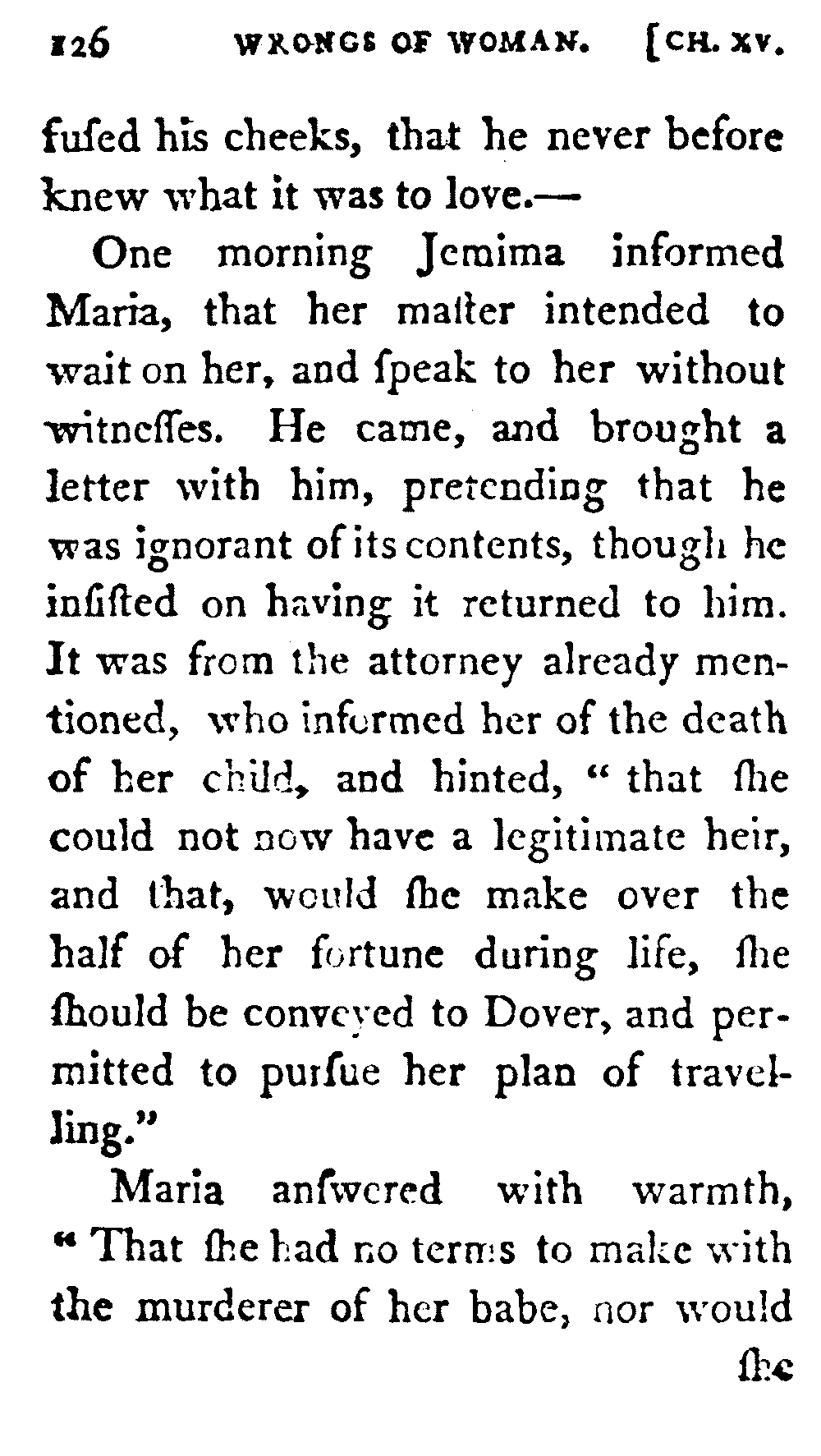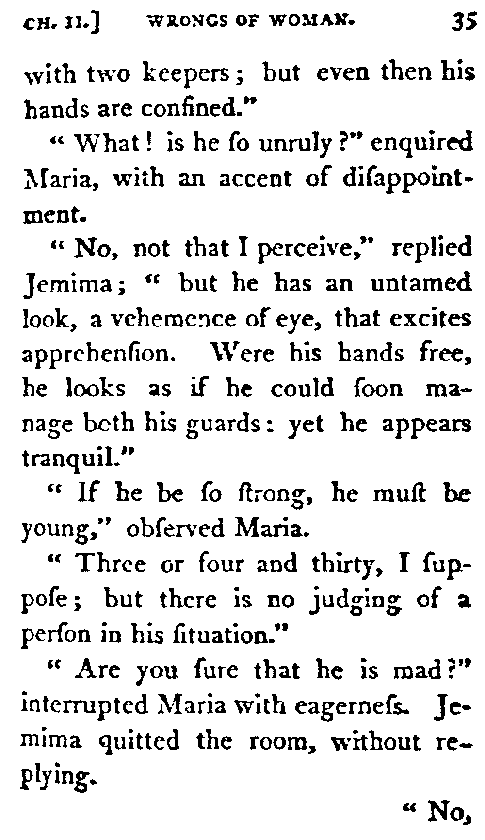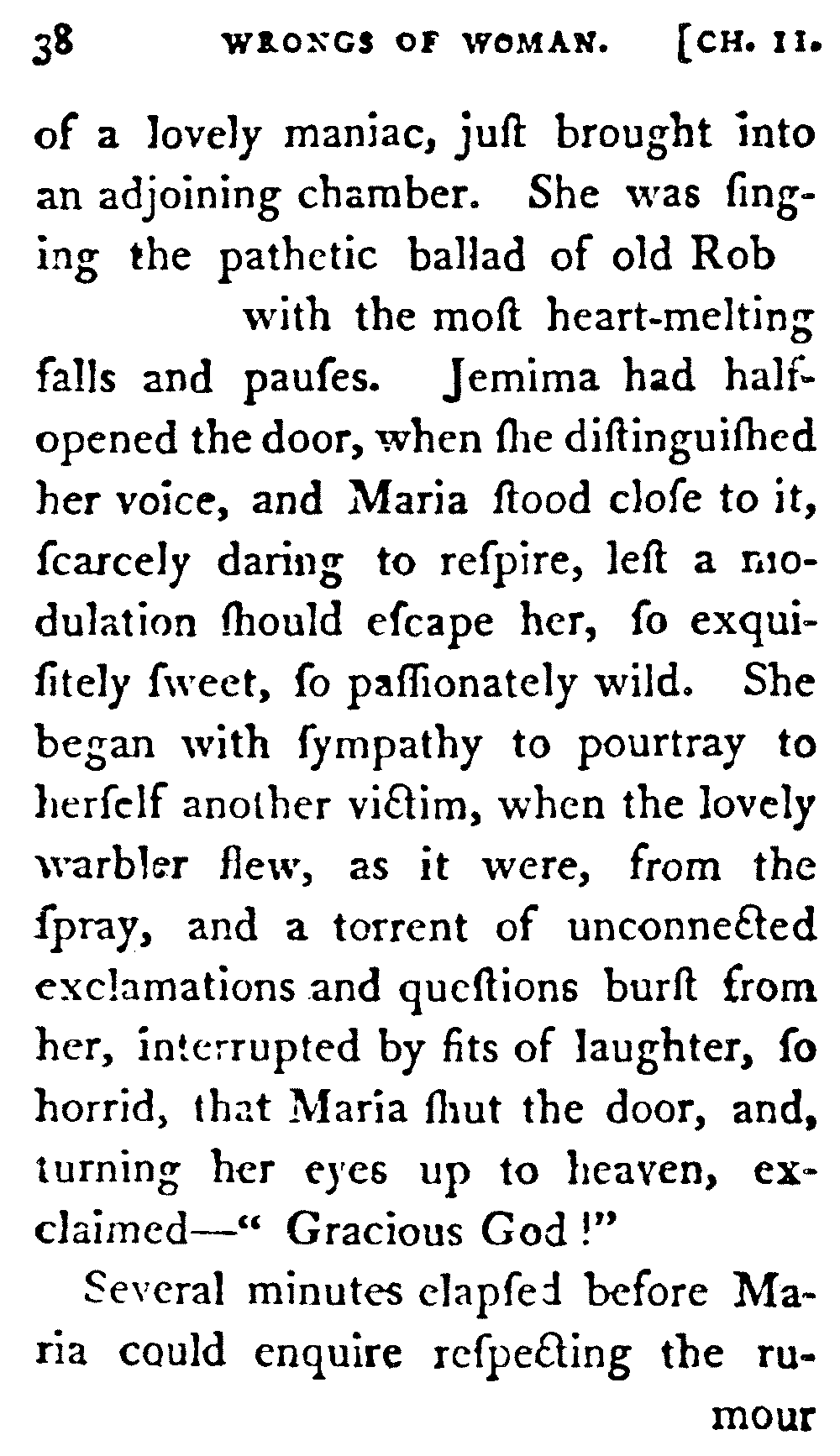 Maria took up the books with emotion. "They come," said she, "perhaps, from a wretch condemned, like me, to reason on the nature of madness, by having wrecked minds continually under his eye; and almost to wish himself—as I do—mad, to escape from the contemplation of it." Her heart throbbed with sympathetic alarm; and she turned over the leaves with awe, as if they had become sacred from passing through the hands of an unfortunate being, oppressed by a similar fate.
