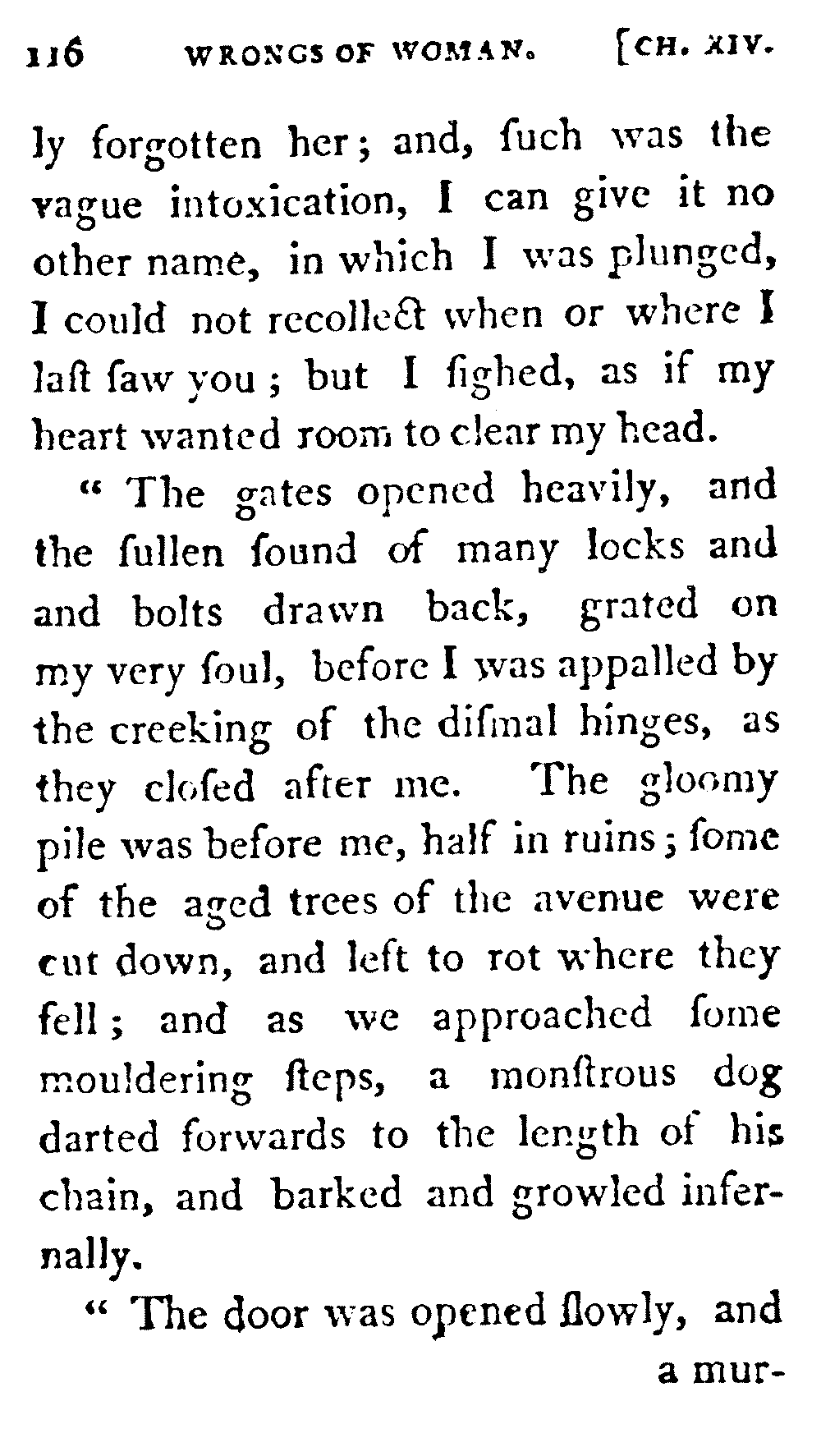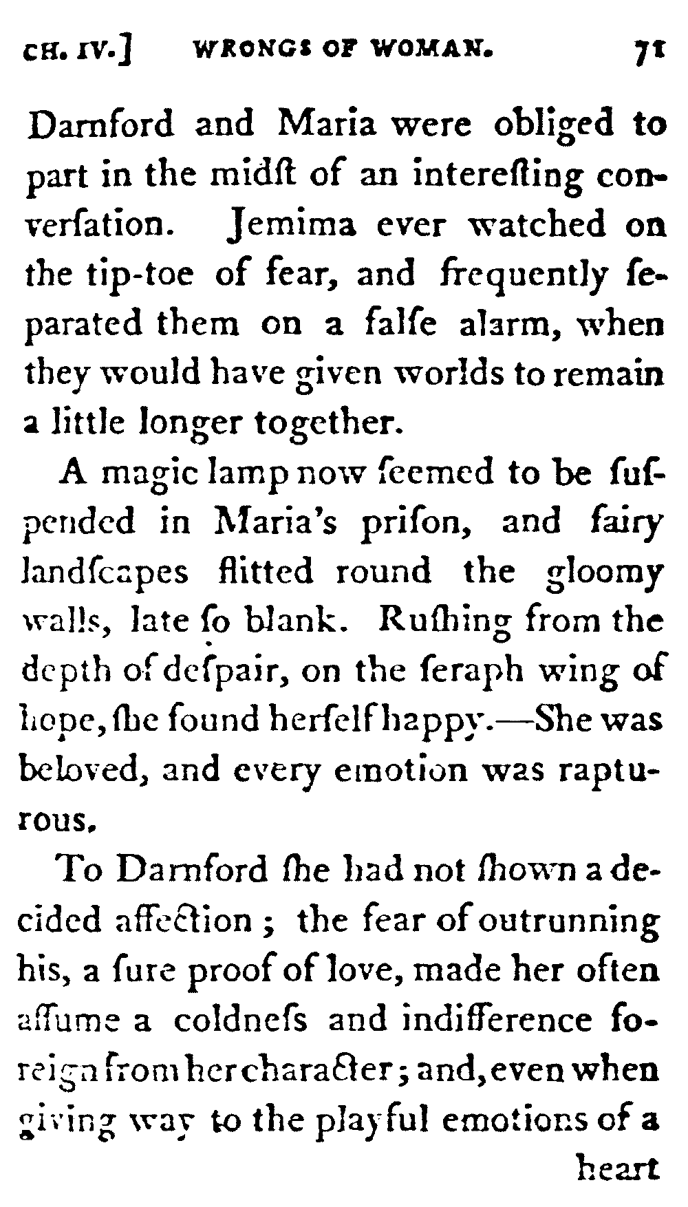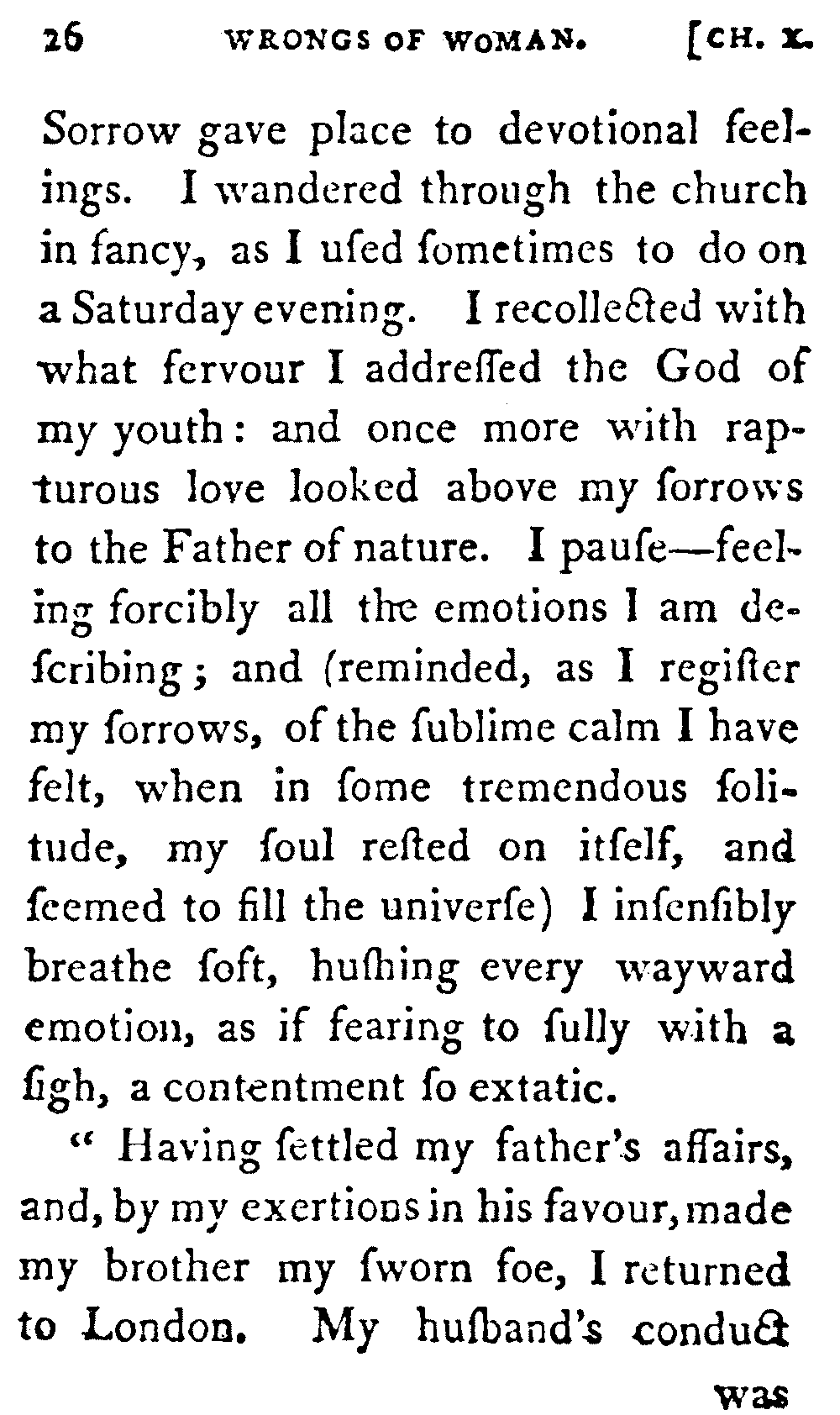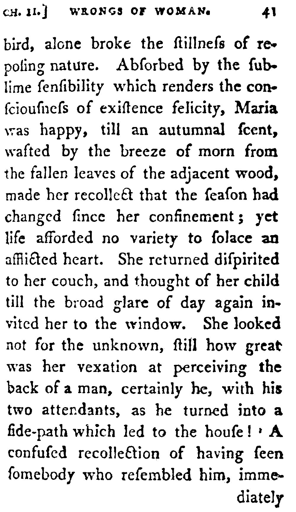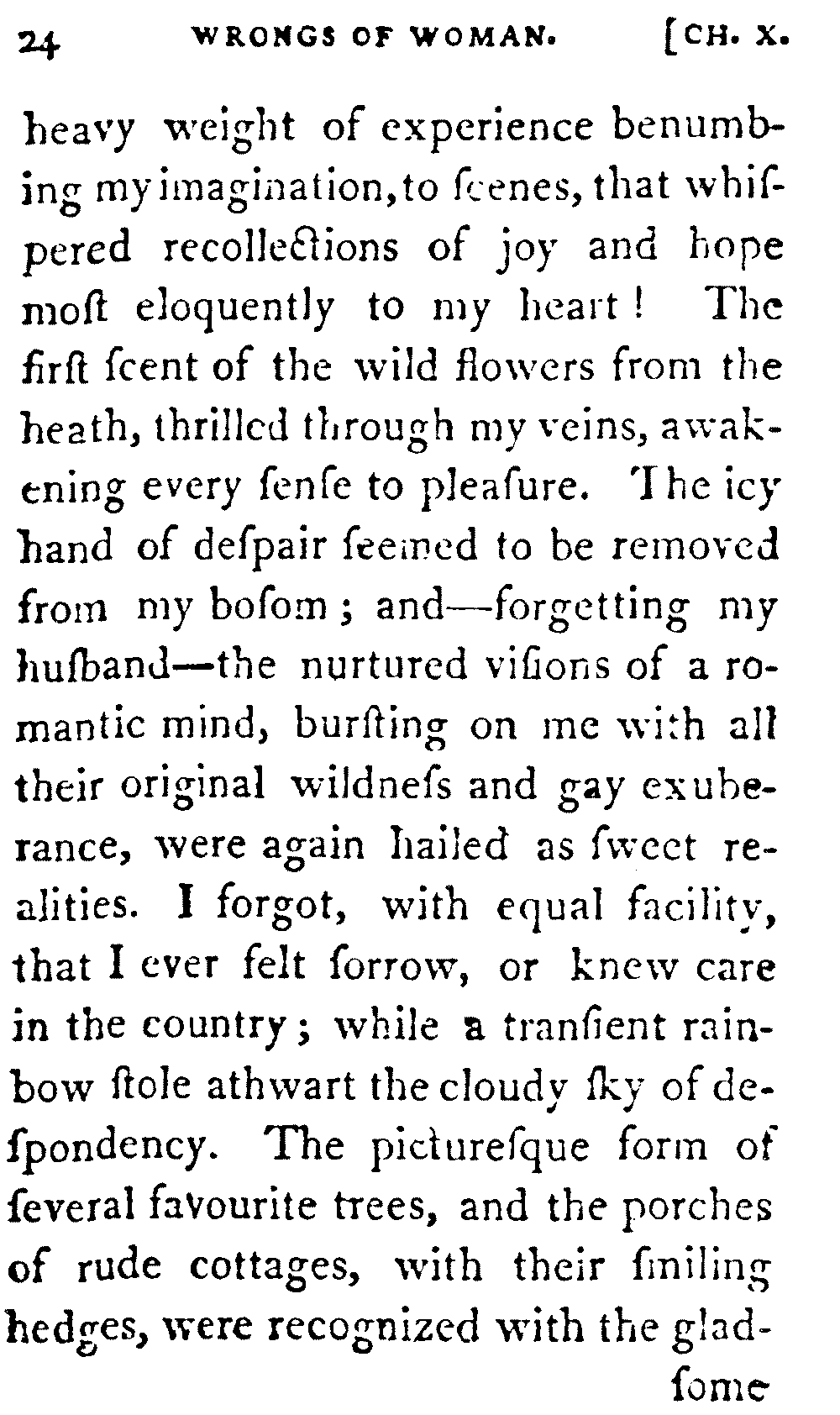 Maria took up the books with emotion. "They come," said she, "perhaps, from a wretch condemned, like me, to reason on the nature of madness, by having wrecked minds continually under his eye; and almost to wish himself—as I do—mad, to escape from the contemplation of it." Her heart throbbed with sympathetic alarm; and she turned over the leaves with awe, as if they had become sacred from passing through the hands of an unfortunate being, oppressed by a similar fate.