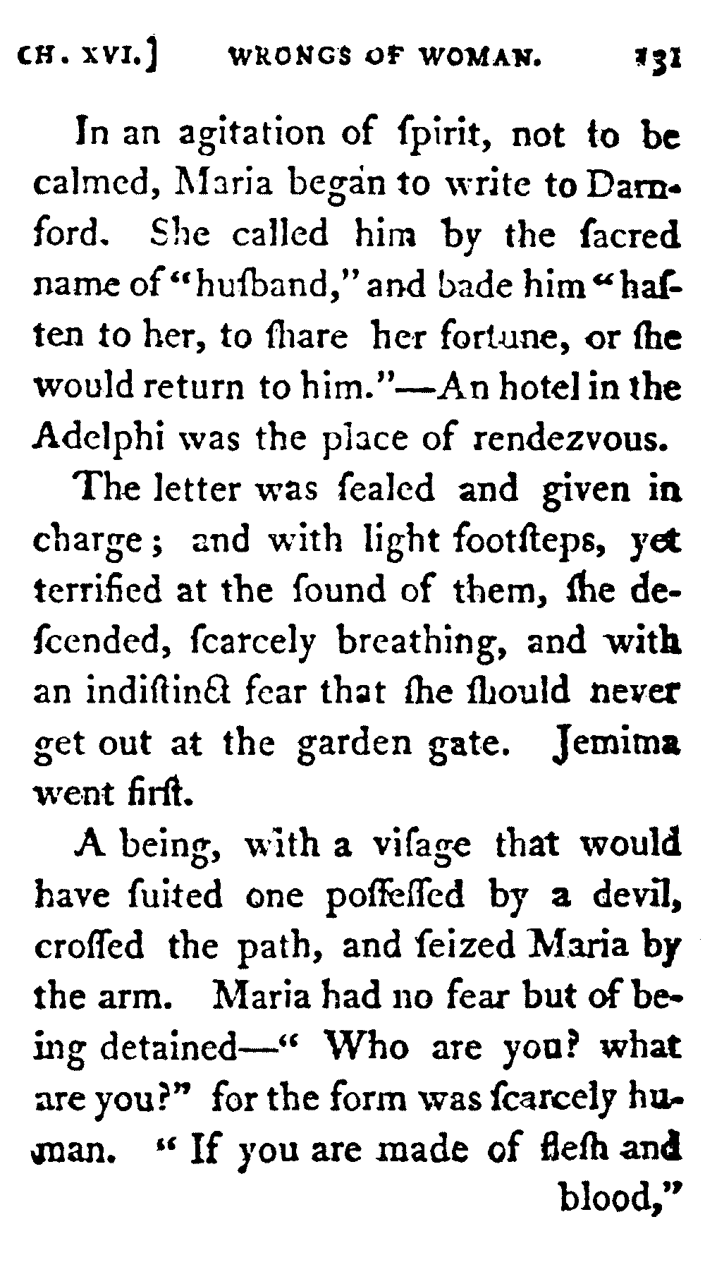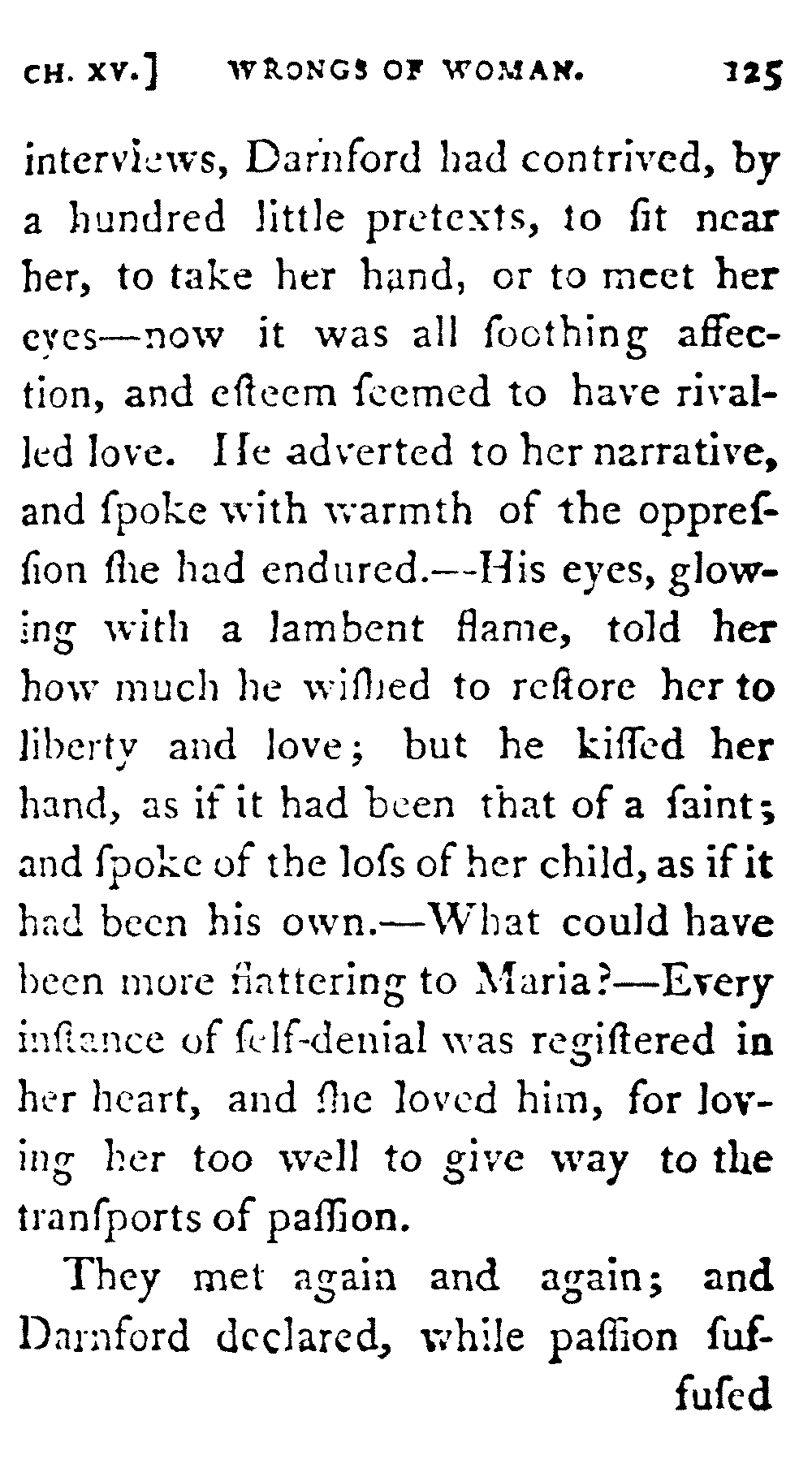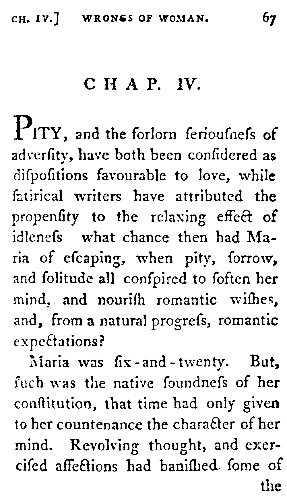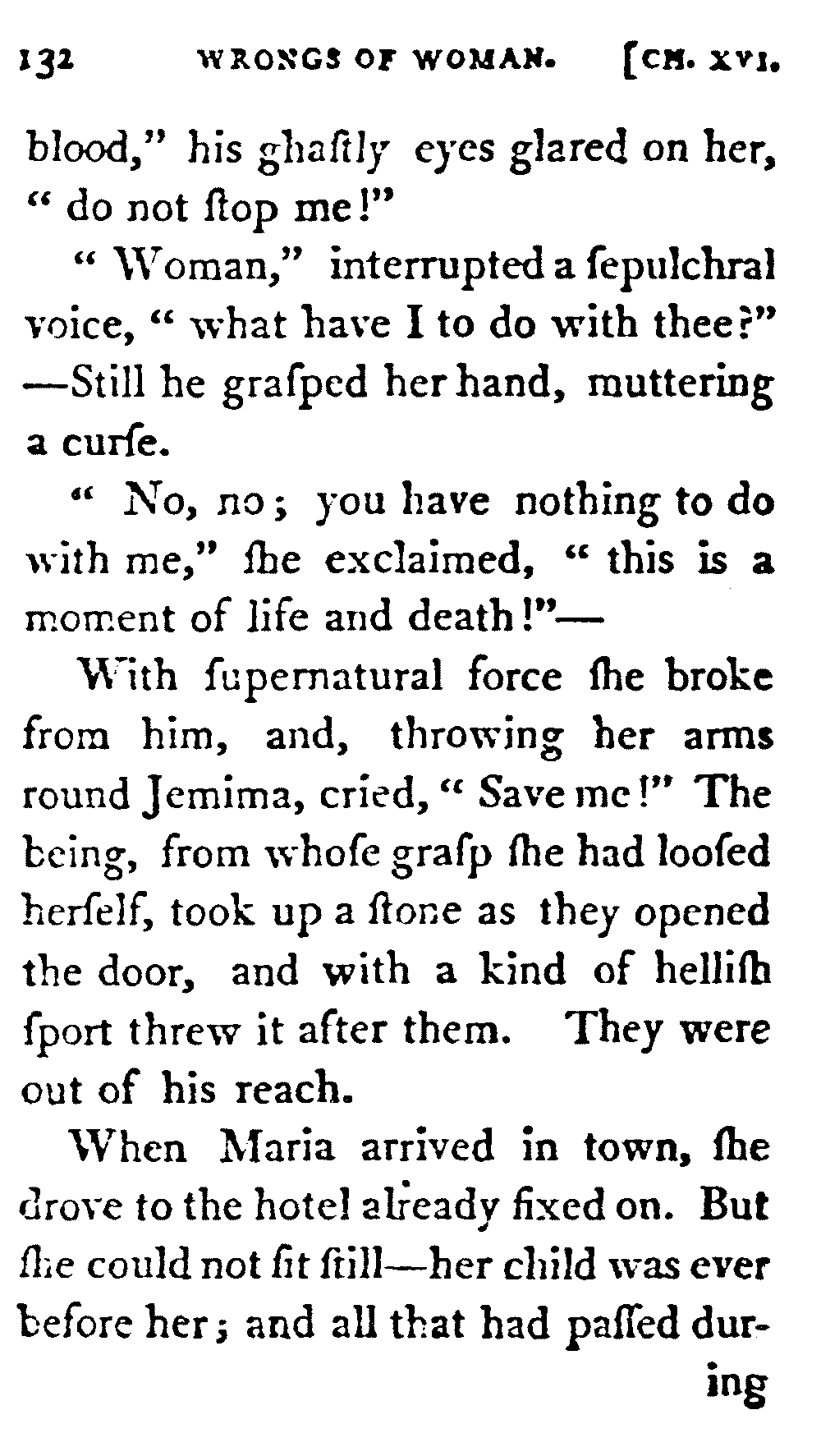 Maria took up the books with emotion. "They come," said she, "perhaps, from a wretch condemned, like me, to reason on the nature of madness, by having wrecked minds continually under his eye; and almost to wish himself—as I do—mad, to escape from the contemplation of it." Her heart throbbed with sympathetic alarm; and she turned over the leaves with awe, as if they had become sacred from passing through the hands of an unfortunate being, oppressed by a similar fate.