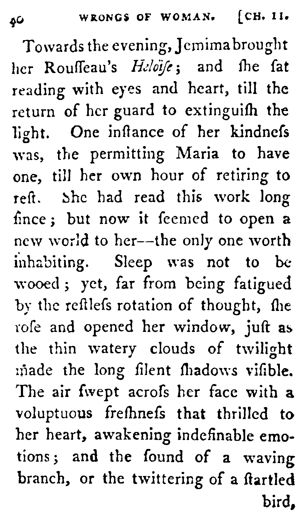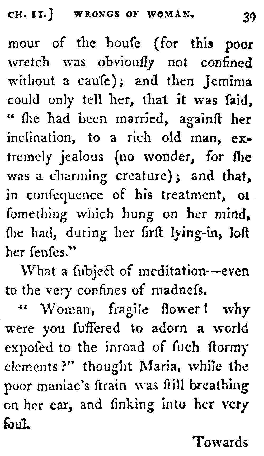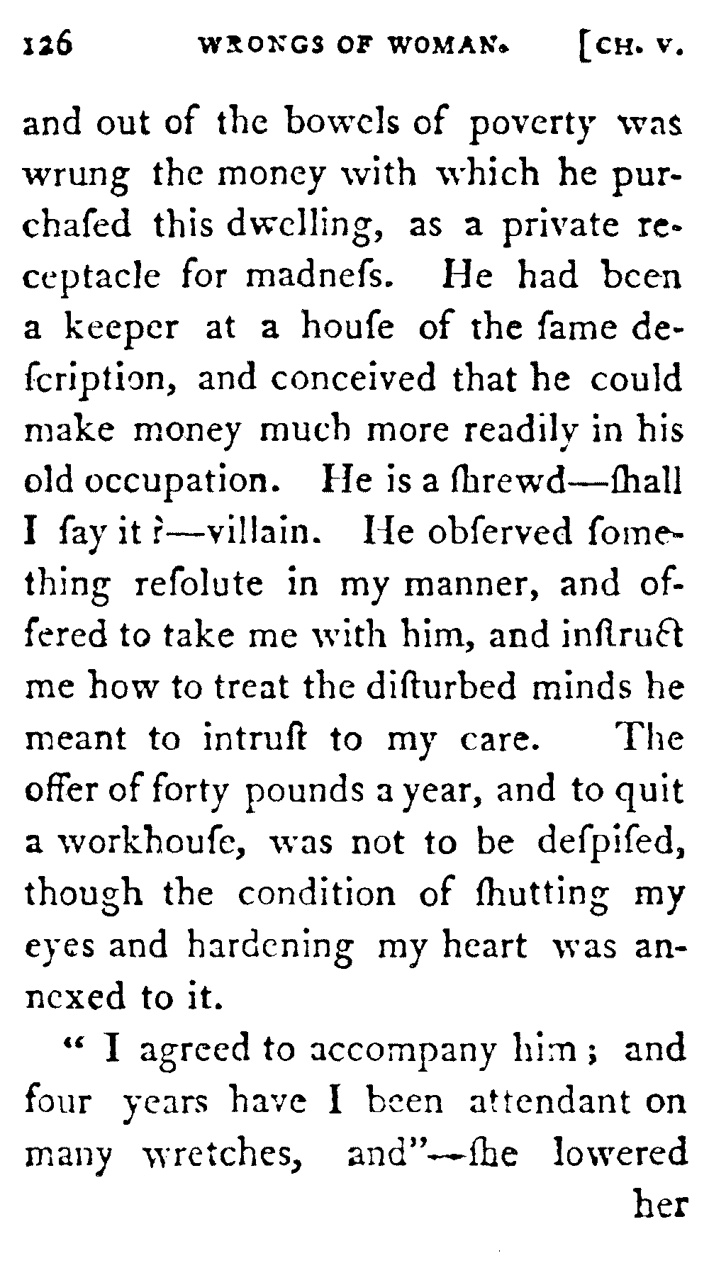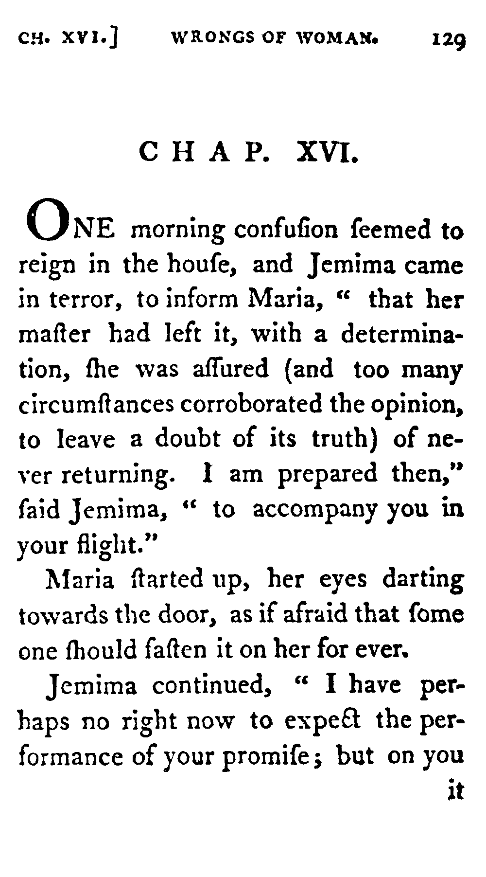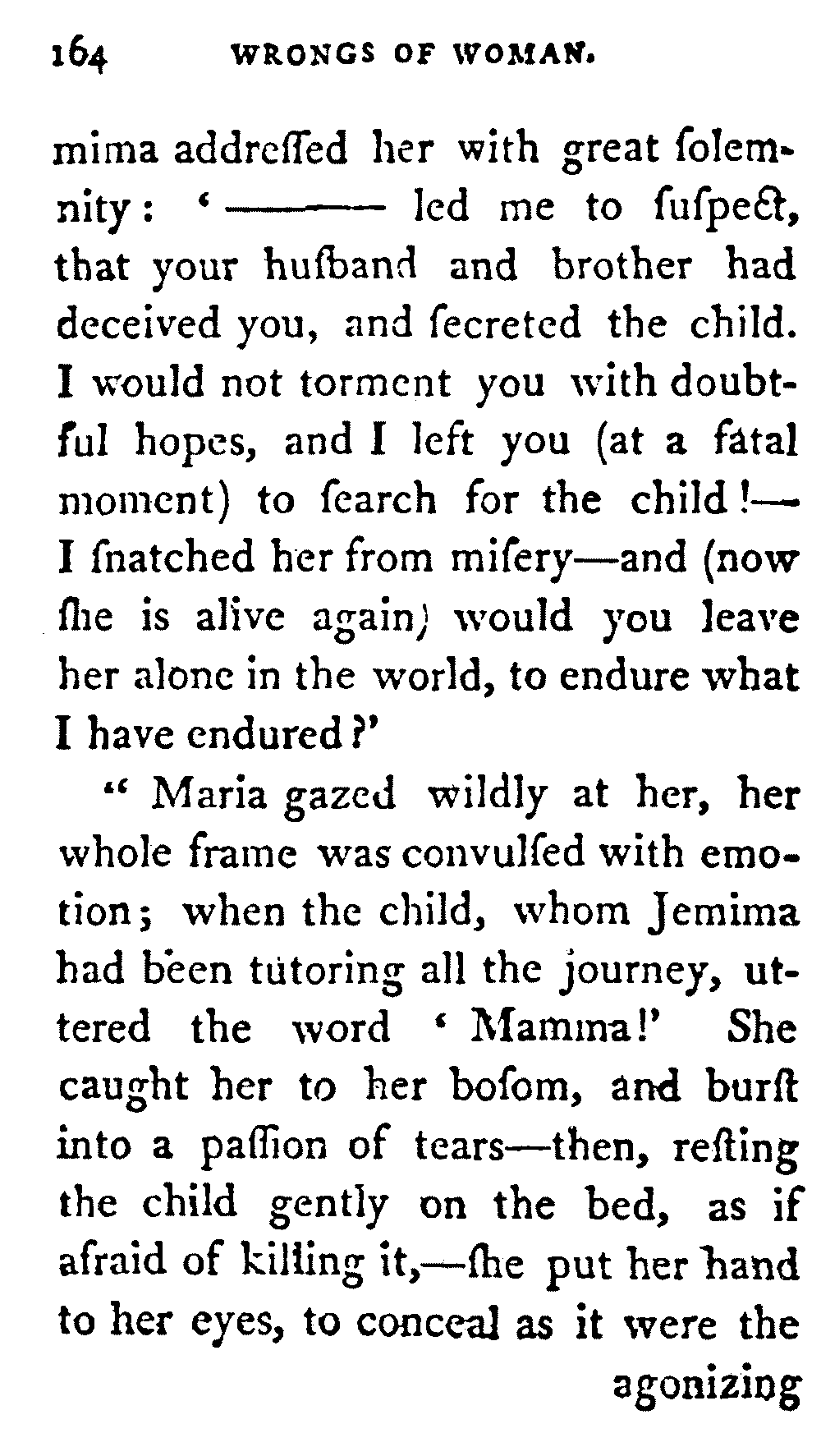 Maria took up the books with emotion. "They come," said she, "perhaps, from a wretch condemned, like me, to reason on the nature of madness, by having wrecked minds continually under his eye; and almost to wish himself—as I do—mad, to escape from the contemplation of it." Her heart throbbed with sympathetic alarm; and she turned over the leaves with awe, as if they had become sacred from passing through the hands of an unfortunate being, oppressed by a similar fate.