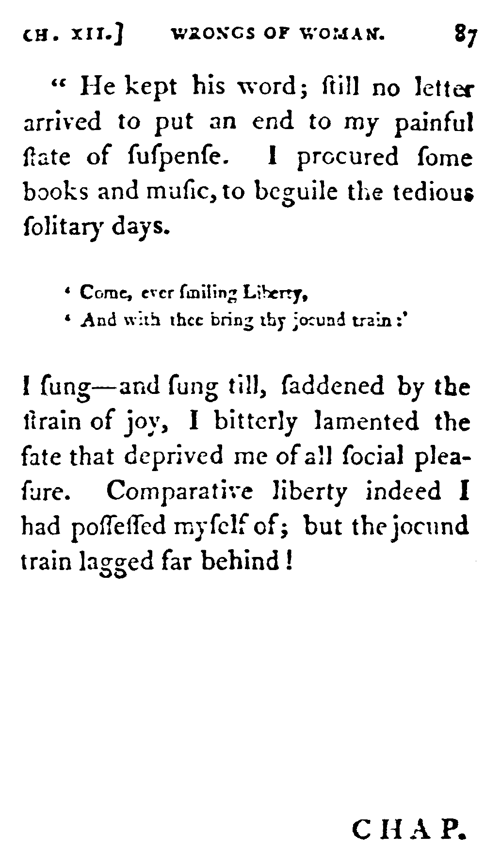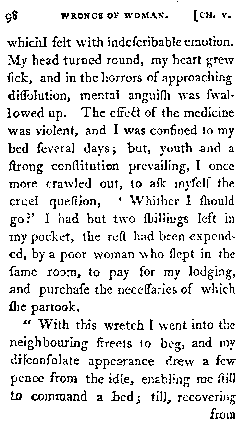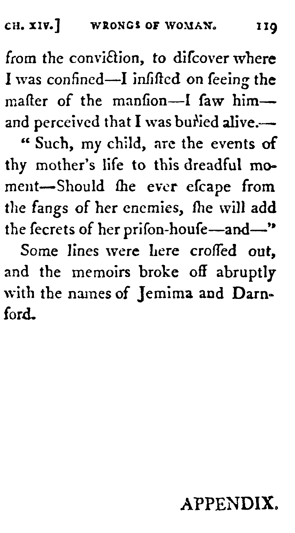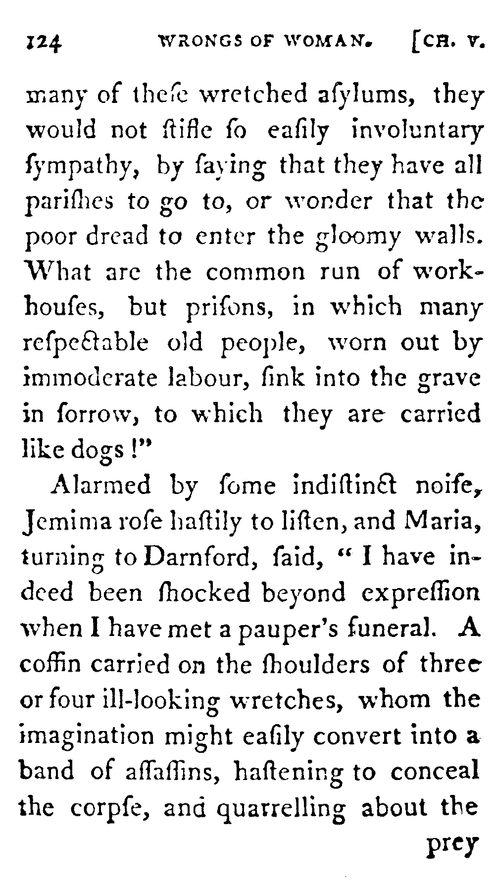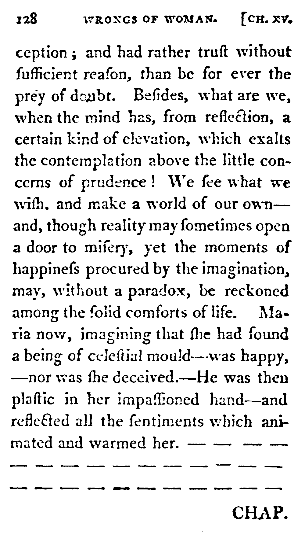 Maria took up the books with emotion. "They come," said she, "perhaps, from a wretch condemned, like me, to reason on the nature of madness, by having wrecked minds continually under his eye; and almost to wish himself—as I do—mad, to escape from the contemplation of it." Her heart throbbed with sympathetic alarm; and she turned over the leaves with awe, as if they had become sacred from passing through the hands of an unfortunate being, oppressed by a similar fate.