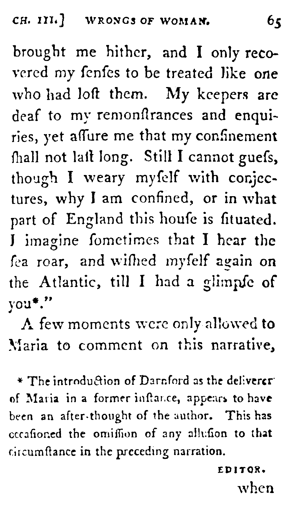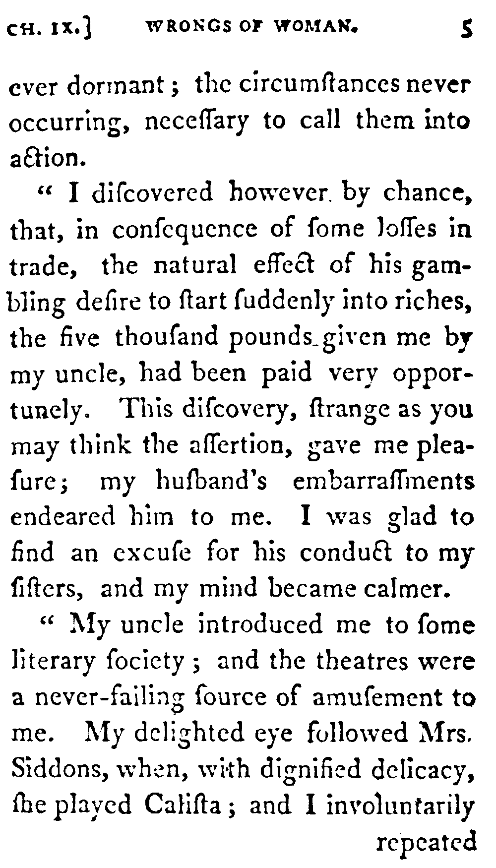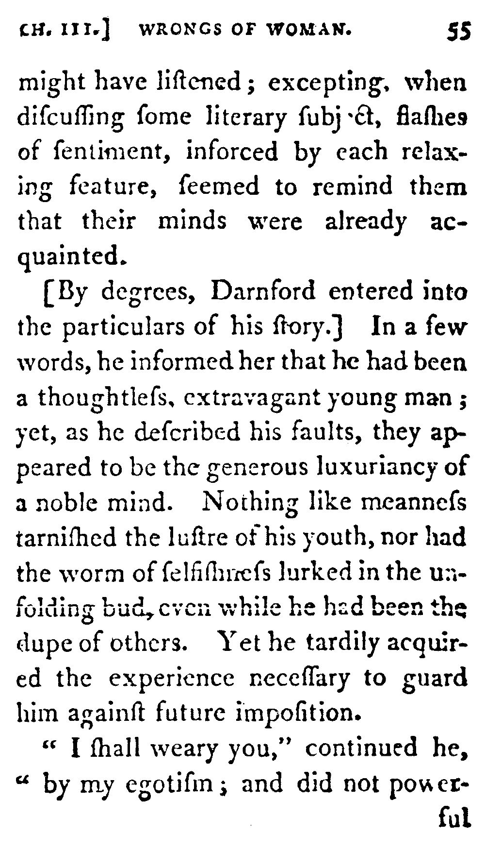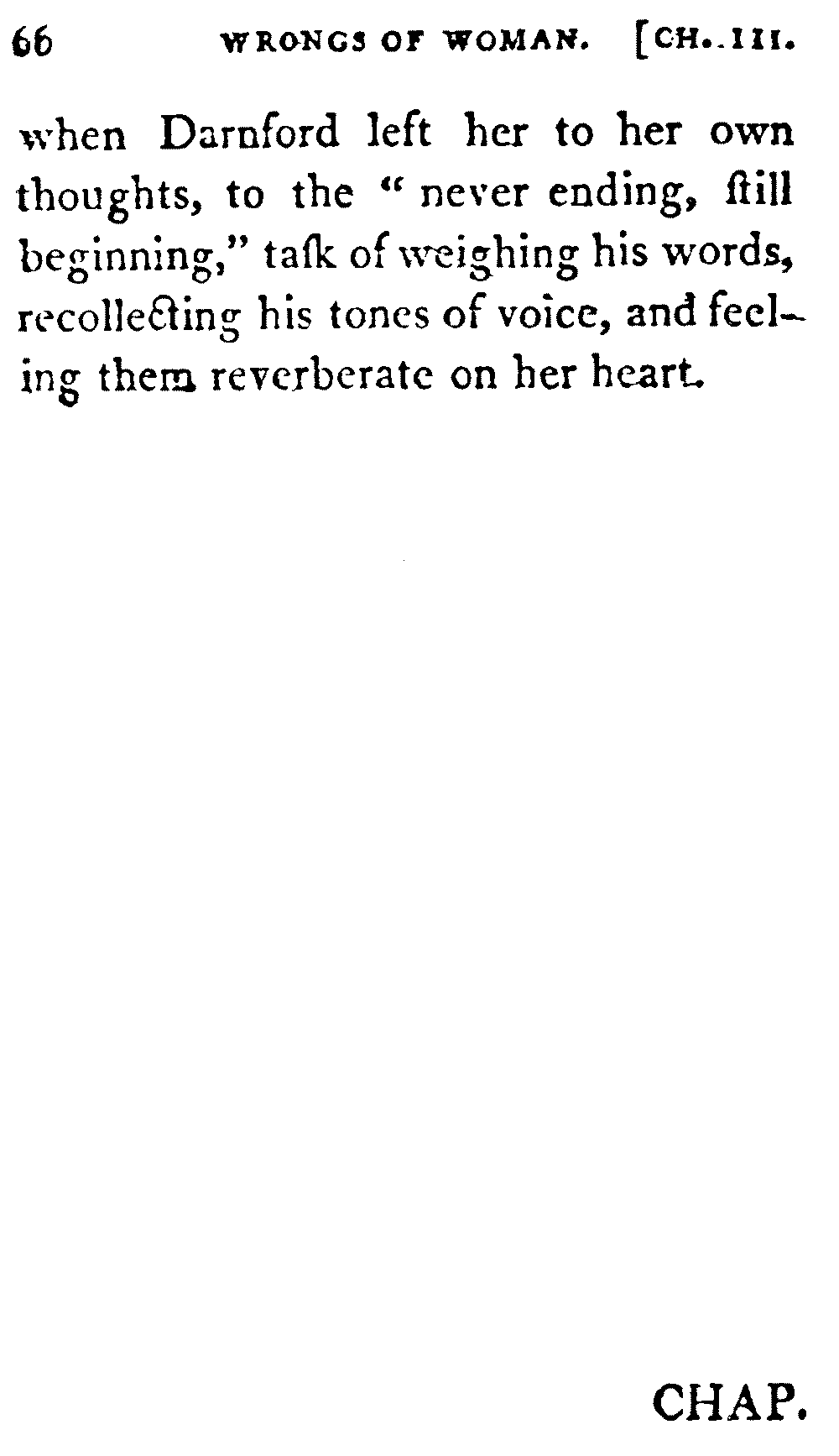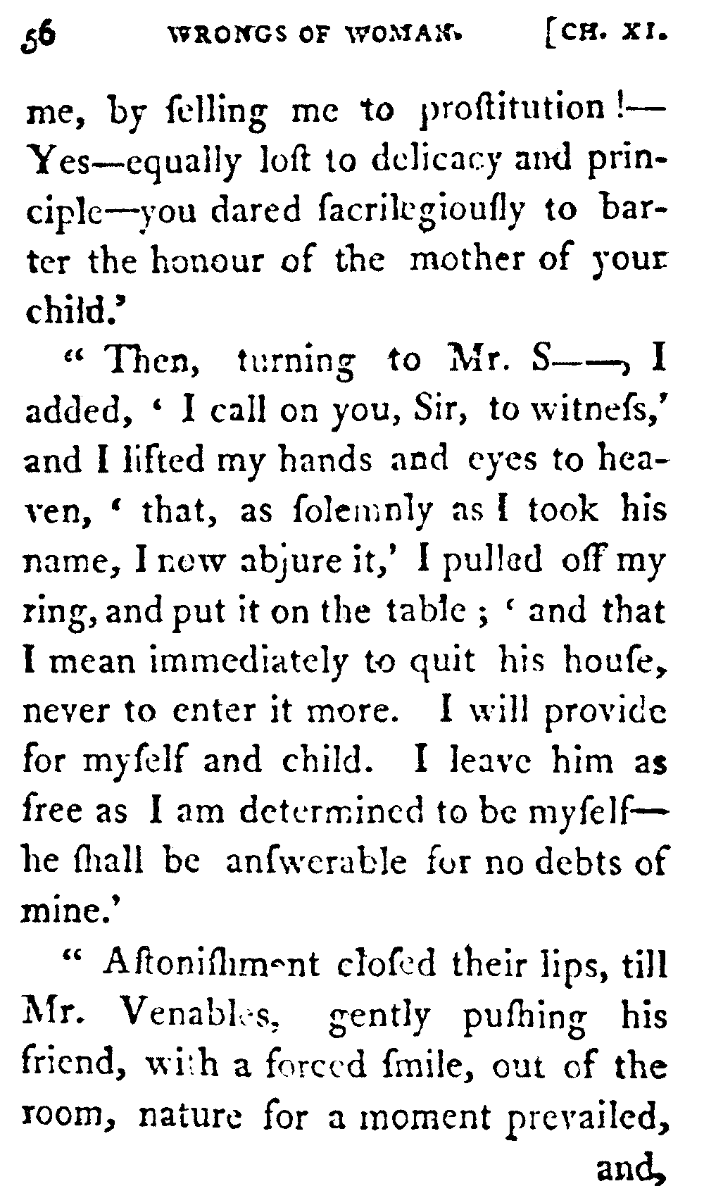 Maria took up the books with emotion. "They come," said she, "perhaps, from a wretch condemned, like me, to reason on the nature of madness, by having wrecked minds continually under his eye; and almost to wish himself—as I do—mad, to escape from the contemplation of it." Her heart throbbed with sympathetic alarm; and she turned over the leaves with awe, as if they had become sacred from passing through the hands of an unfortunate being, oppressed by a similar fate.