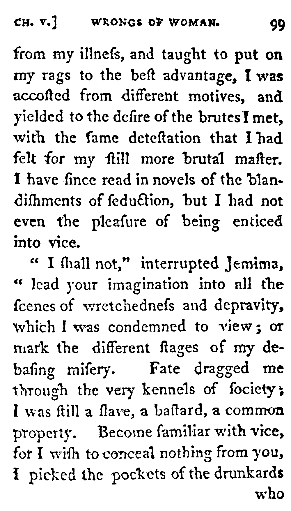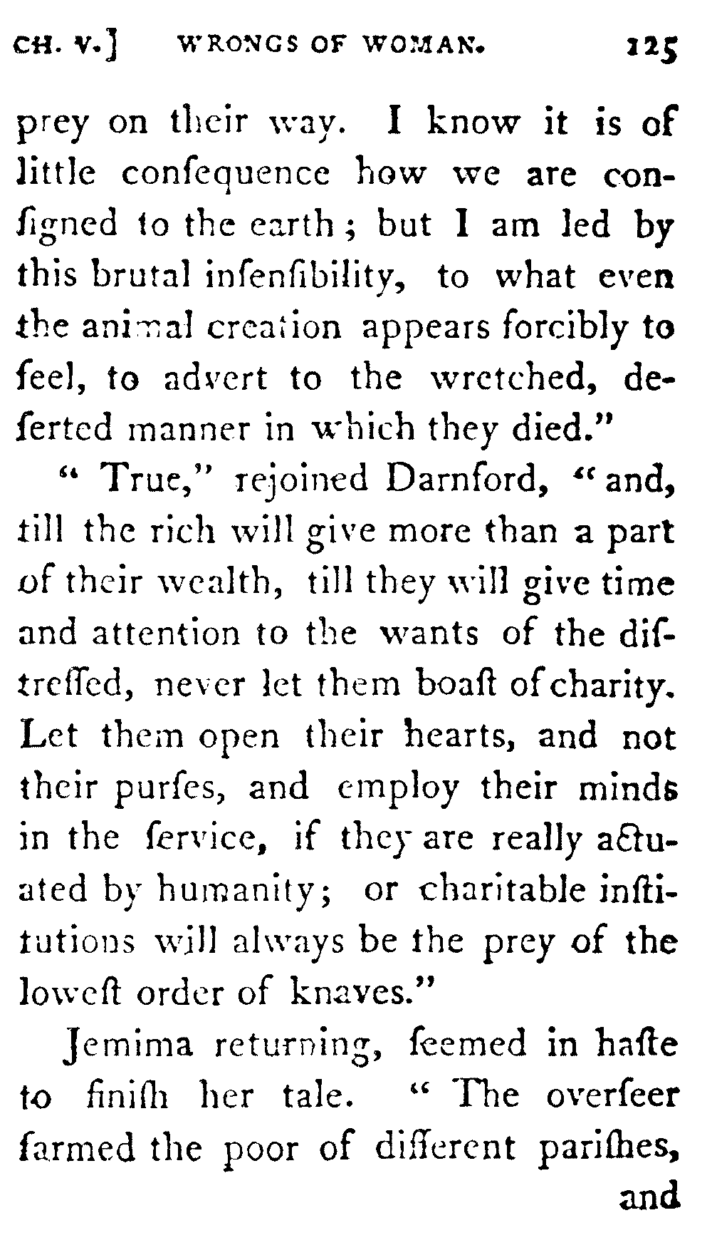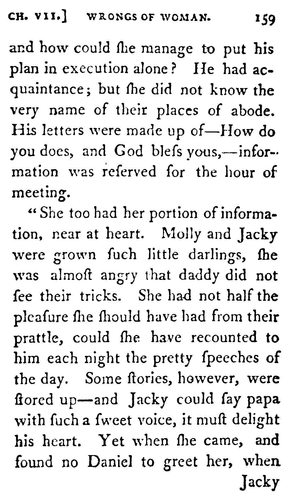 [15] Though she failed immediately to rouse a lively sense of injustice in the mind of her guard, because it had been sophisticated into misanthropy, she touched her heart. Jemima (she had only a claim to a Christian name, which had not procured her any Christian privileges) could patiently hear of Maria's confinement on false pretences; she had felt the crushing hand of power, hardened by the exercise of injustice, and ceased to wonder at the perversions of the understanding, which systematize oppression; but, when told that her child, only four months old, had been torn from her, even while she was discharging the tenderest maternal office, the woman awoke in a bosom long estranged from feminine emotions, and Jemima determined to alleviate all in her power, without ha[16]zarding the loss of her place, the sufferings of a wretched mother, apparently injured, and certainly unhappy. A sense of right seems to result from the simplest act of reason, and to preside over the faculties of the mind, like the master-sense of feeling, to rectify the rest; but (for the comparison may be carried still farther) how often is the exquisite sensibility of both weakened or destroyed by the vulgar occupations, and ignoble pleasures of life?