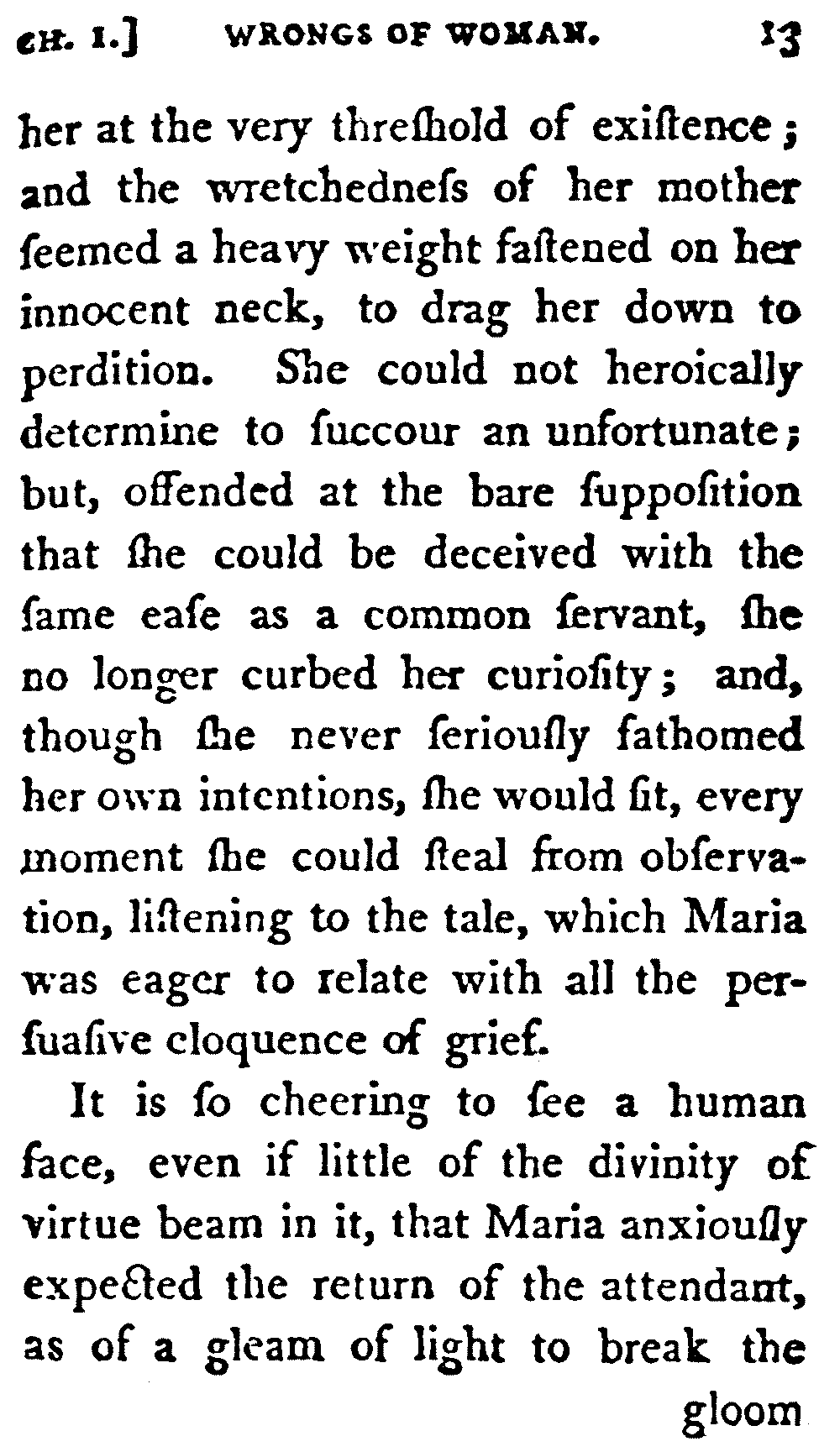 Had her master trusted her, it is probable that neither pity nor curiosity would have made her swerve from the straight line of her interest; for she had suffered too much in her intercourse with mankind, not to determine to look for support, rather to humouring their passions, than courting their approbation by the integrity of her conduct. A deadly blight had met[13] her at the very threshold of existence; and the wretchedness of her mother seemed a heavy weight fastened on her innocent neck, to drag her down to perdition. She could not heroically determine to succour an unfortunate; but, offended at the bare supposition that she could be deceived with the same ease as a common servant, she no longer curbed her curiosity; and, though she never seriously fathomed her own intentions, she would sit, every moment she could steal from observation, listening to the tale, which Maria was eager to relate with all the persuasive eloquence of grief.