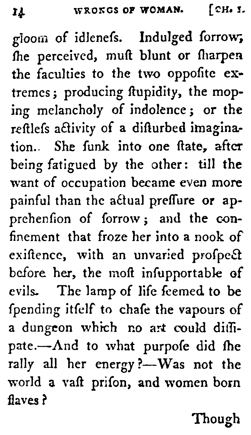 It is so cheering to see a human face, even if little of the divinity of virtue beam in it, that Maria anxiously expected the return of the attendant, as of a gleam of light to break the[14] gloom of idleness. Indulged sorrow; she perceived, must blunt or sharpen the faculties to the two opposite extremes; producing stupidity, the moping melancholy of indolence; or the restless activity of a disturbed imagination. She sunk into one state, after being fatigued by the other: till the want of occupation became even more painful than the actual pressure or apprehension of sorrow; and the confinement that froze her into a nook of existence, with an unvaried prospect before her, the most insupportable of evils. The lamp of life seemed to be spending itself to chase the vapours of a dungeon which no art could dissipate.—And to what purpose did she rally all her energy?—Was not the world a vast prison, and women born slaves?