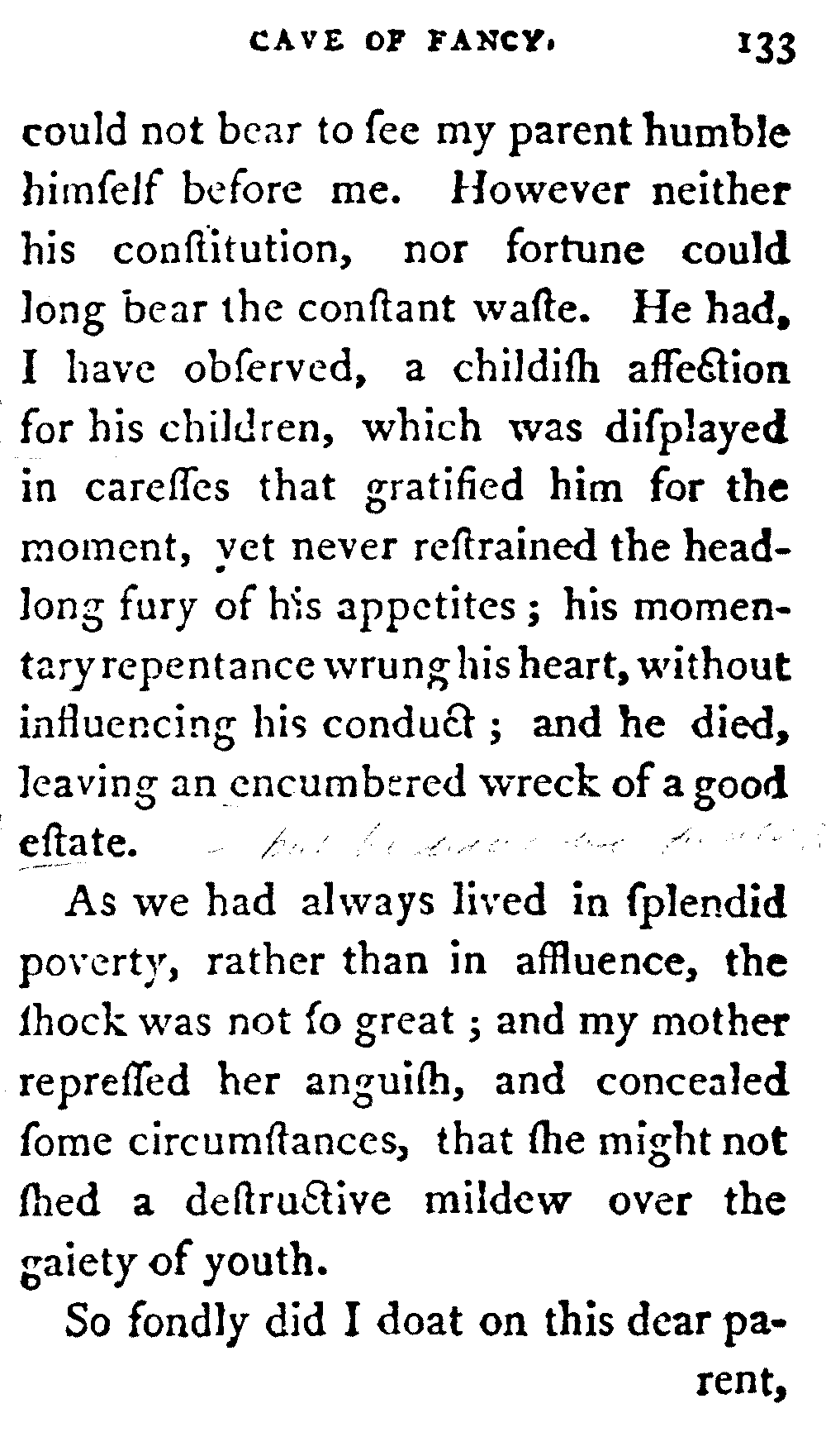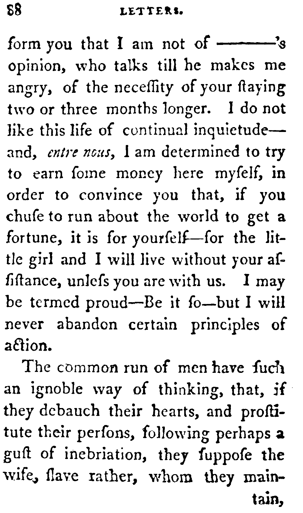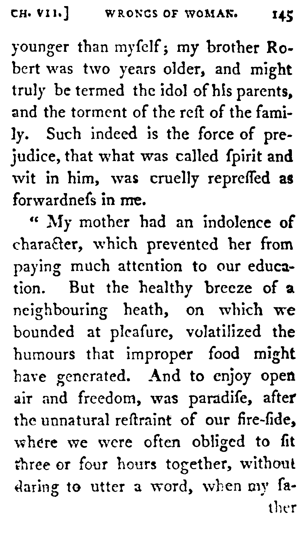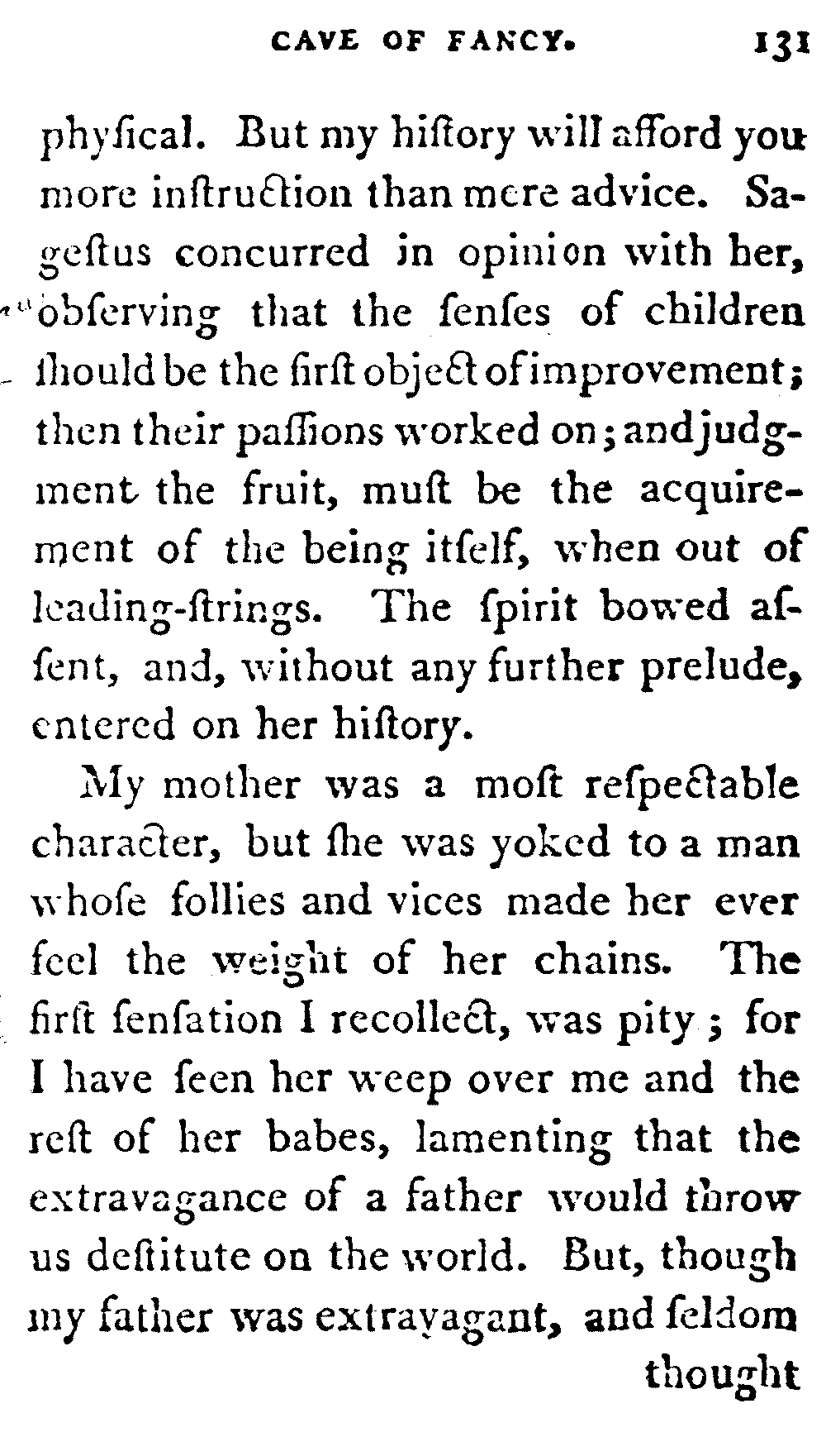 My mother was a moſt reſpectable character, but ſhe was yoked to a man whoſe follies and vices made her ever feel the weight of her chains. The firſt ſenſation I recollect, was pity; for I have ſeen her weep over me and the reſt of her babes, lamenting that the extravagance of a father would throw us deſtitute on the world. But, though my father was extravagant, and ſeldom[132] thought of any thing but his own pleaſures, our education was not neglected. In ſolitude, this employment was my mother's only ſolace; and my father's pride made him procure us maſters; nay, ſometimes he was ſo gratified by our improvement, that he would embrace us with tenderneſs, and intreat my mother to forgive him, with marks of real contrition. But the affection his penitence gave riſe to, only ſerved to expoſe her to continual diſappointments, and keep hope alive merely to torment her. After a violent debauch he would let his beard grow, and the ſadneſs that reigned in the houſe I ſhall never forget; he was aſhamed to meet even the eyes of his children. This is ſo contrary to the nature of things, it gave me exquiſite pain; I uſed, at thoſe times, to ſhow him extreme reſpect. I[133] could not bear to ſee my parent humble himſelf before me. However neither his conſtitution, nor fortune could long bear the conſtant waſte. He had, I have obſerved, a childiſh affection for his children, which was diſplayed in careſſes that gratified him for the moment, yet never reſtrained the headlong fury of his appetites; his momentary repentance wrung his heart, without influencing his conduct; and he died, leaving an encumbered wreck of a good eſtate.