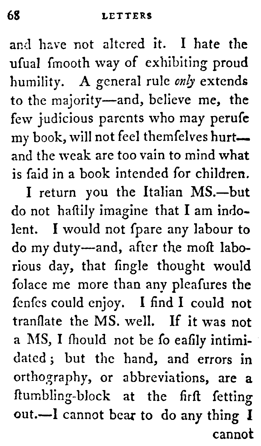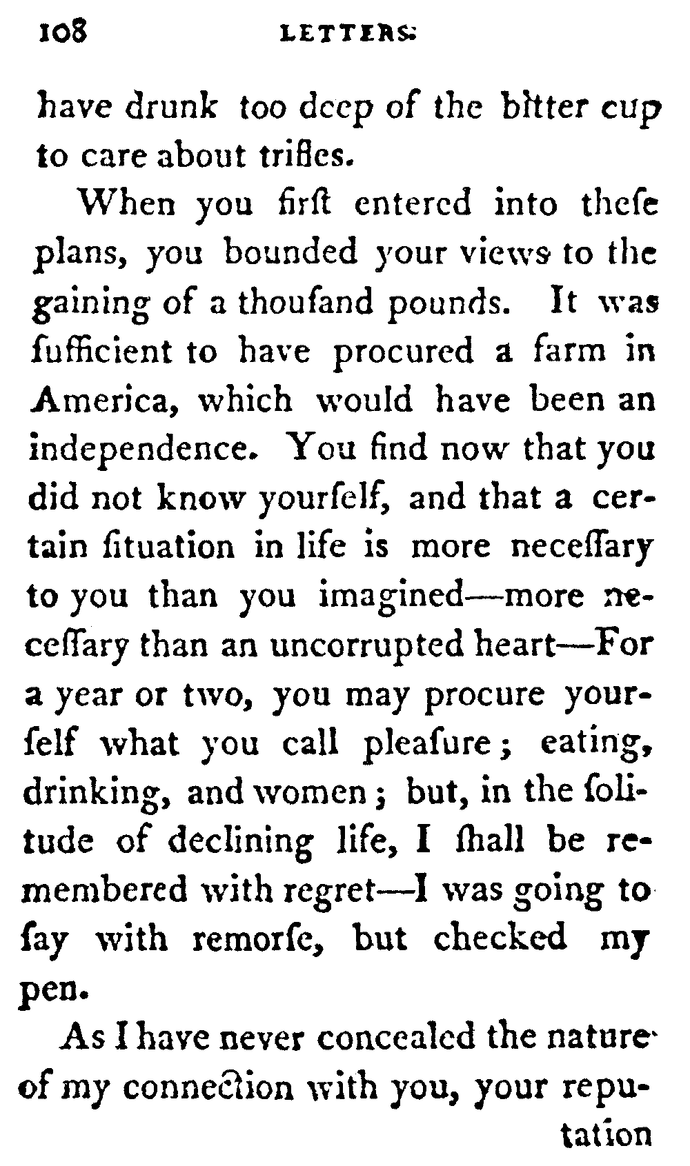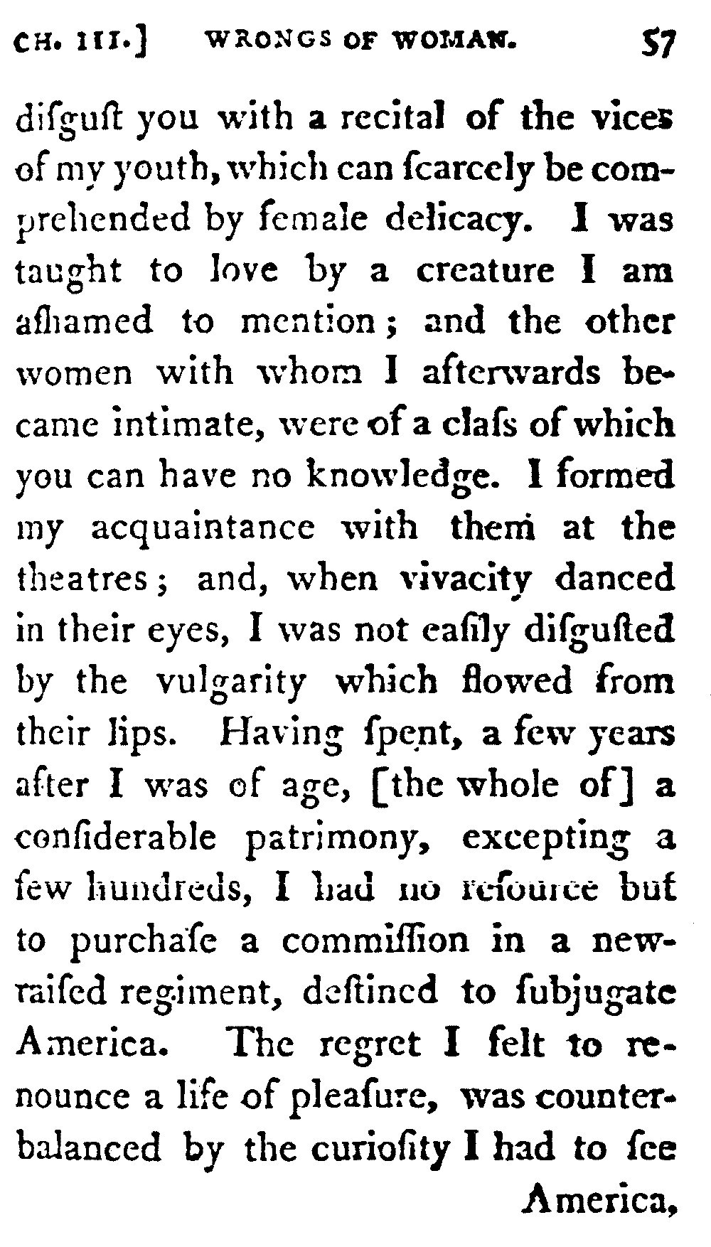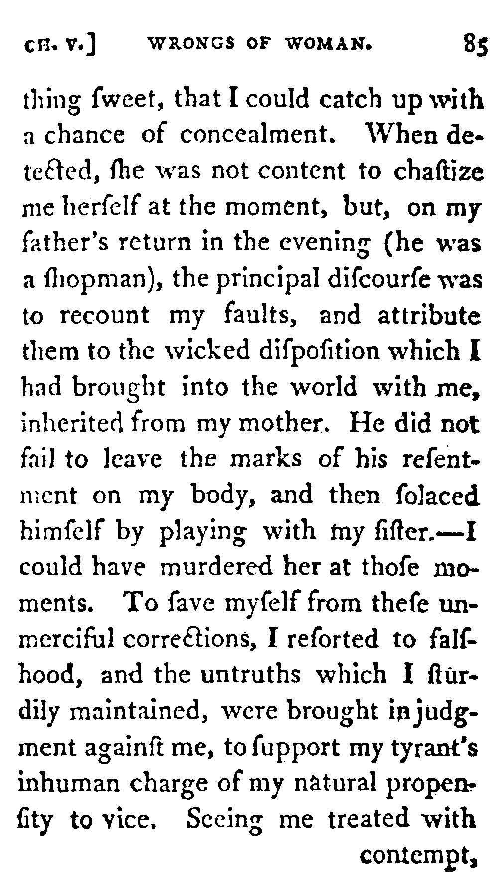 My mother was a moſt reſpectable character, but ſhe was yoked to a man whoſe follies and vices made her ever feel the weight of her chains. The firſt ſenſation I recollect, was pity; for I have ſeen her weep over me and the reſt of her babes, lamenting that the extravagance of a father would throw us deſtitute on the world. But, though my father was extravagant, and ſeldom[132] thought of any thing but his own pleaſures, our education was not neglected. In ſolitude, this employment was my mother's only ſolace; and my father's pride made him procure us maſters; nay, ſometimes he was ſo gratified by our improvement, that he would embrace us with tenderneſs, and intreat my mother to forgive him, with marks of real contrition. But the affection his penitence gave riſe to, only ſerved to expoſe her to continual diſappointments, and keep hope alive merely to torment her. After a violent debauch he would let his beard grow, and the ſadneſs that reigned in the houſe I ſhall never forget; he was aſhamed to meet even the eyes of his children. This is ſo contrary to the nature of things, it gave me exquiſite pain; I uſed, at thoſe times, to ſhow him extreme reſpect. I[133] could not bear to ſee my parent humble himſelf before me. However neither his conſtitution, nor fortune could long bear the conſtant waſte. He had, I have obſerved, a childiſh affection for his children, which was diſplayed in careſſes that gratified him for the moment, yet never reſtrained the headlong fury of his appetites; his momentary repentance wrung his heart, without influencing his conduct; and he died, leaving an encumbered wreck of a good eſtate.