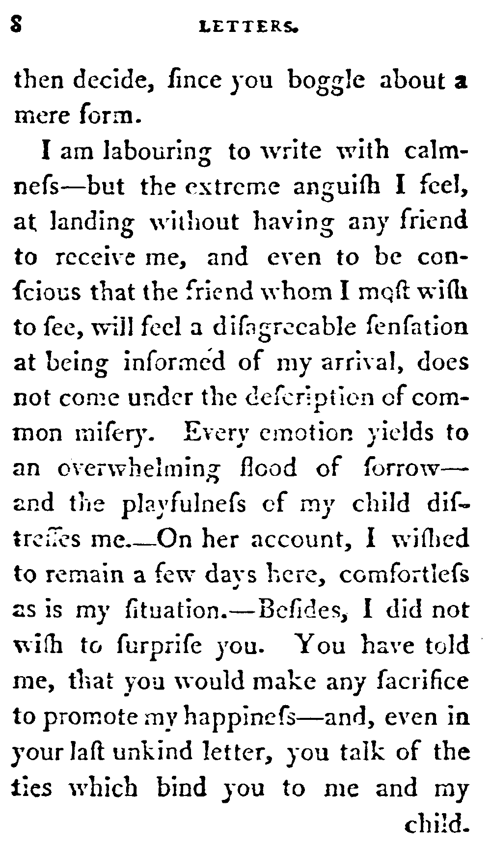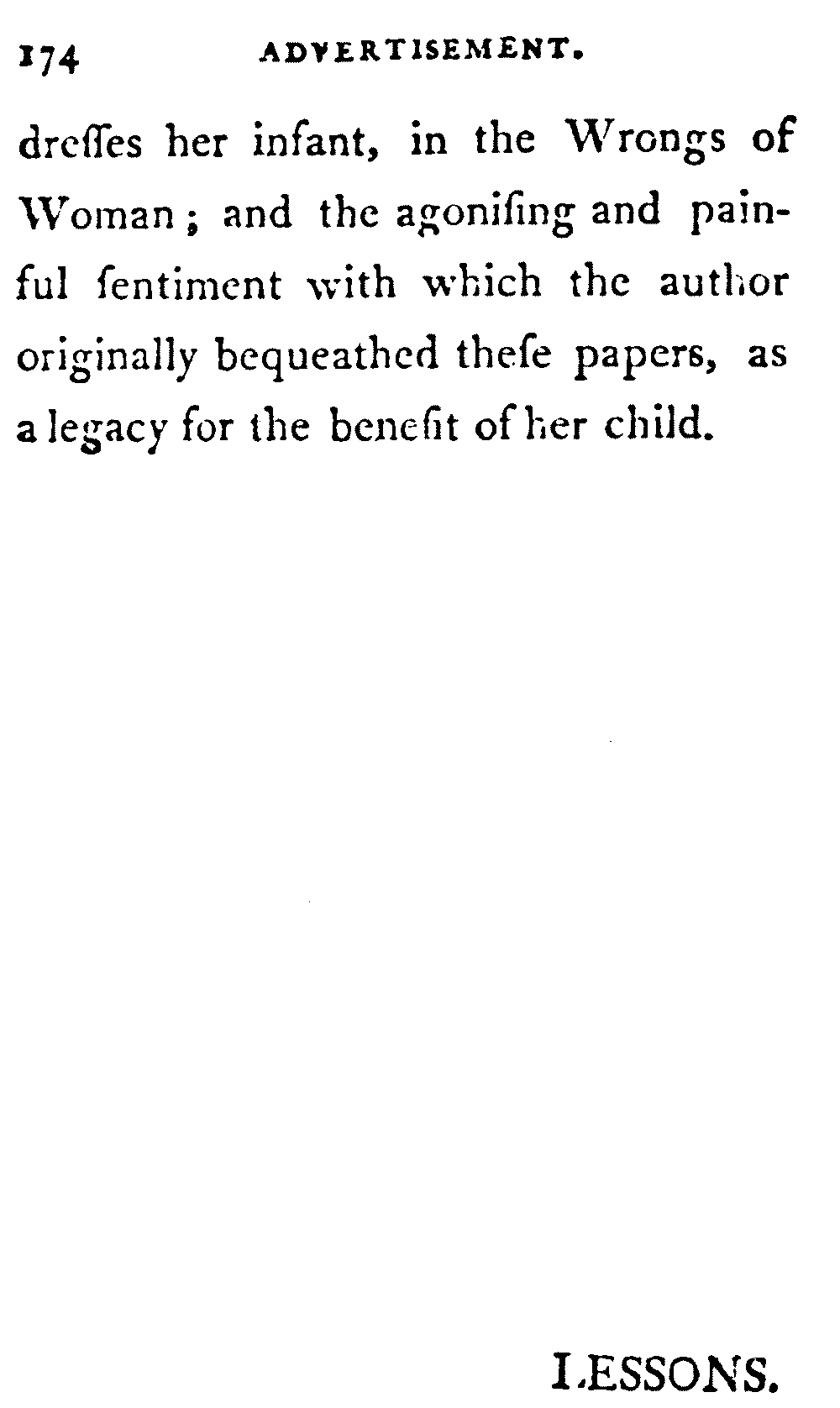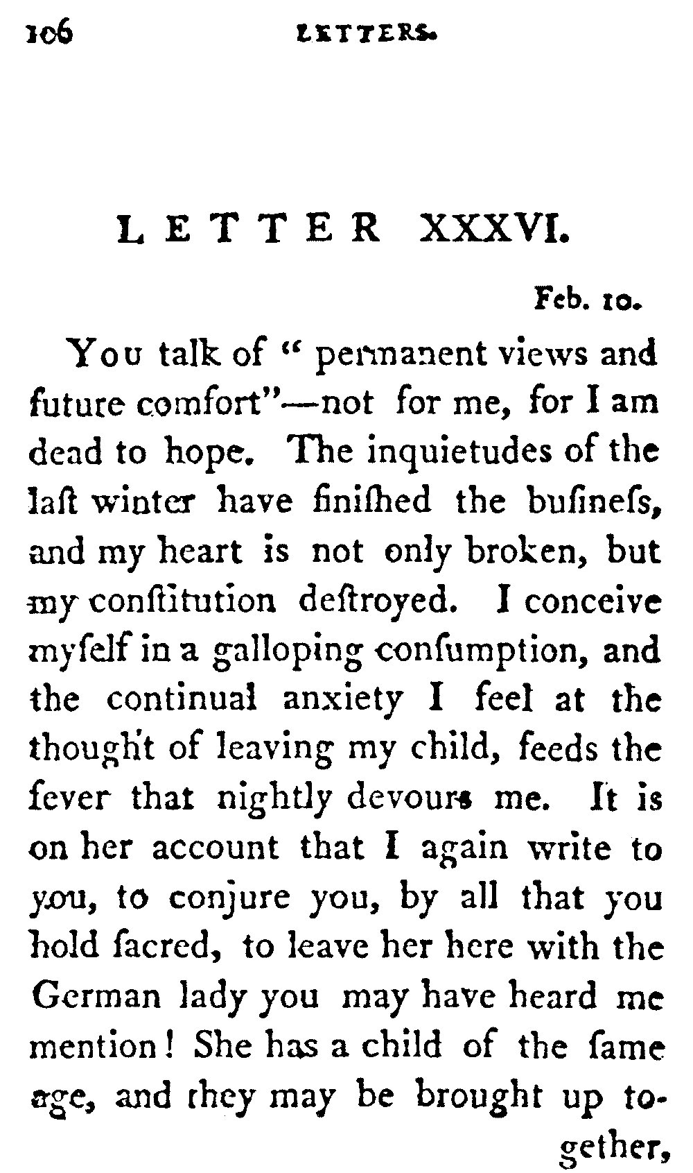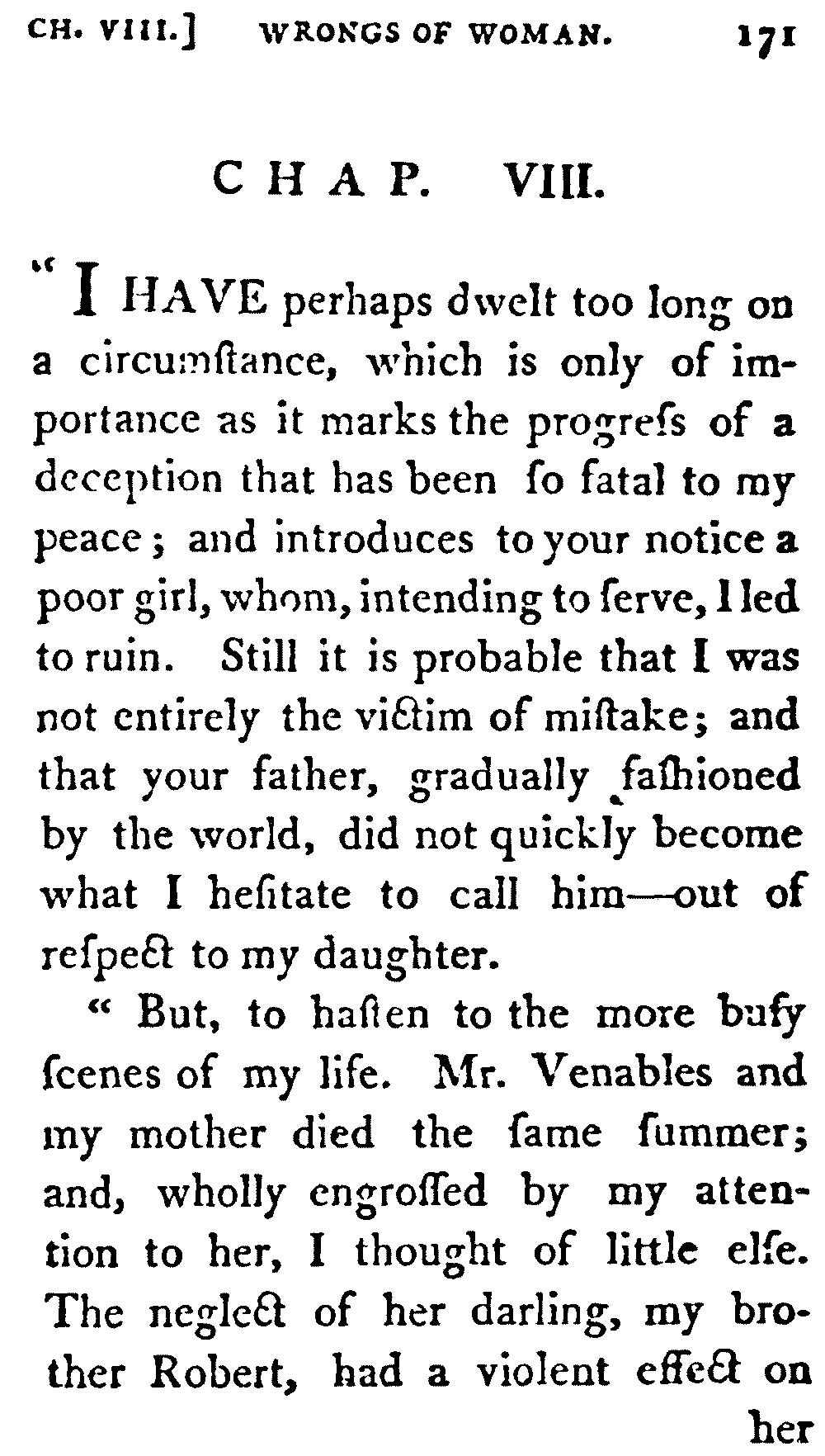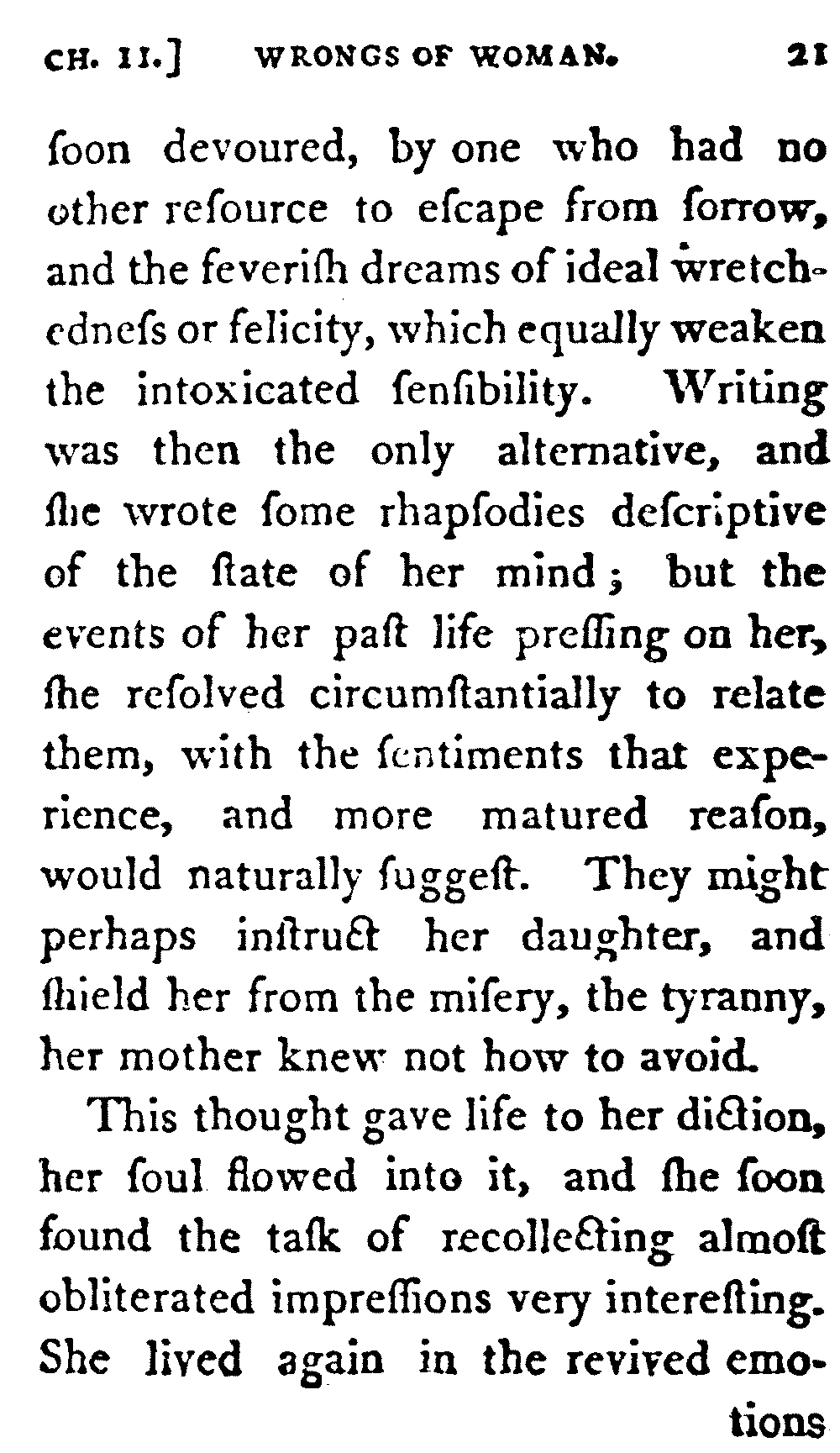 The books she had obtained, were[21] soon devoured, by one who had no other resource to escape from sorrow, and the feverish dreams of ideal wretchedness or felicity, which equally weaken the intoxicated sensibility. Writing was then the only alternative, and she wrote some rhapsodies descriptive of the state of her mind; but the events of her past life pressing on her, she resolved circumstantially to relate them, with the sentiments that experience, and more matured reason, would naturally suggest. They might perhaps instruct her daughter, and shield her from the misery, the tyranny, her mother knew not how to avoid.