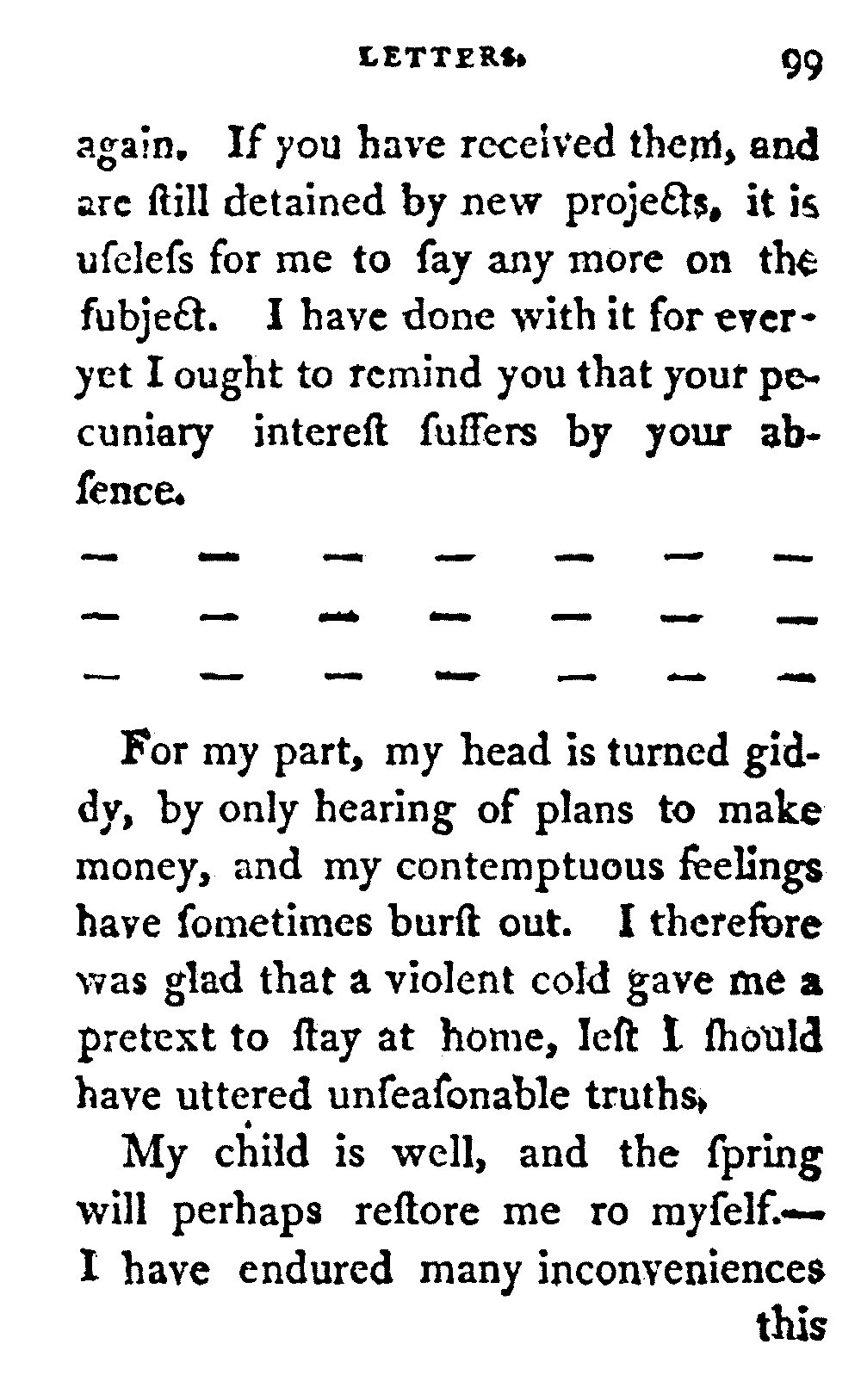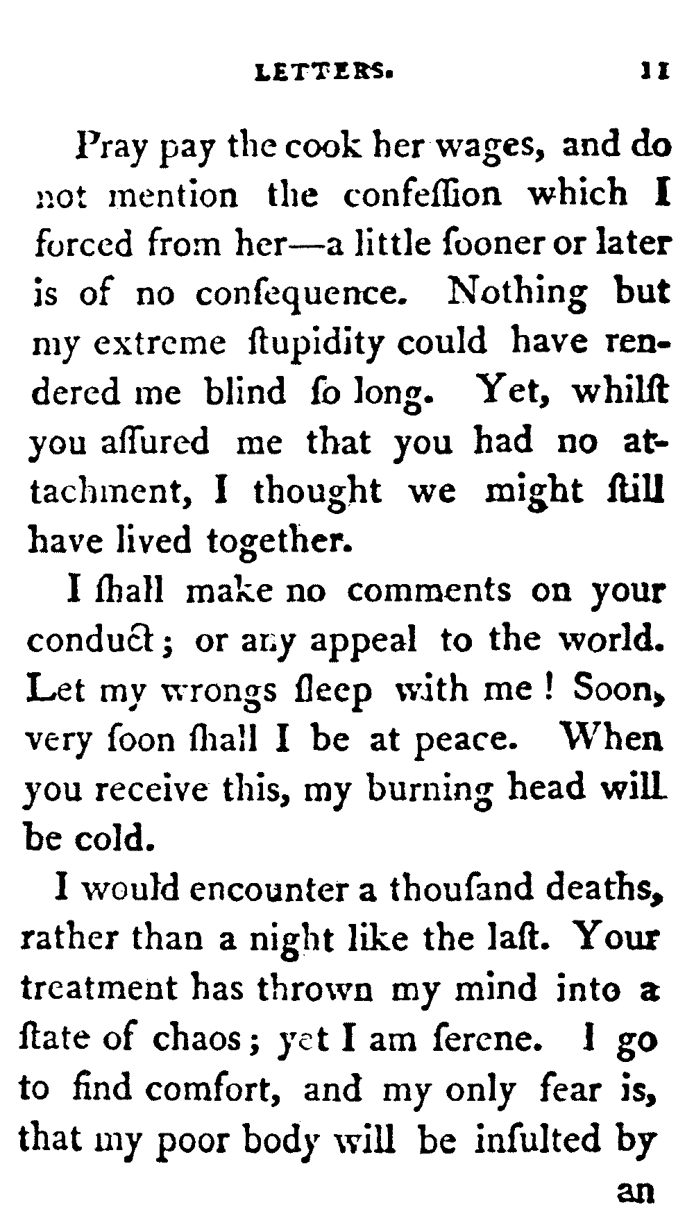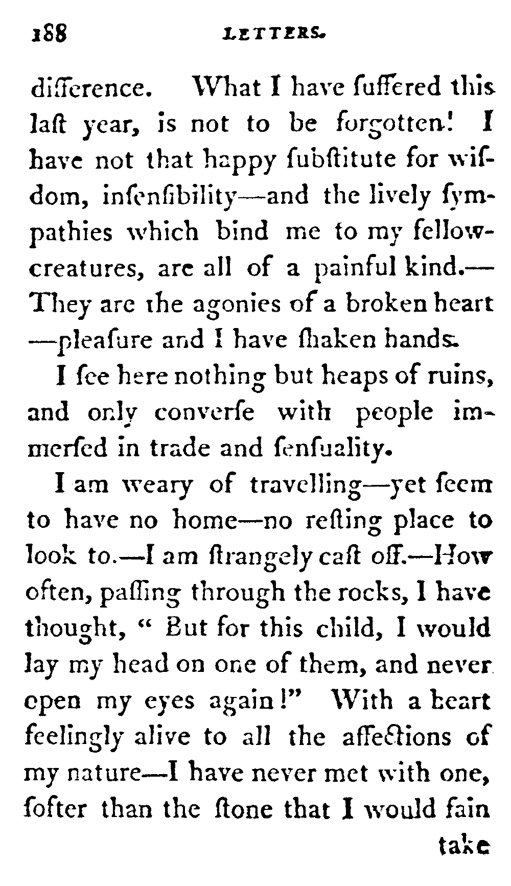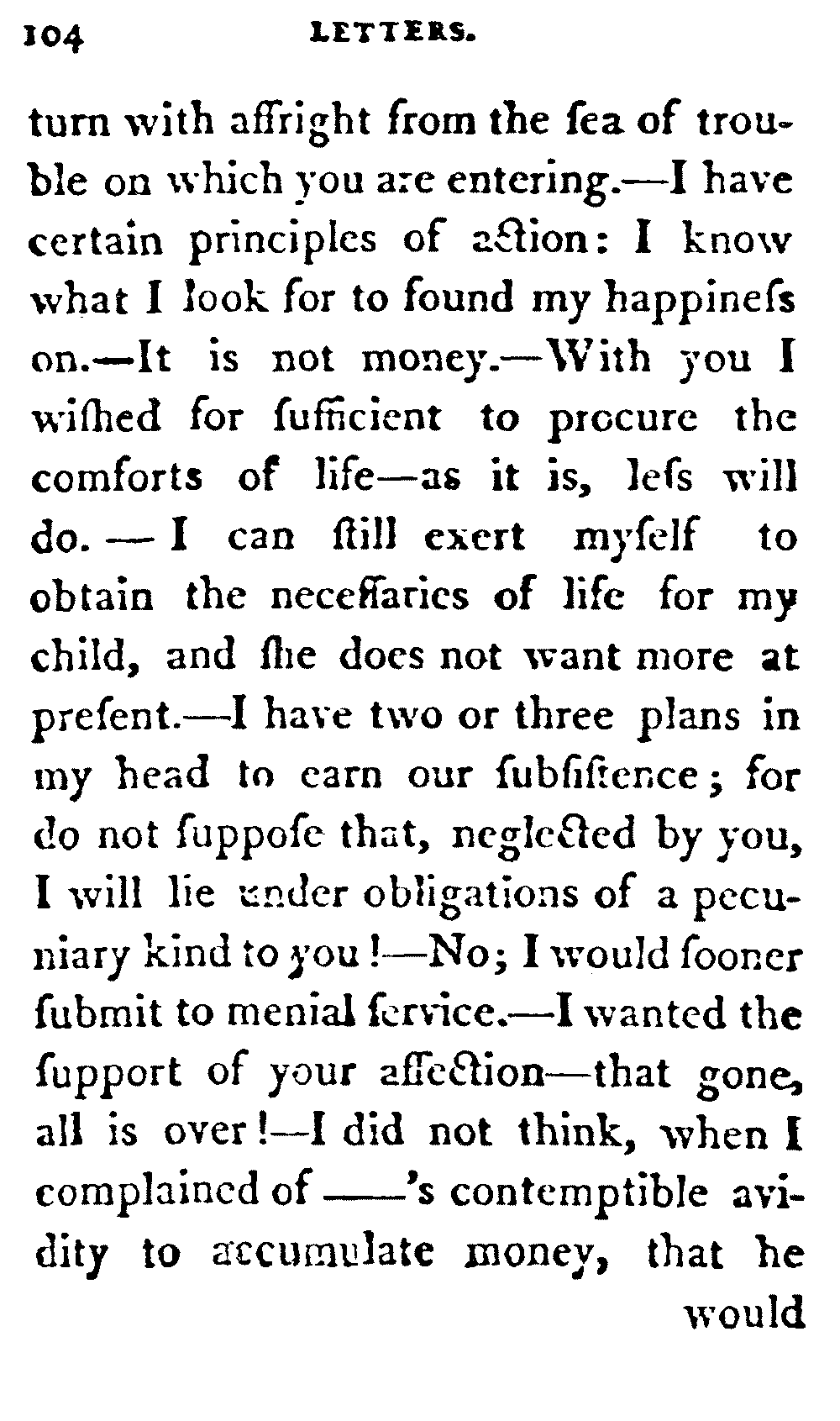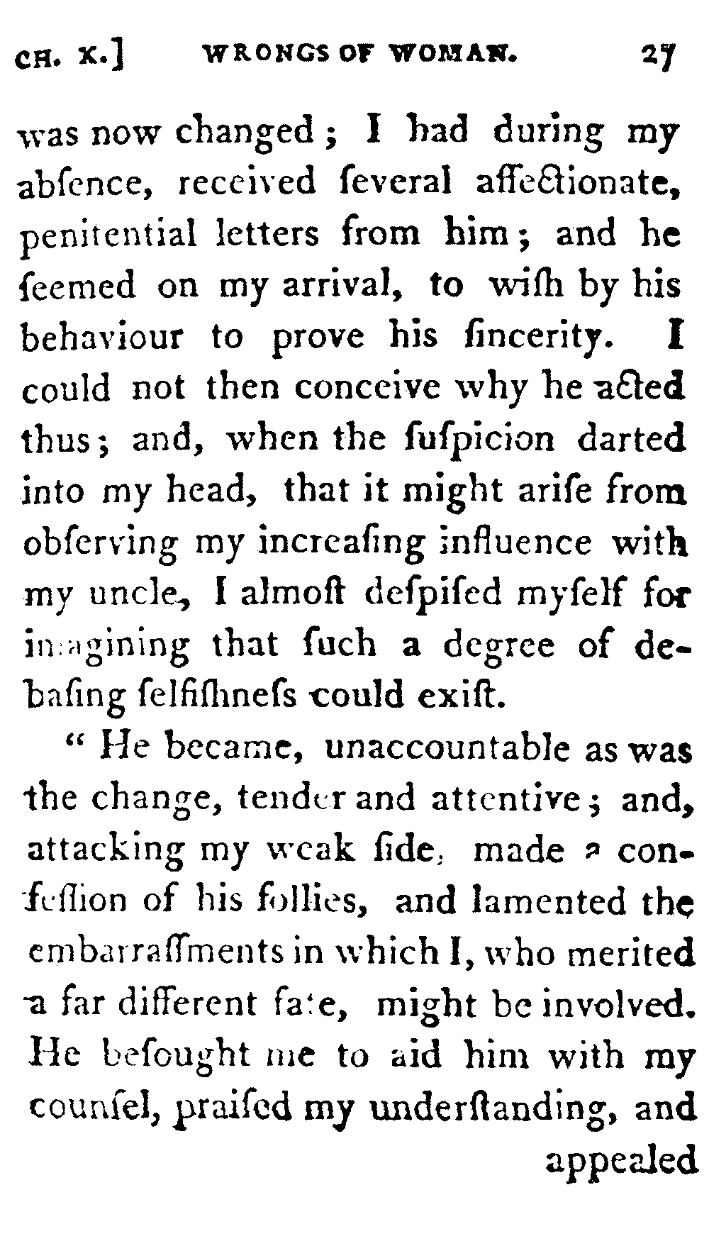 The books she had obtained, were[21] soon devoured, by one who had no other resource to escape from sorrow, and the feverish dreams of ideal wretchedness or felicity, which equally weaken the intoxicated sensibility. Writing was then the only alternative, and she wrote some rhapsodies descriptive of the state of her mind; but the events of her past life pressing on her, she resolved circumstantially to relate them, with the sentiments that experience, and more matured reason, would naturally suggest. They might perhaps instruct her daughter, and shield her from the misery, the tyranny, her mother knew not how to avoid.