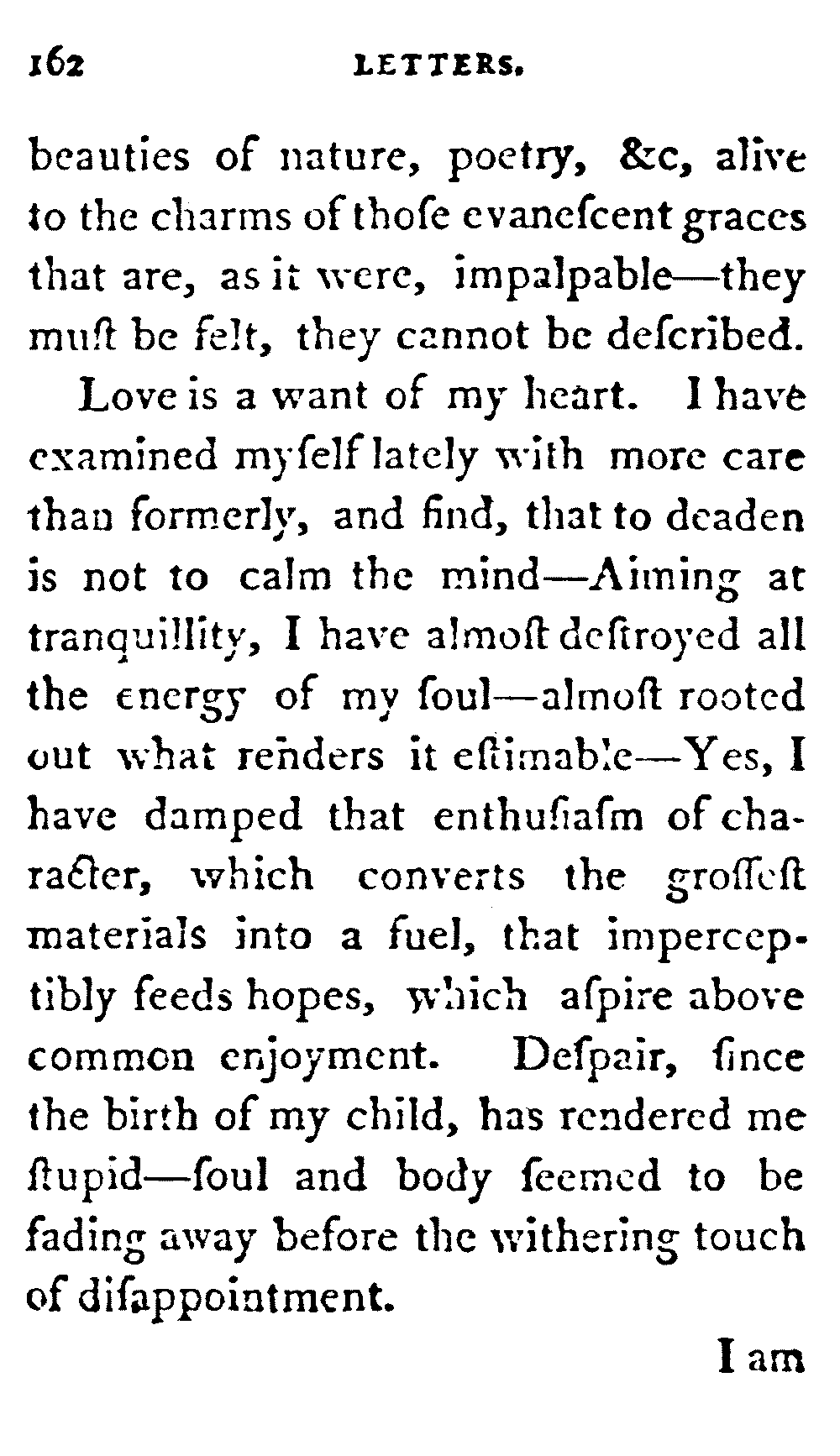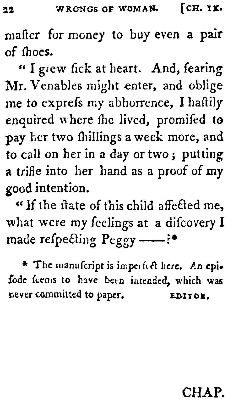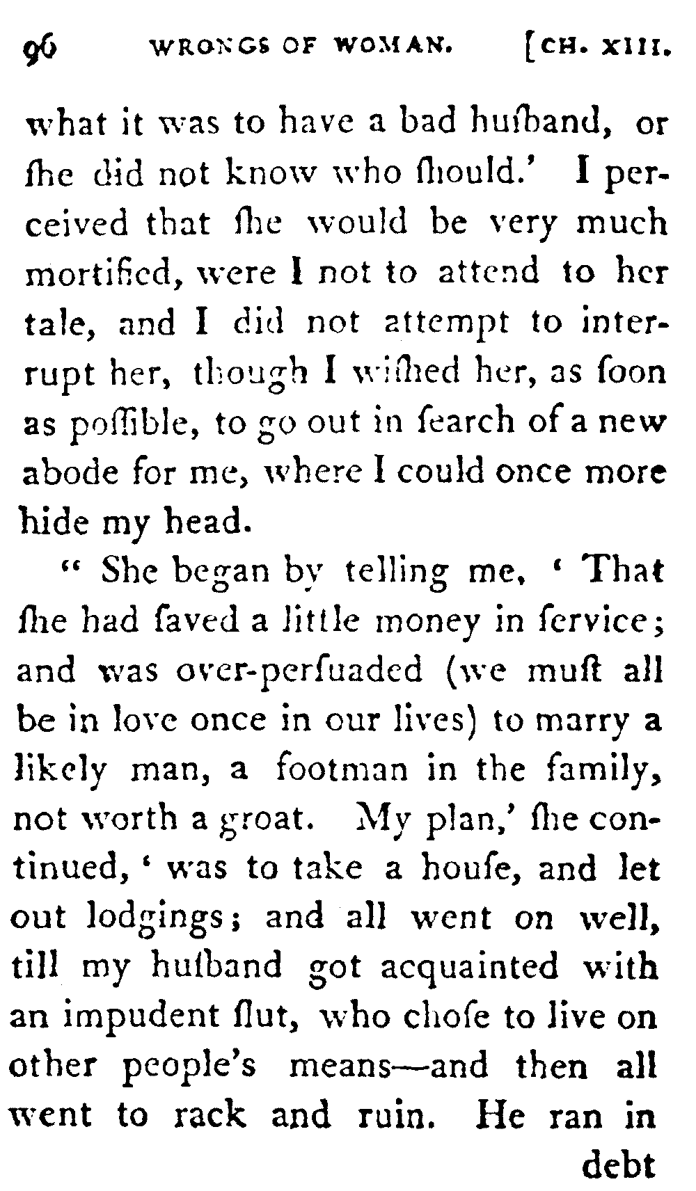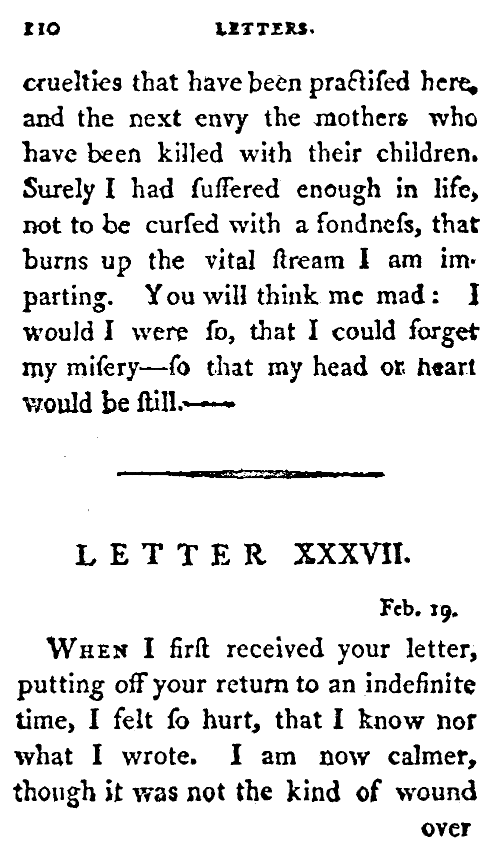 The books she had obtained, were[21] soon devoured, by one who had no other resource to escape from sorrow, and the feverish dreams of ideal wretchedness or felicity, which equally weaken the intoxicated sensibility. Writing was then the only alternative, and she wrote some rhapsodies descriptive of the state of her mind; but the events of her past life pressing on her, she resolved circumstantially to relate them, with the sentiments that experience, and more matured reason, would naturally suggest. They might perhaps instruct her daughter, and shield her from the misery, the tyranny, her mother knew not how to avoid.