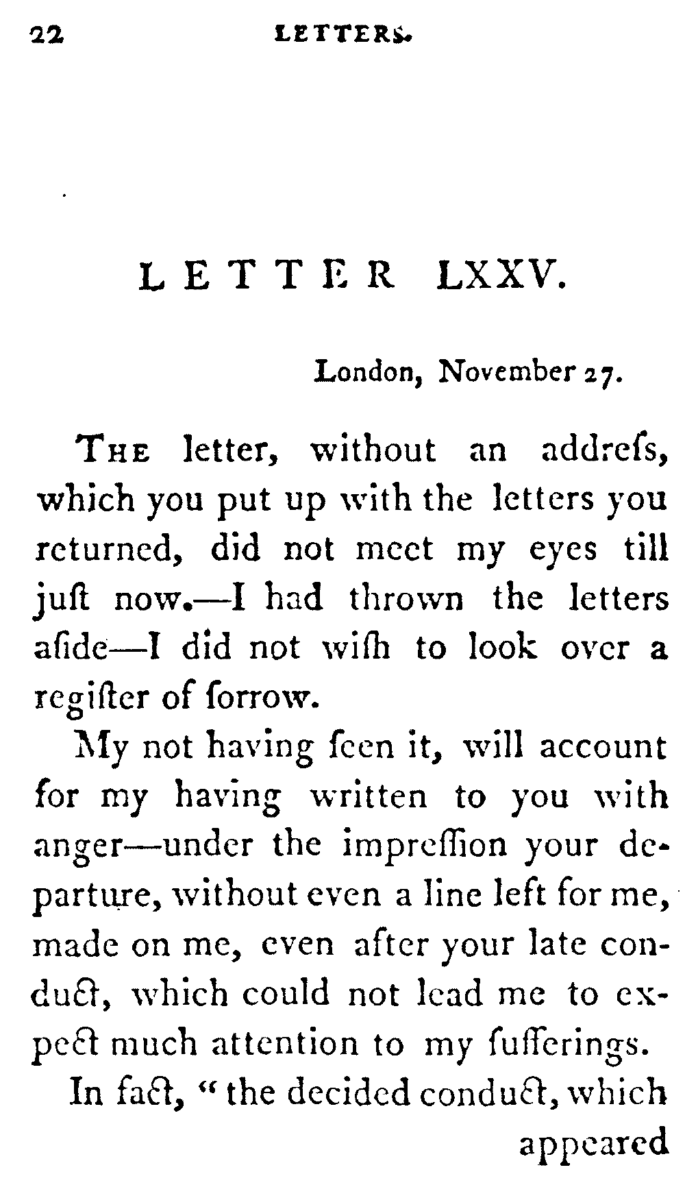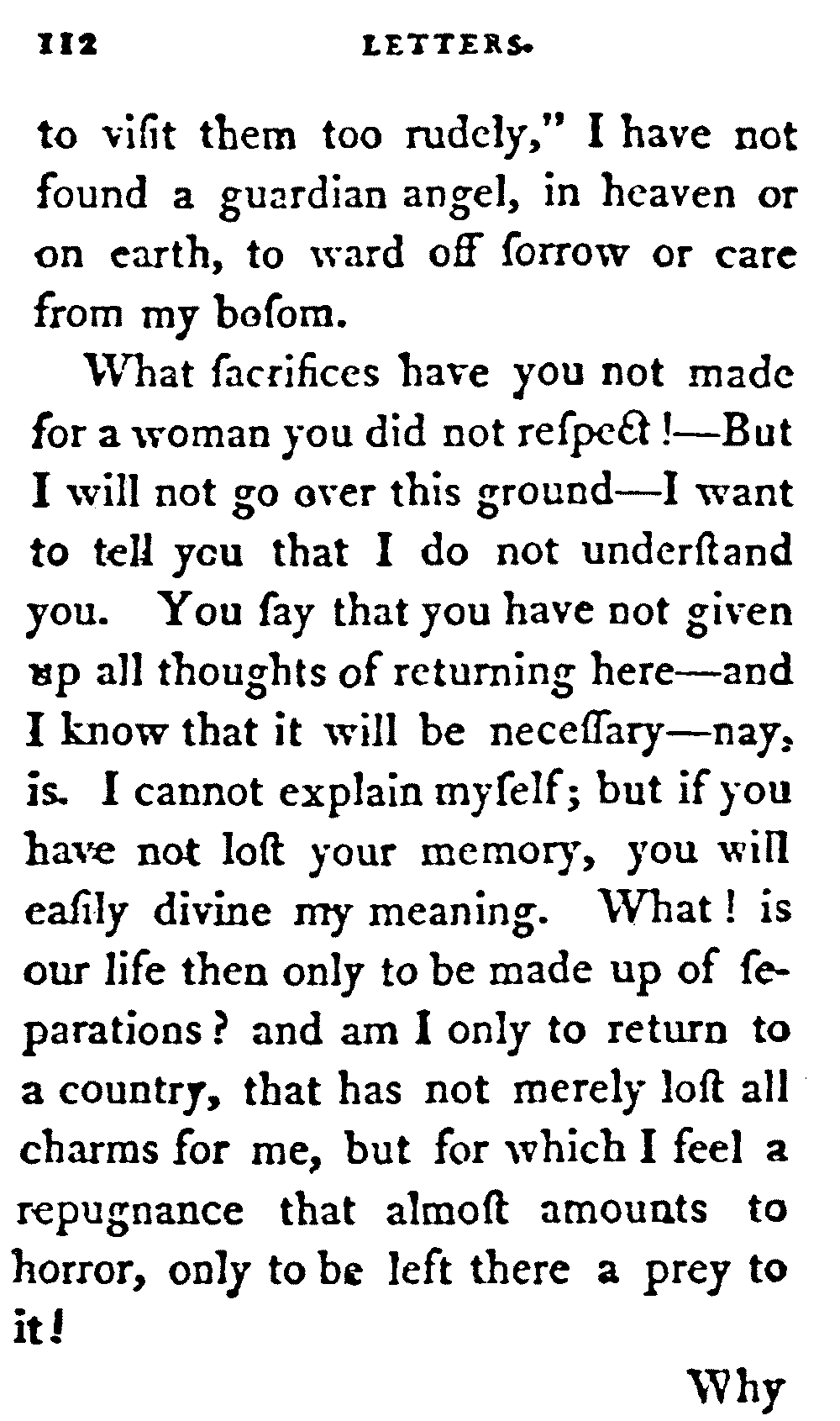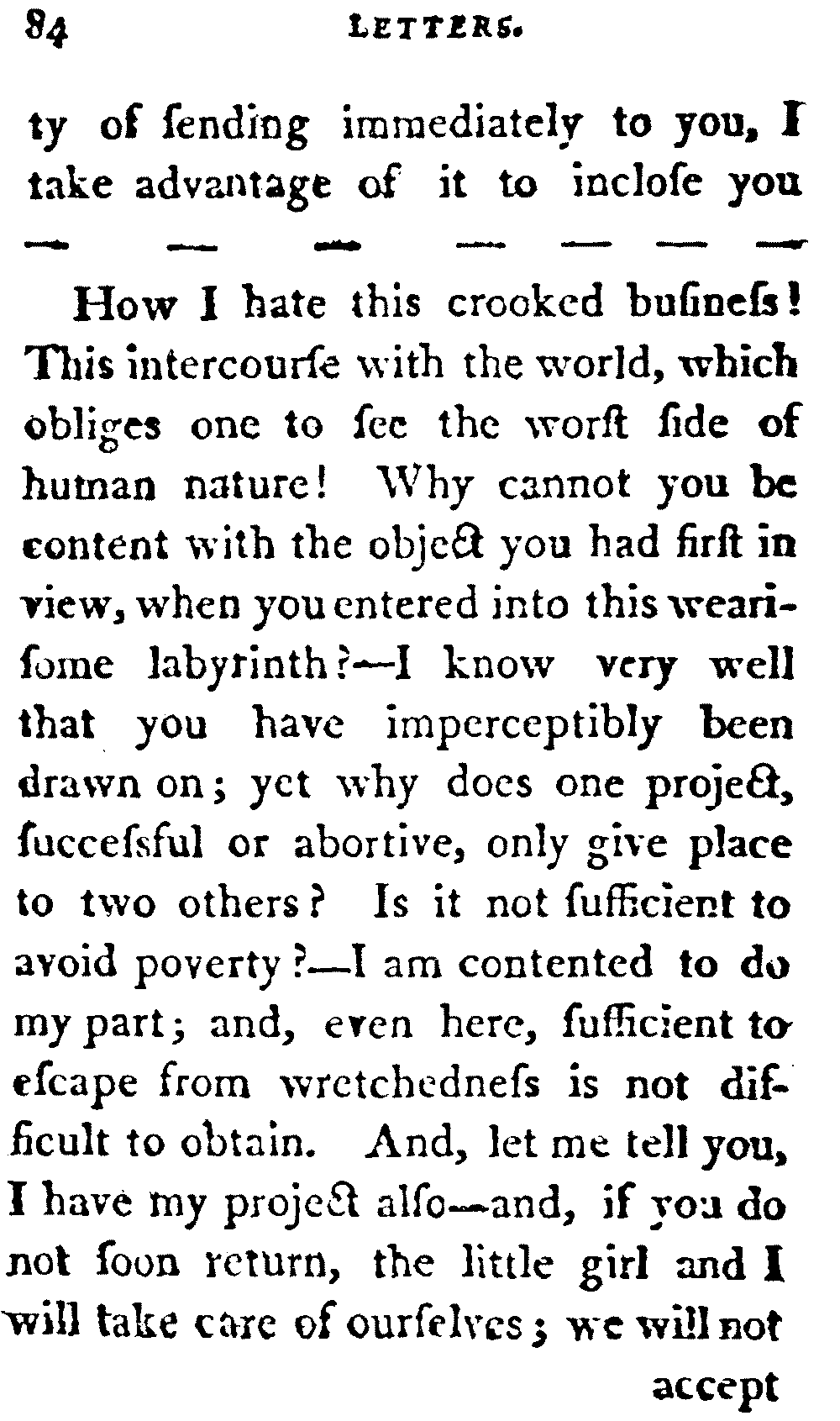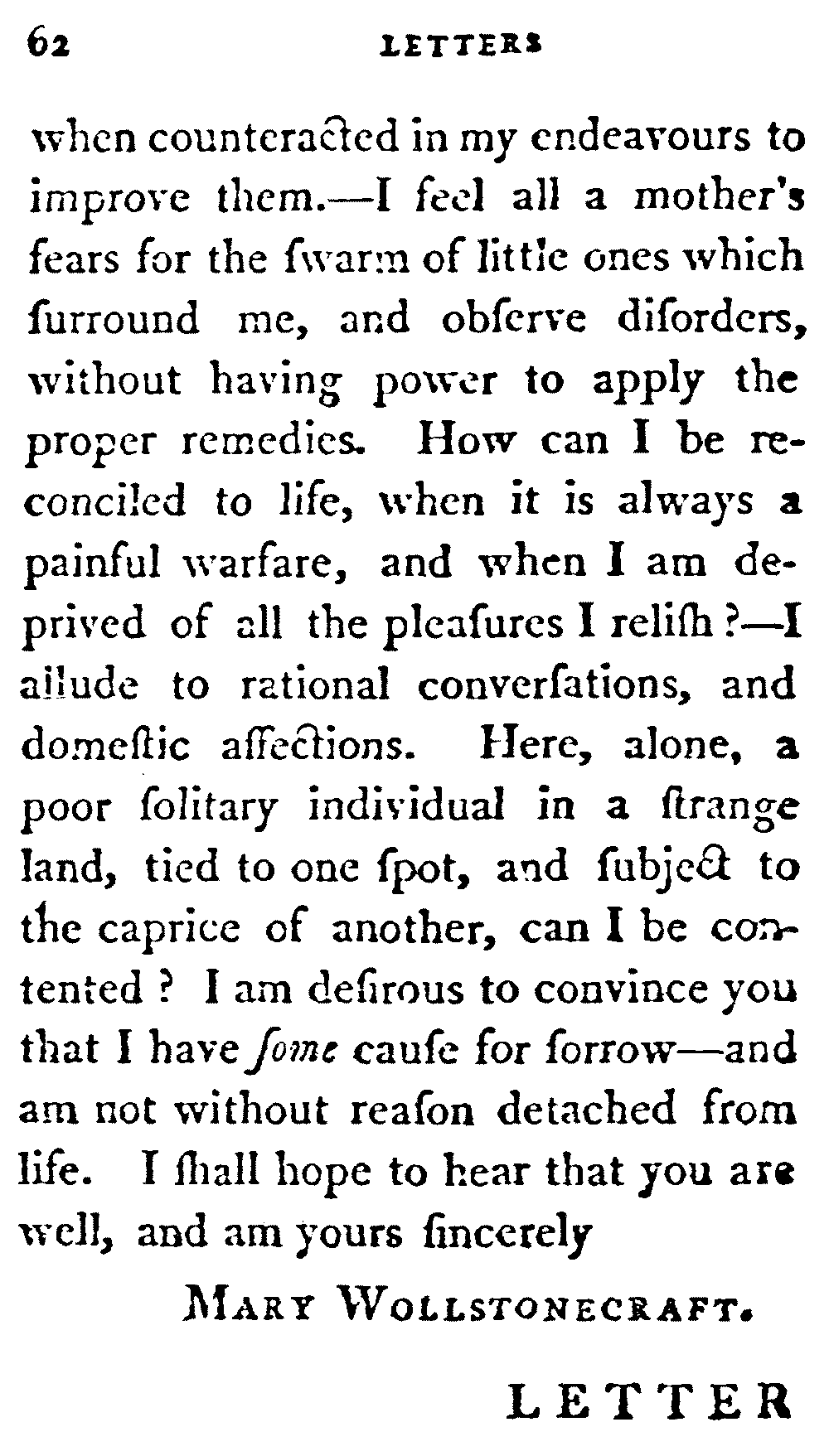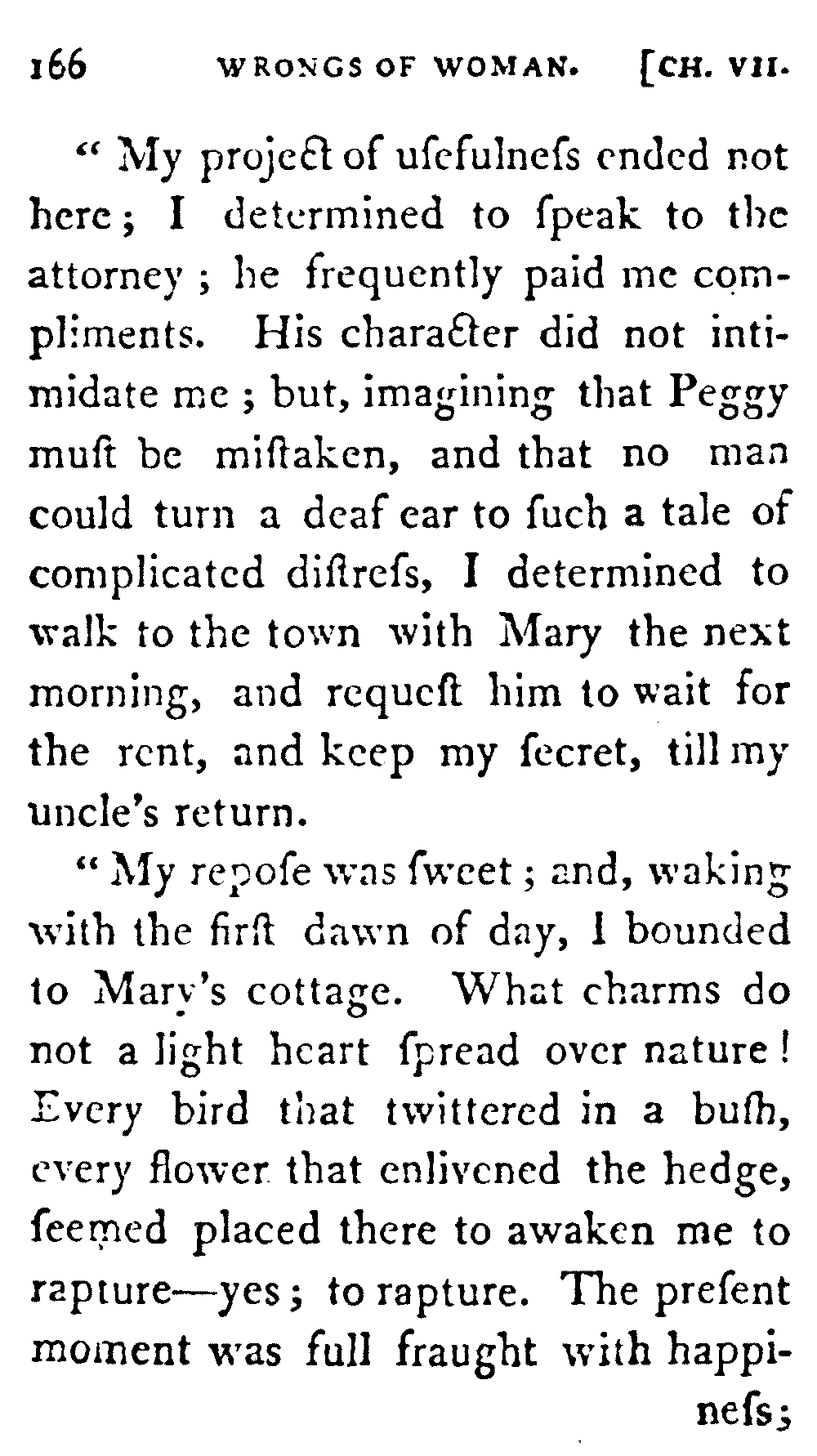 The books she had obtained, were[21] soon devoured, by one who had no other resource to escape from sorrow, and the feverish dreams of ideal wretchedness or felicity, which equally weaken the intoxicated sensibility. Writing was then the only alternative, and she wrote some rhapsodies descriptive of the state of her mind; but the events of her past life pressing on her, she resolved circumstantially to relate them, with the sentiments that experience, and more matured reason, would naturally suggest. They might perhaps instruct her daughter, and shield her from the misery, the tyranny, her mother knew not how to avoid.