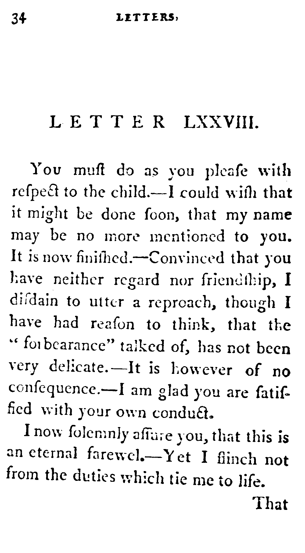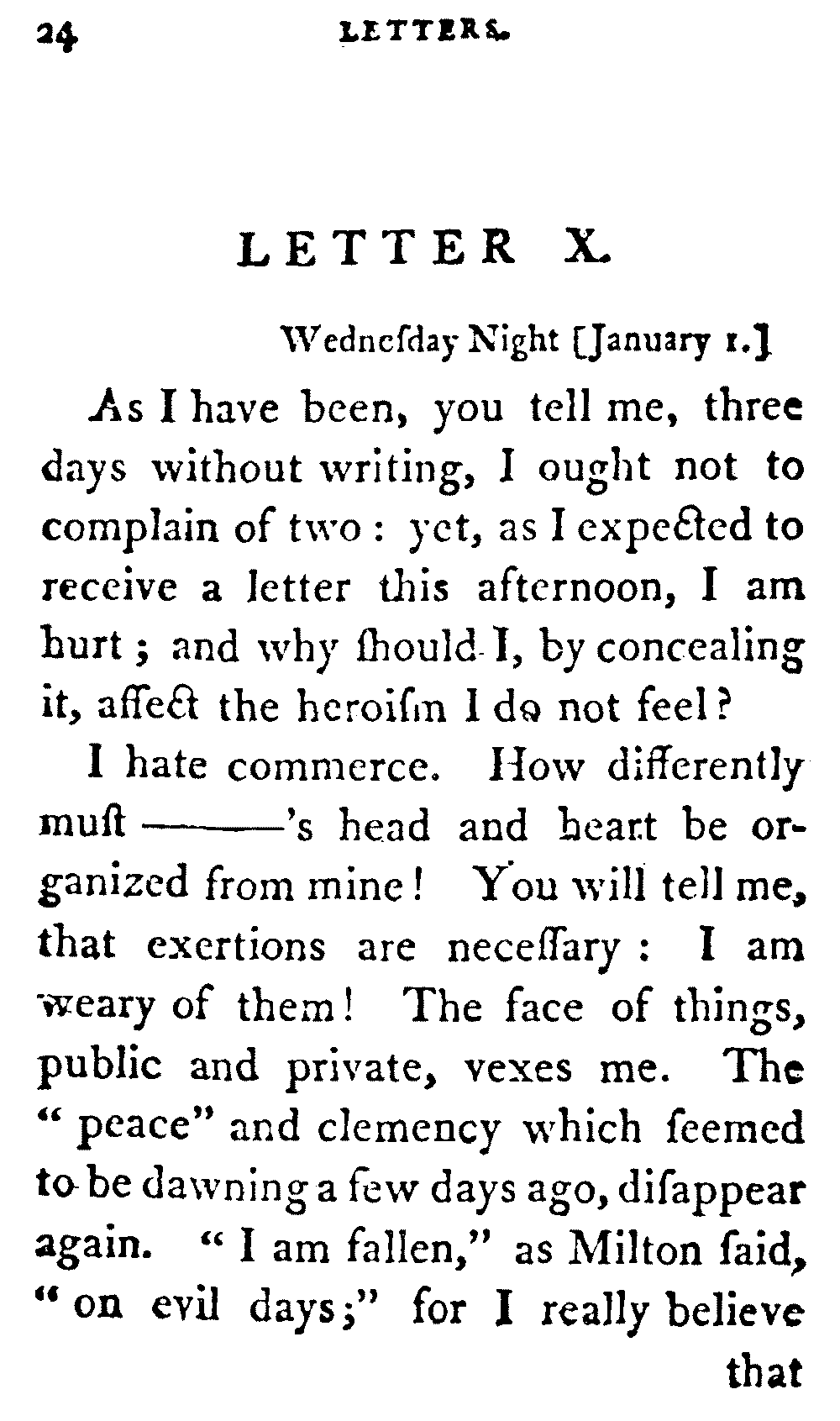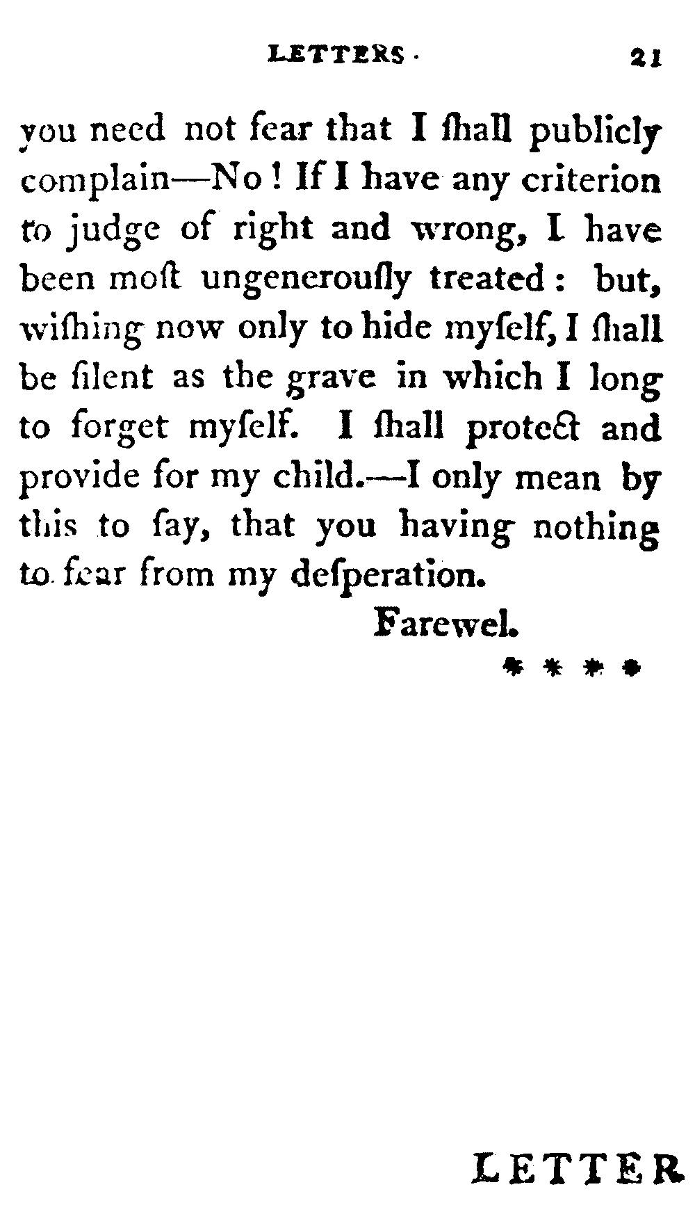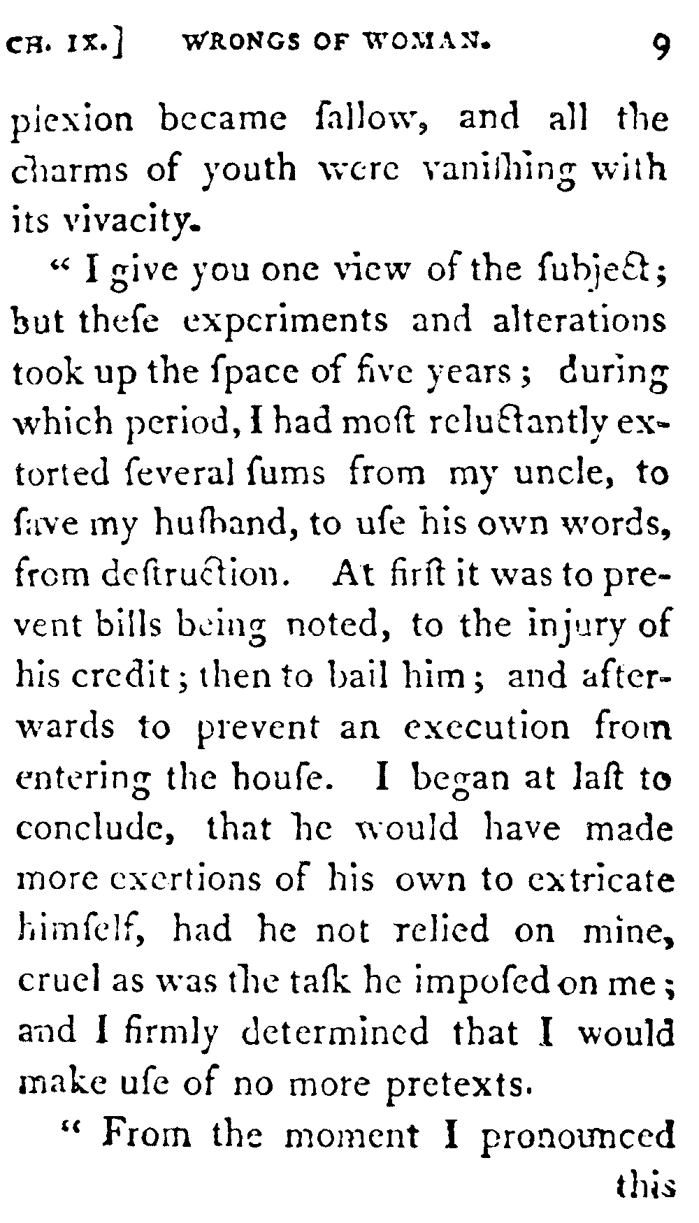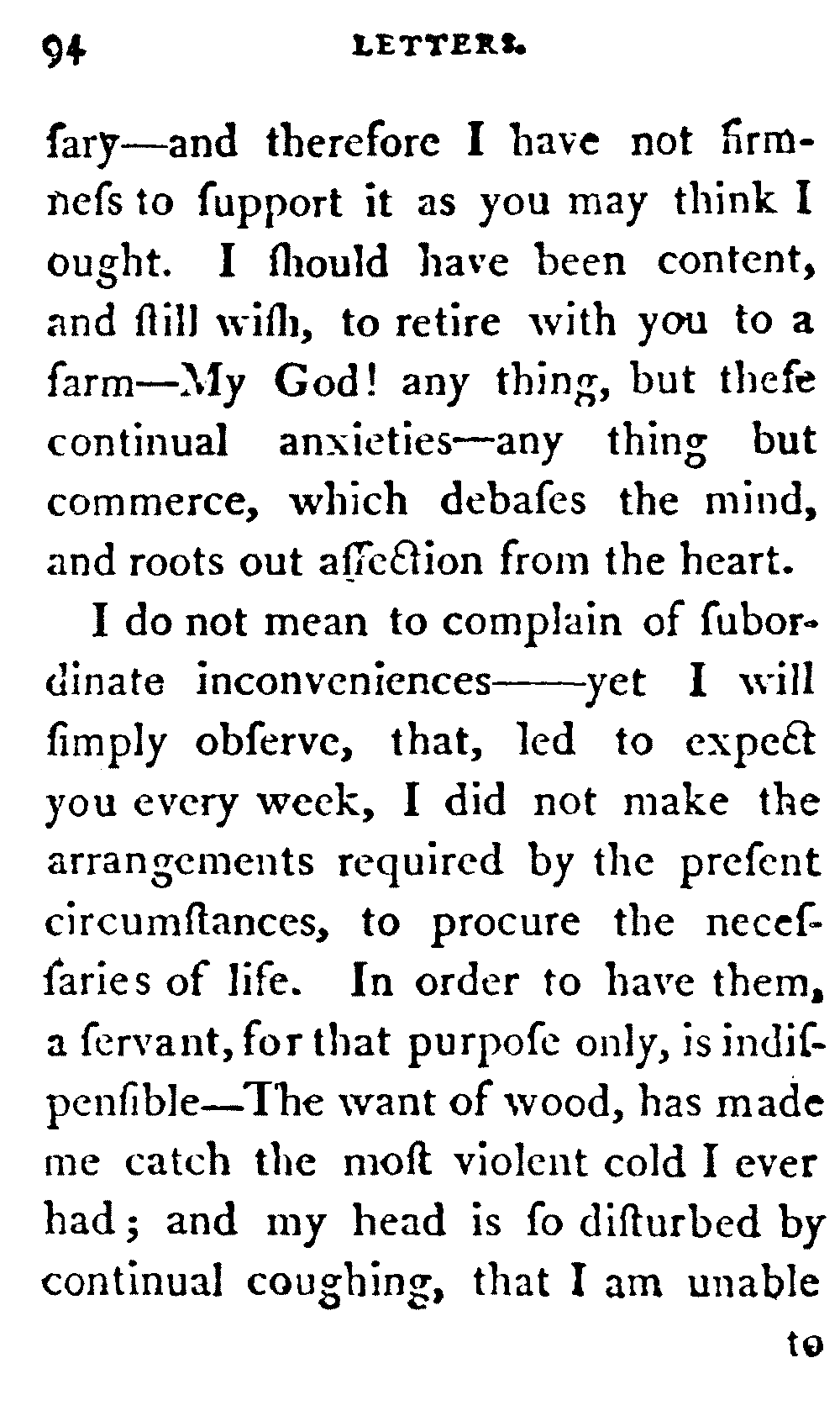The books she had obtained, were[21] soon devoured, by one who had no other resource to escape from sorrow, and the feverish dreams of ideal wretchedness or felicity, which equally weaken the intoxicated sensibility. Writing was then the only alternative, and she wrote some rhapsodies descriptive of the state of her mind; but the events of her past life pressing on her, she resolved circumstantially to relate them, with the sentiments that experience, and more matured reason, would naturally suggest. They might perhaps instruct her daughter, and shield her from the misery, the tyranny, her mother knew not how to avoid.