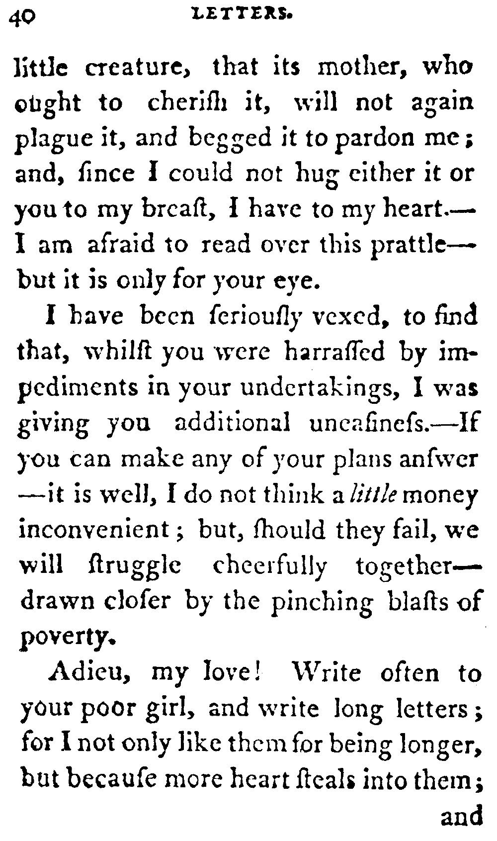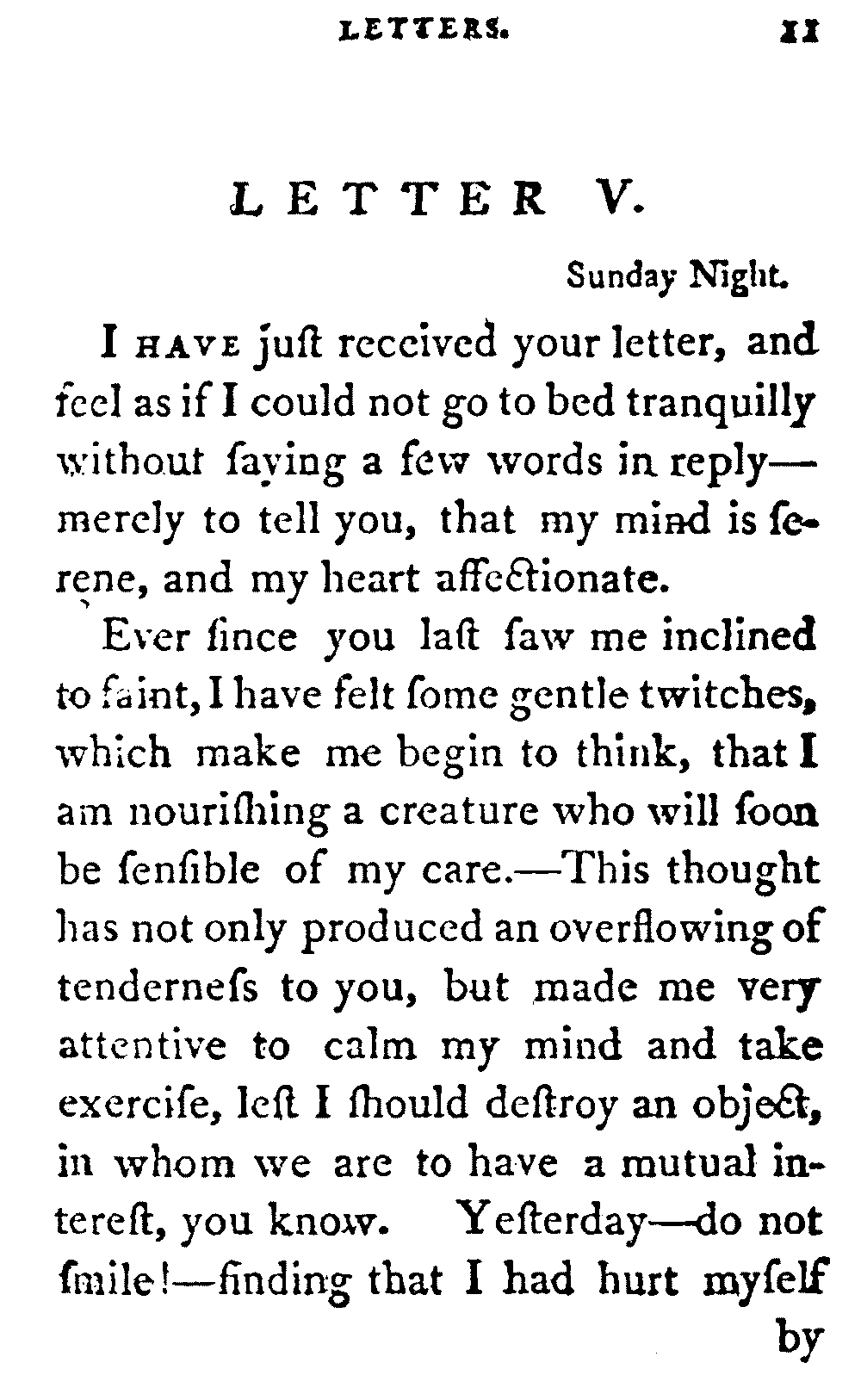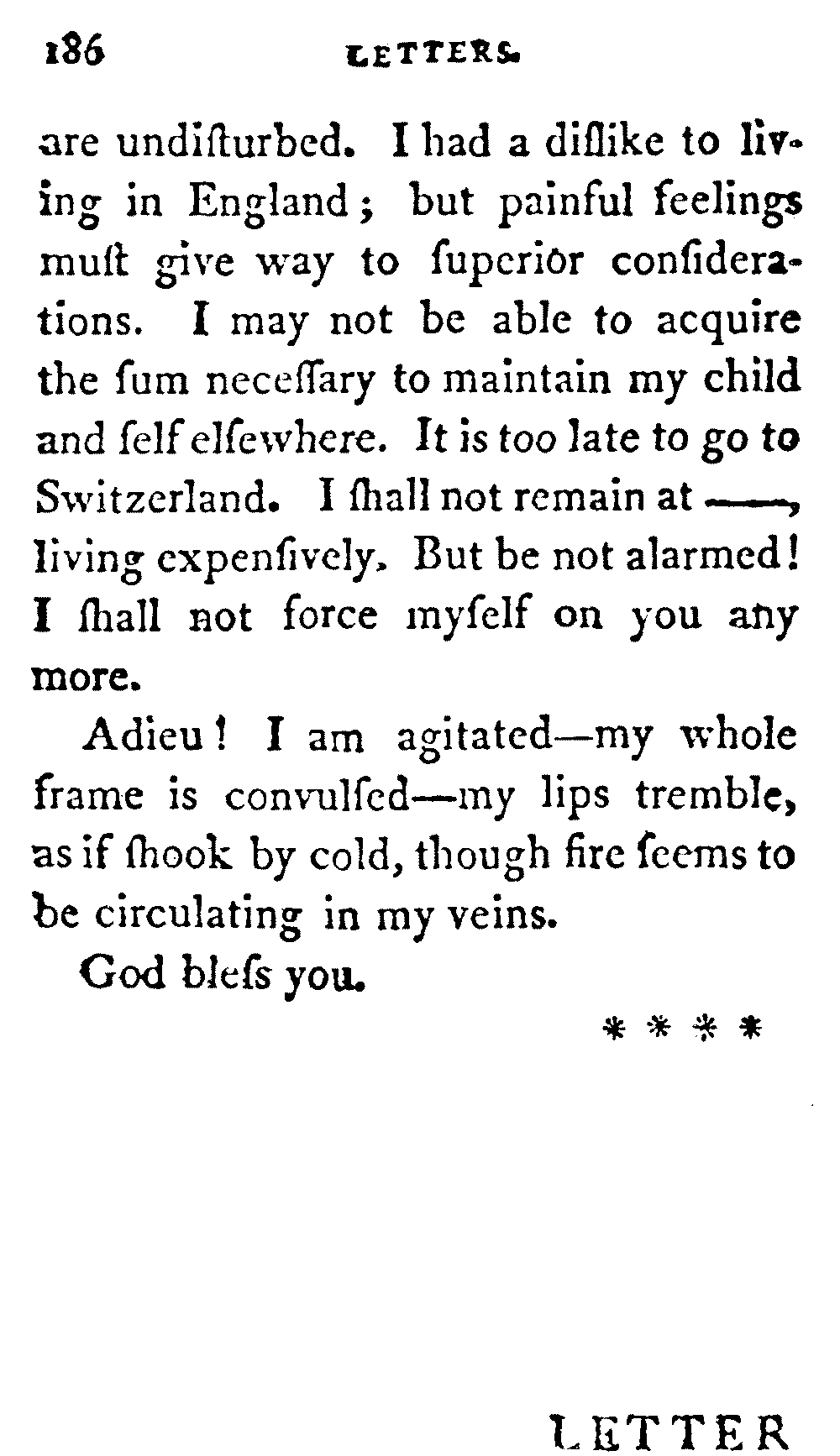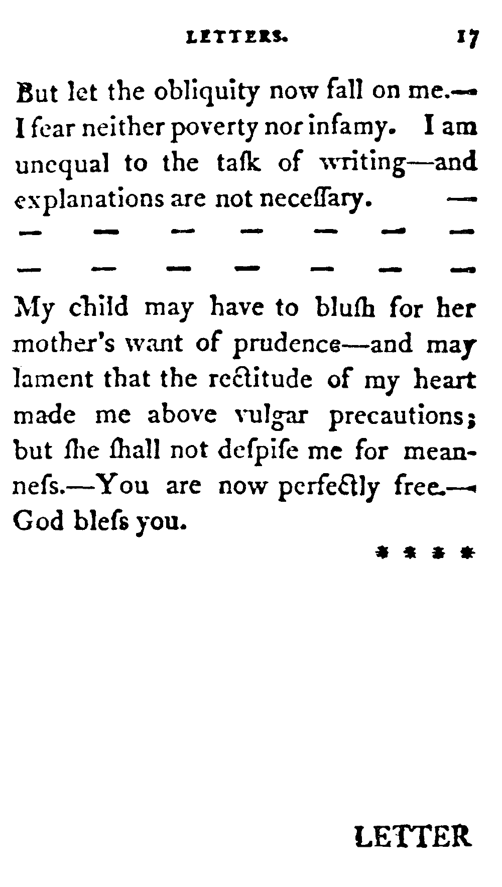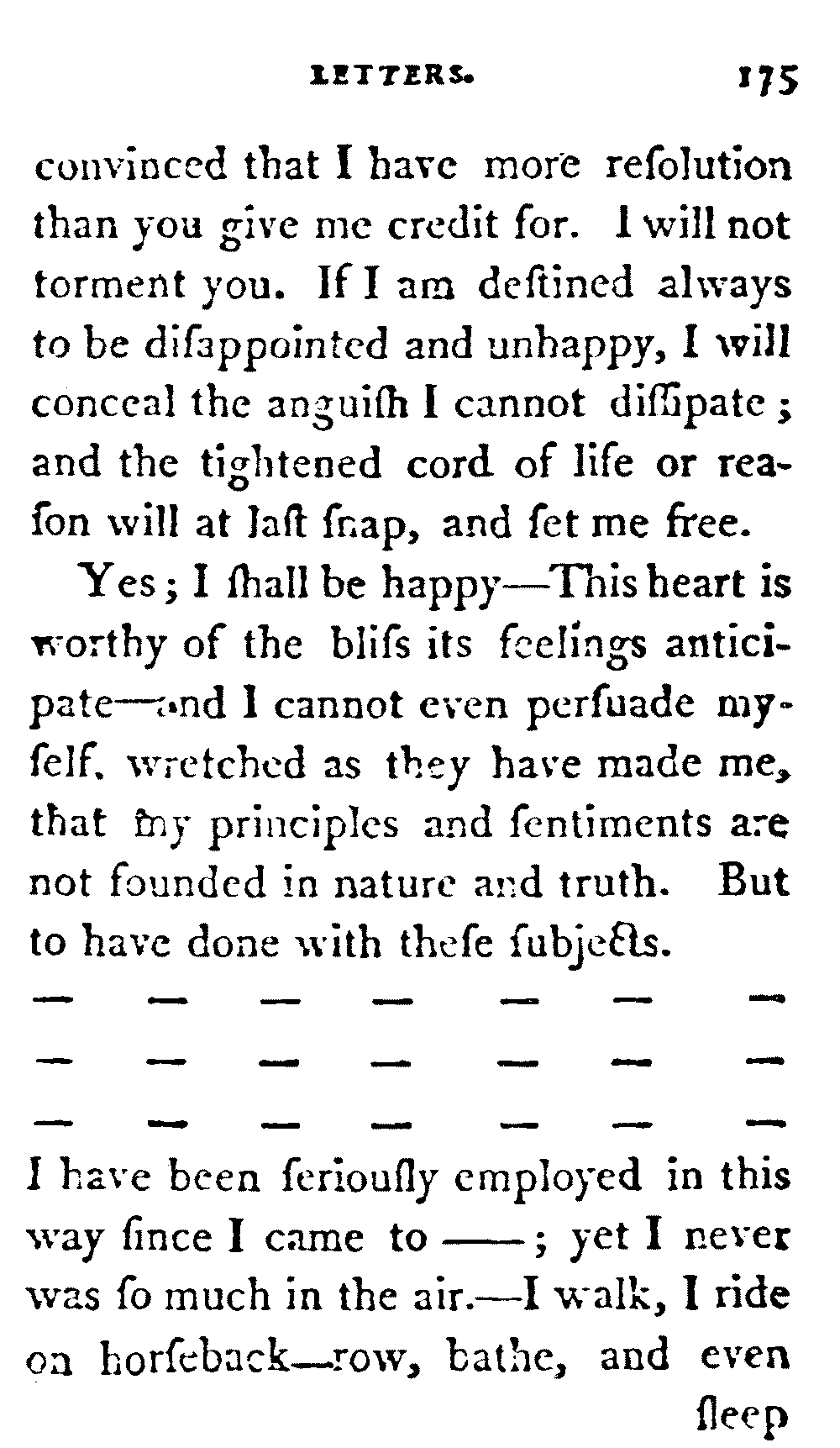 The books she had obtained, were[21] soon devoured, by one who had no other resource to escape from sorrow, and the feverish dreams of ideal wretchedness or felicity, which equally weaken the intoxicated sensibility. Writing was then the only alternative, and she wrote some rhapsodies descriptive of the state of her mind; but the events of her past life pressing on her, she resolved circumstantially to relate them, with the sentiments that experience, and more matured reason, would naturally suggest. They might perhaps instruct her daughter, and shield her from the misery, the tyranny, her mother knew not how to avoid.