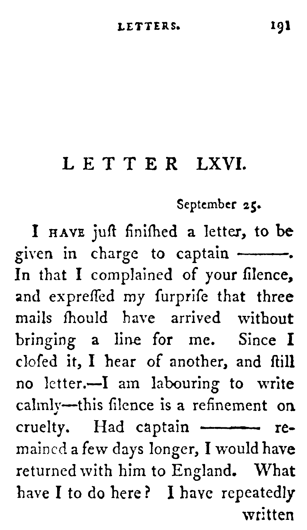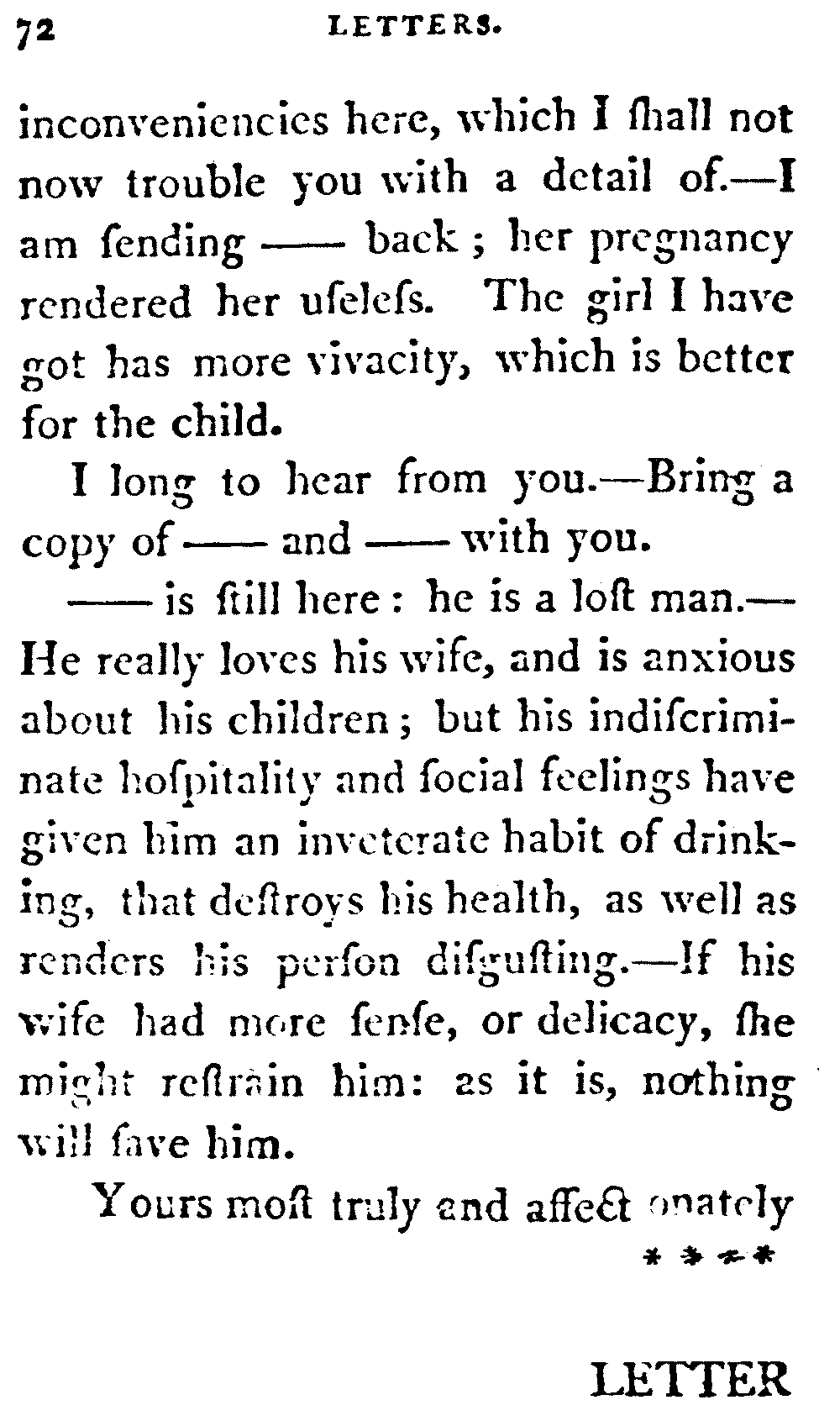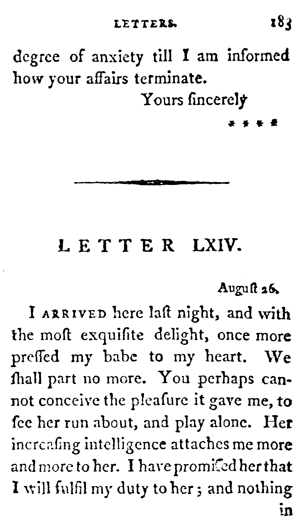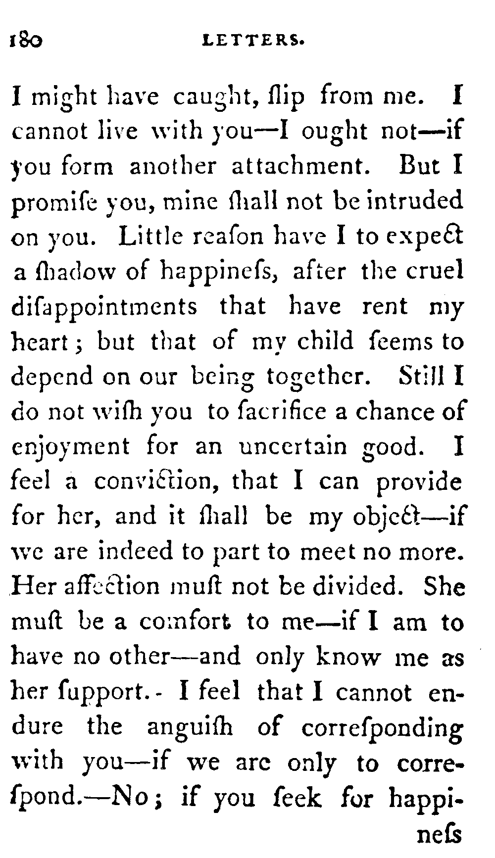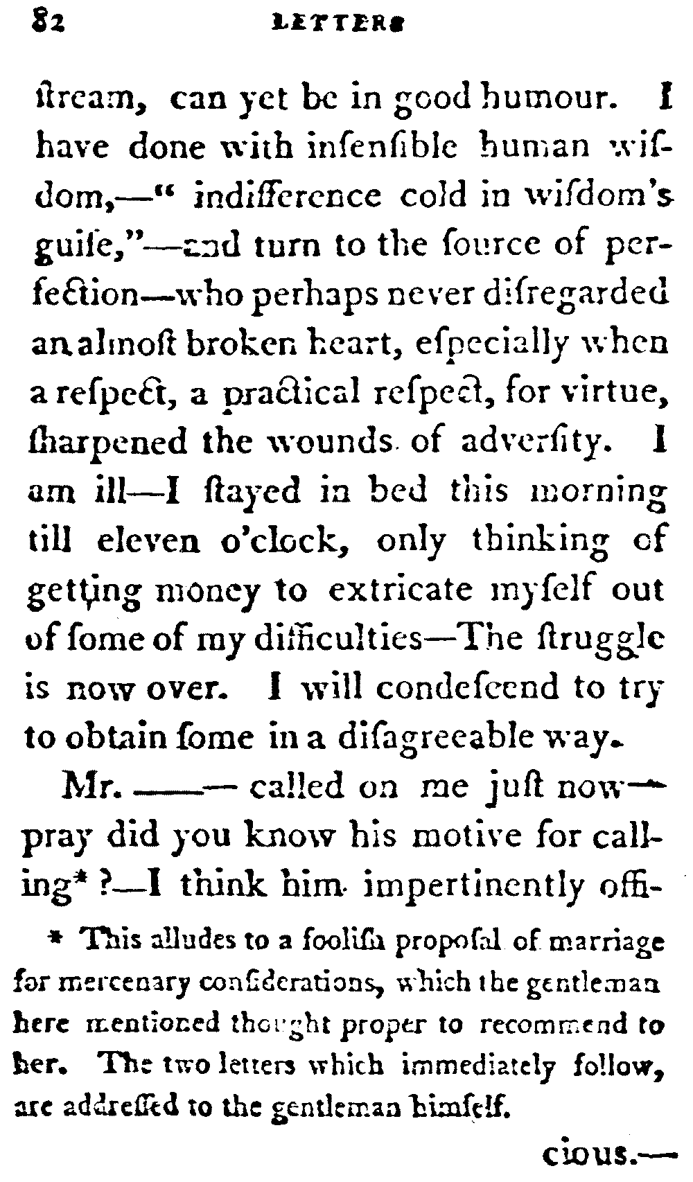 The books she had obtained, were[21] soon devoured, by one who had no other resource to escape from sorrow, and the feverish dreams of ideal wretchedness or felicity, which equally weaken the intoxicated sensibility. Writing was then the only alternative, and she wrote some rhapsodies descriptive of the state of her mind; but the events of her past life pressing on her, she resolved circumstantially to relate them, with the sentiments that experience, and more matured reason, would naturally suggest. They might perhaps instruct her daughter, and shield her from the misery, the tyranny, her mother knew not how to avoid.