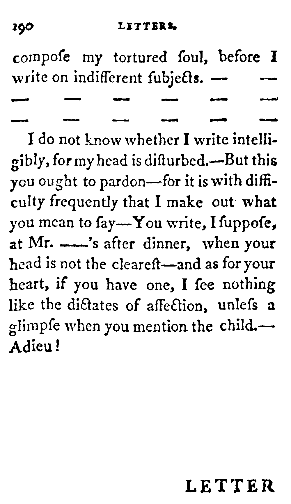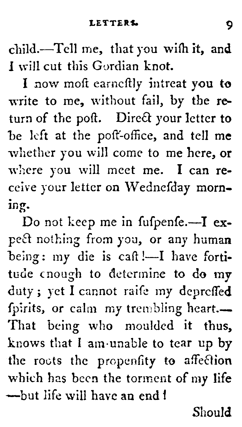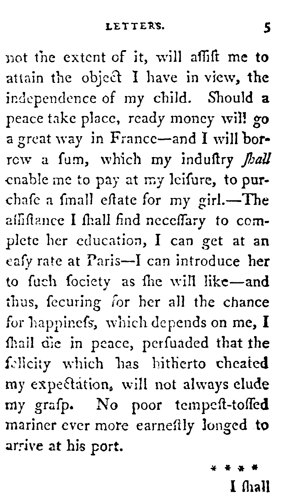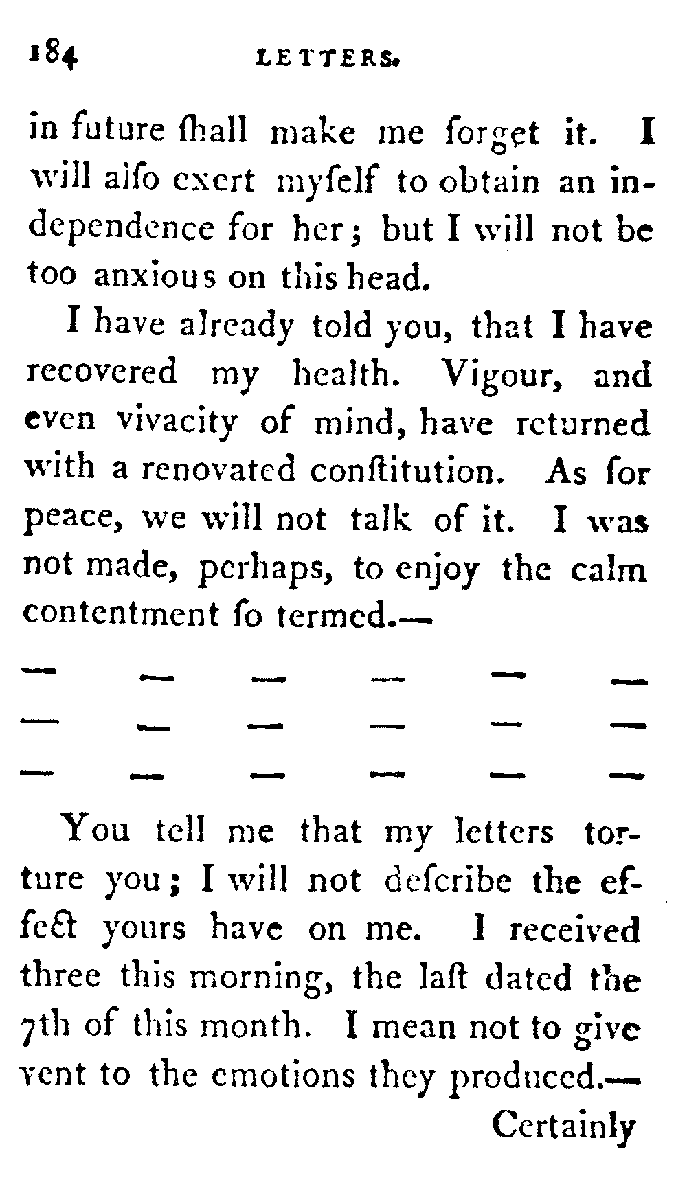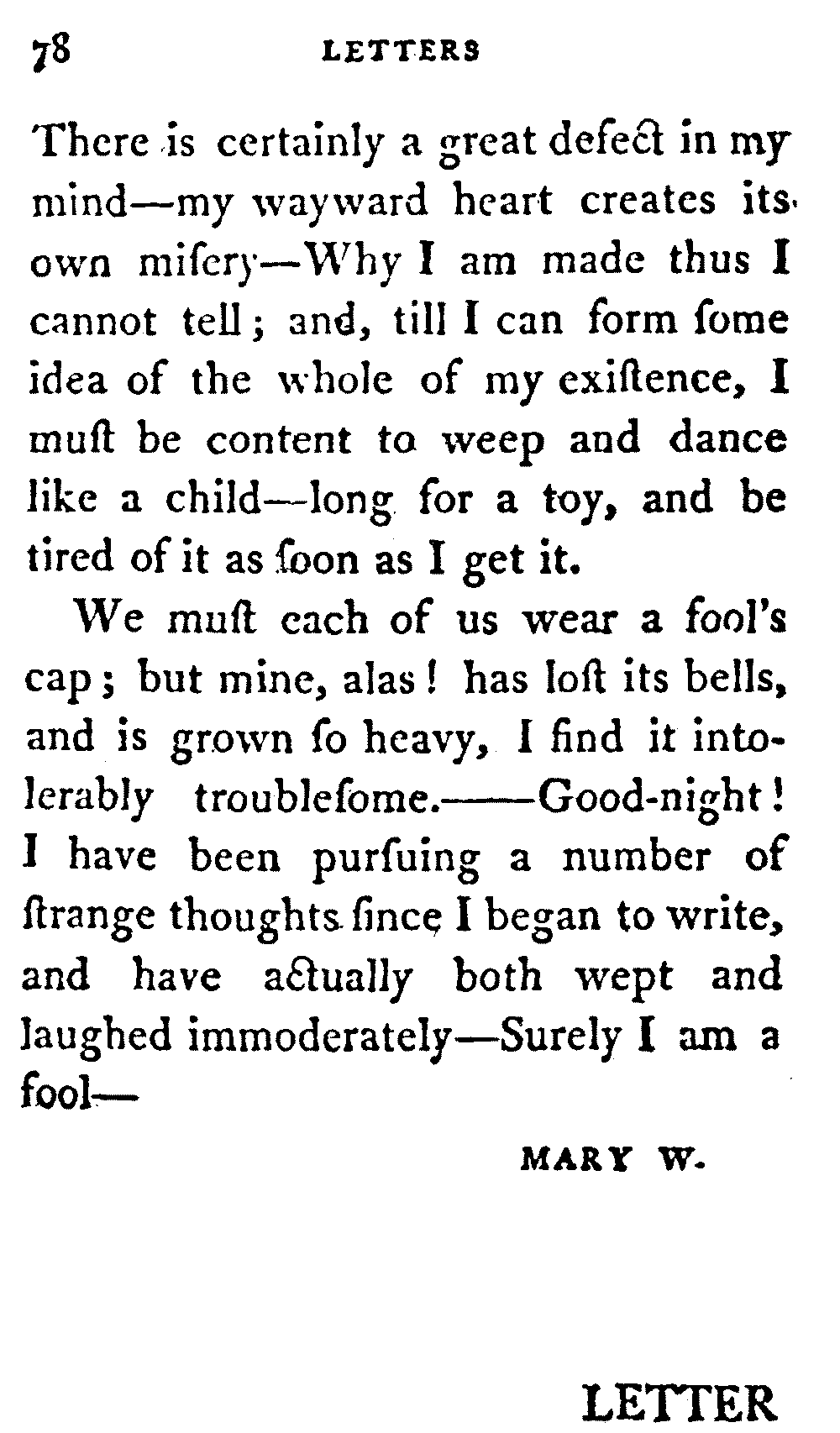 The books she had obtained, were[21] soon devoured, by one who had no other resource to escape from sorrow, and the feverish dreams of ideal wretchedness or felicity, which equally weaken the intoxicated sensibility. Writing was then the only alternative, and she wrote some rhapsodies descriptive of the state of her mind; but the events of her past life pressing on her, she resolved circumstantially to relate them, with the sentiments that experience, and more matured reason, would naturally suggest. They might perhaps instruct her daughter, and shield her from the misery, the tyranny, her mother knew not how to avoid.