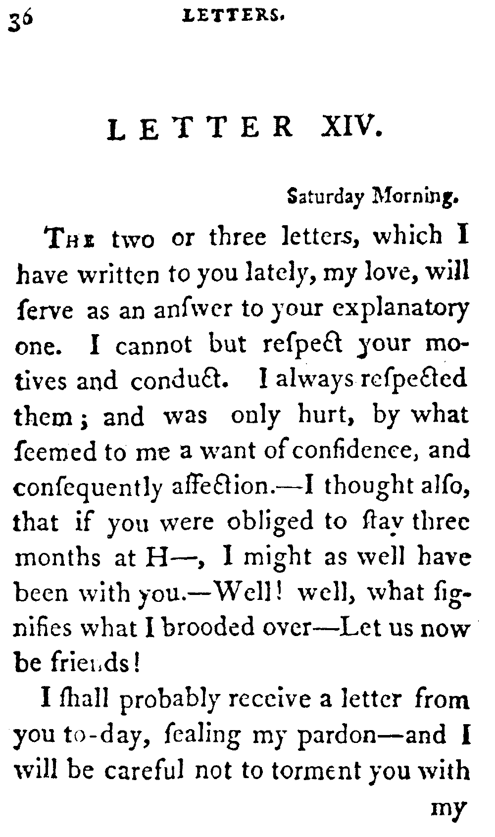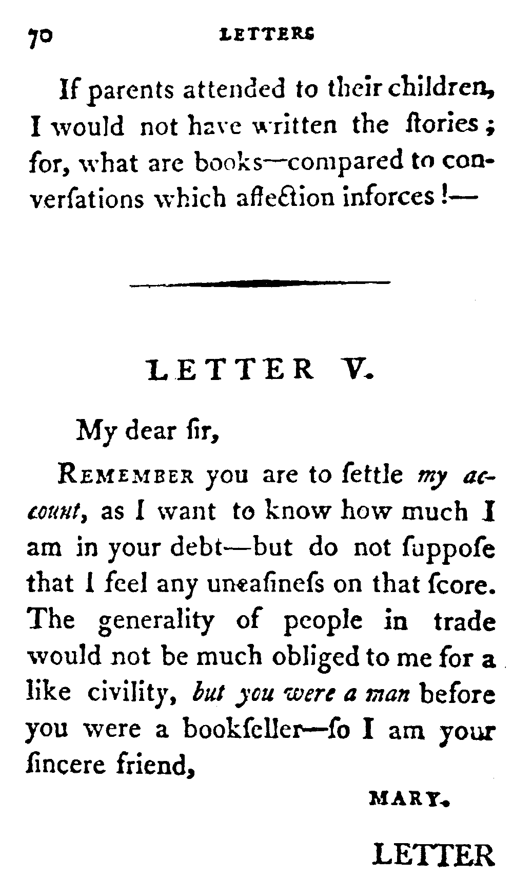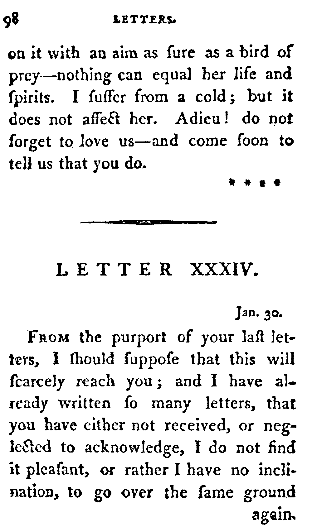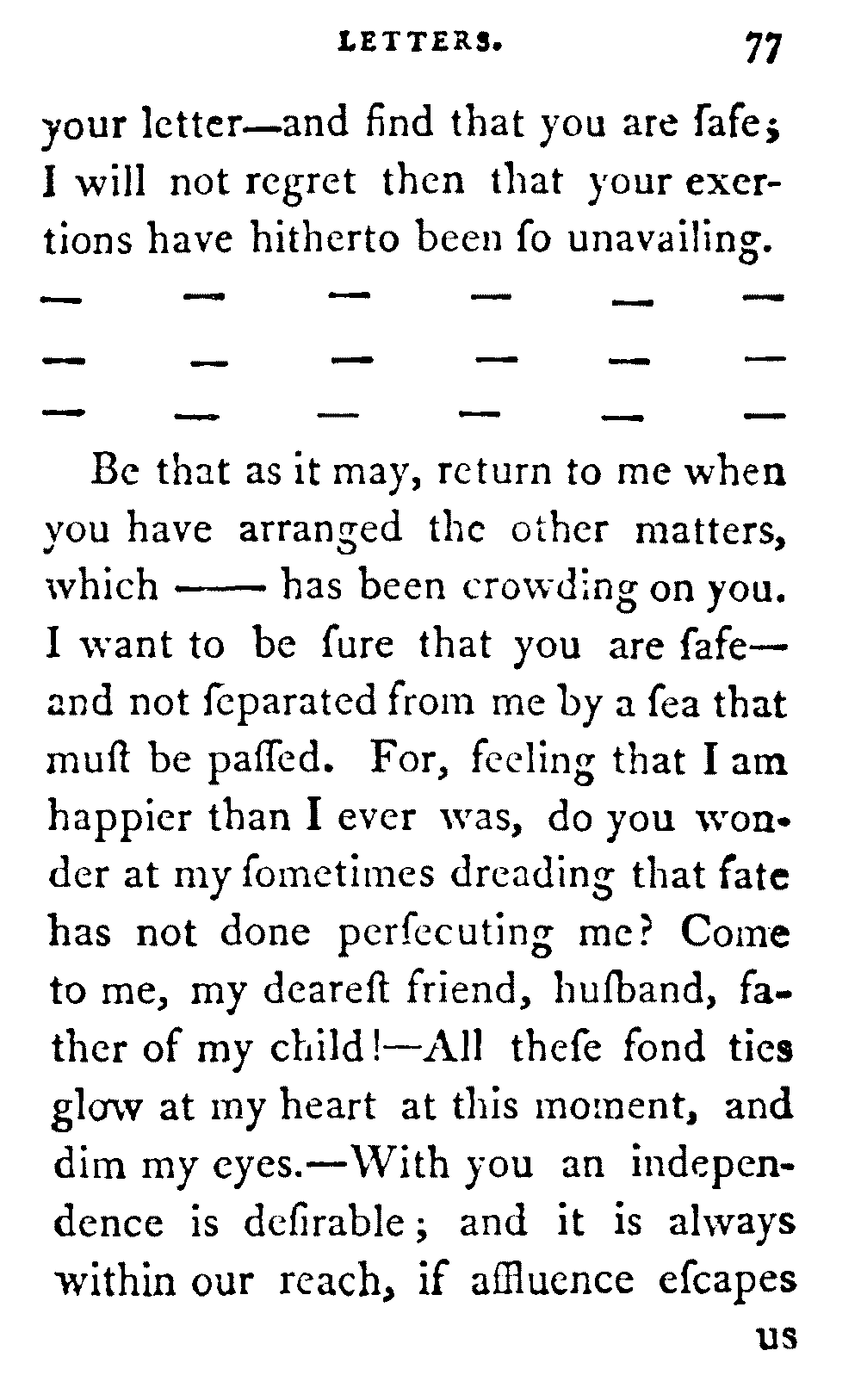 The books she had obtained, were[21] soon devoured, by one who had no other resource to escape from sorrow, and the feverish dreams of ideal wretchedness or felicity, which equally weaken the intoxicated sensibility. Writing was then the only alternative, and she wrote some rhapsodies descriptive of the state of her mind; but the events of her past life pressing on her, she resolved circumstantially to relate them, with the sentiments that experience, and more matured reason, would naturally suggest. They might perhaps instruct her daughter, and shield her from the misery, the tyranny, her mother knew not how to avoid.