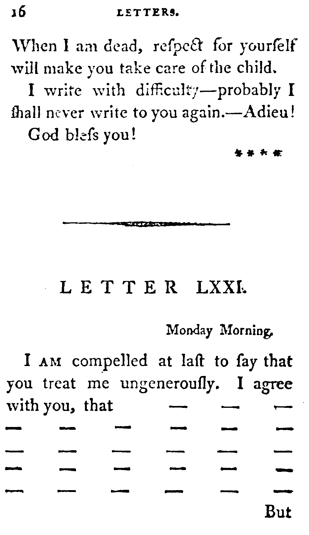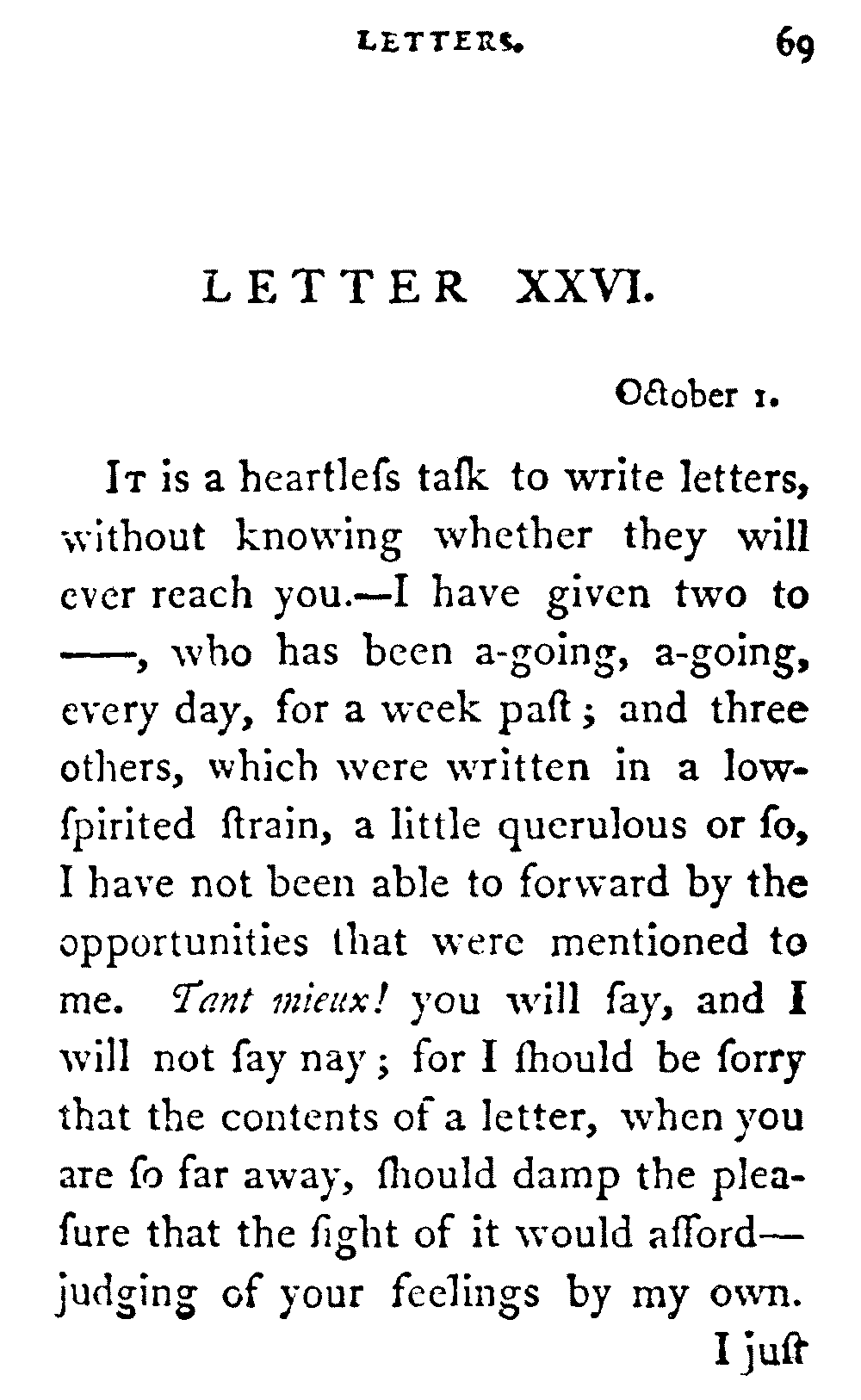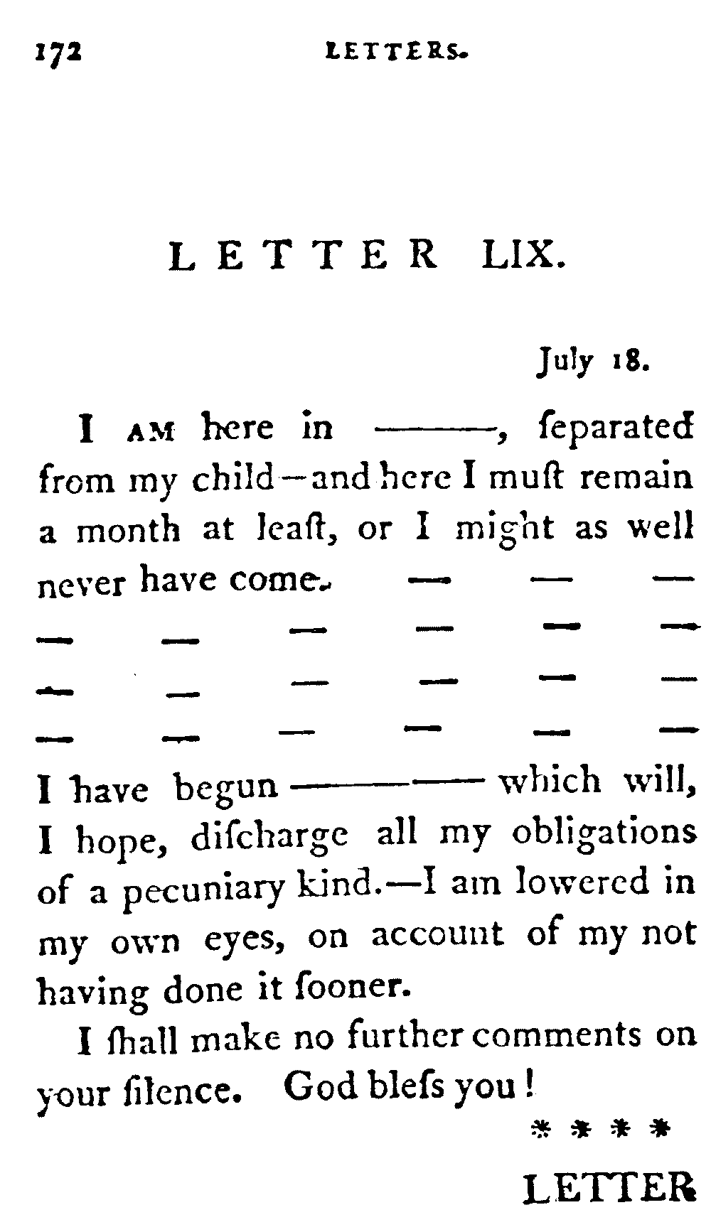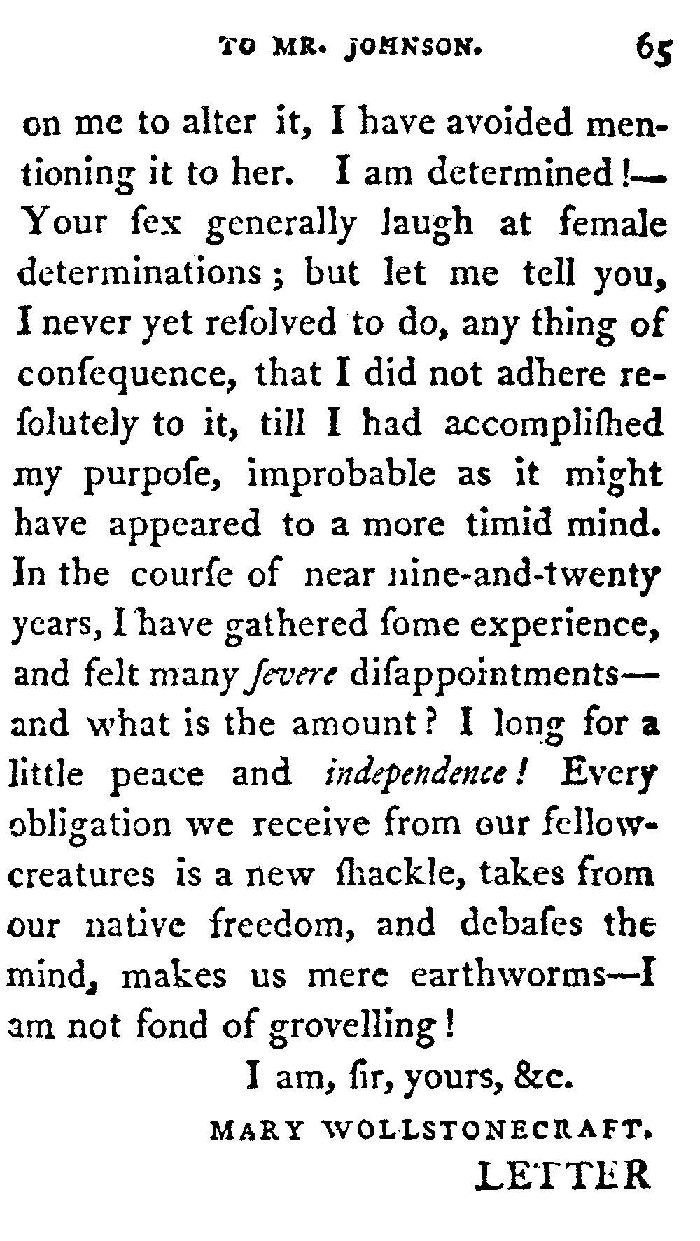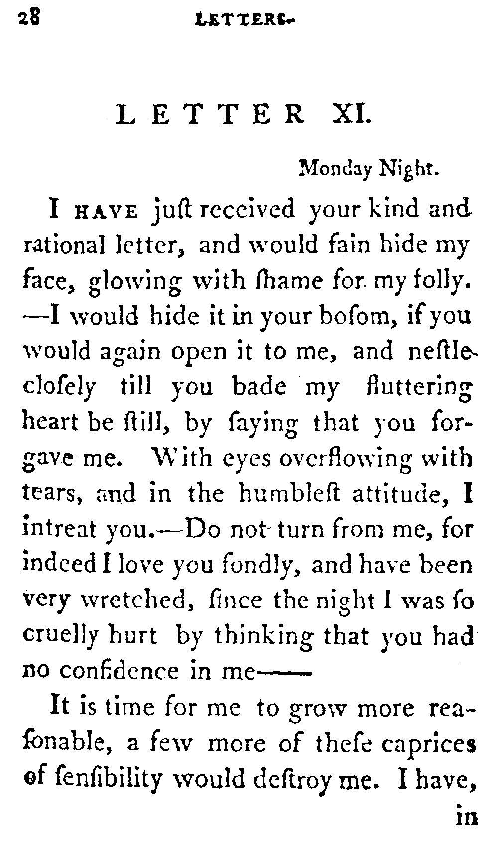 The books she had obtained, were[21] soon devoured, by one who had no other resource to escape from sorrow, and the feverish dreams of ideal wretchedness or felicity, which equally weaken the intoxicated sensibility. Writing was then the only alternative, and she wrote some rhapsodies descriptive of the state of her mind; but the events of her past life pressing on her, she resolved circumstantially to relate them, with the sentiments that experience, and more matured reason, would naturally suggest. They might perhaps instruct her daughter, and shield her from the misery, the tyranny, her mother knew not how to avoid.