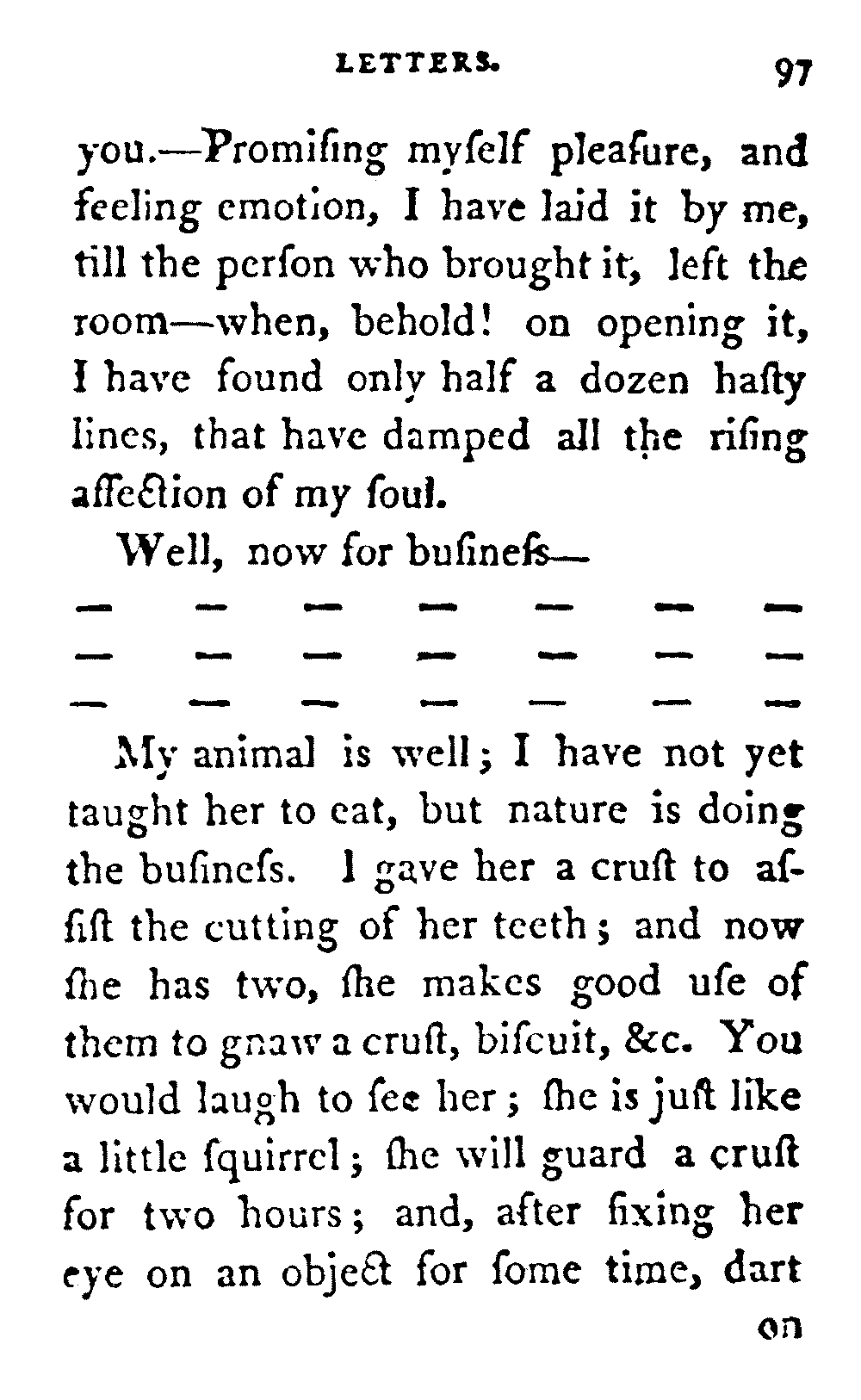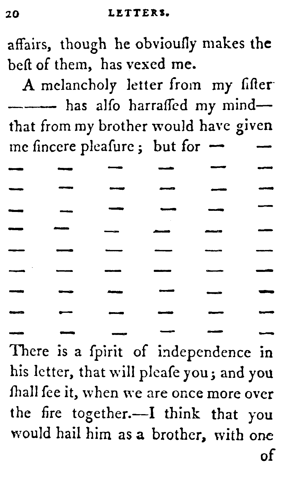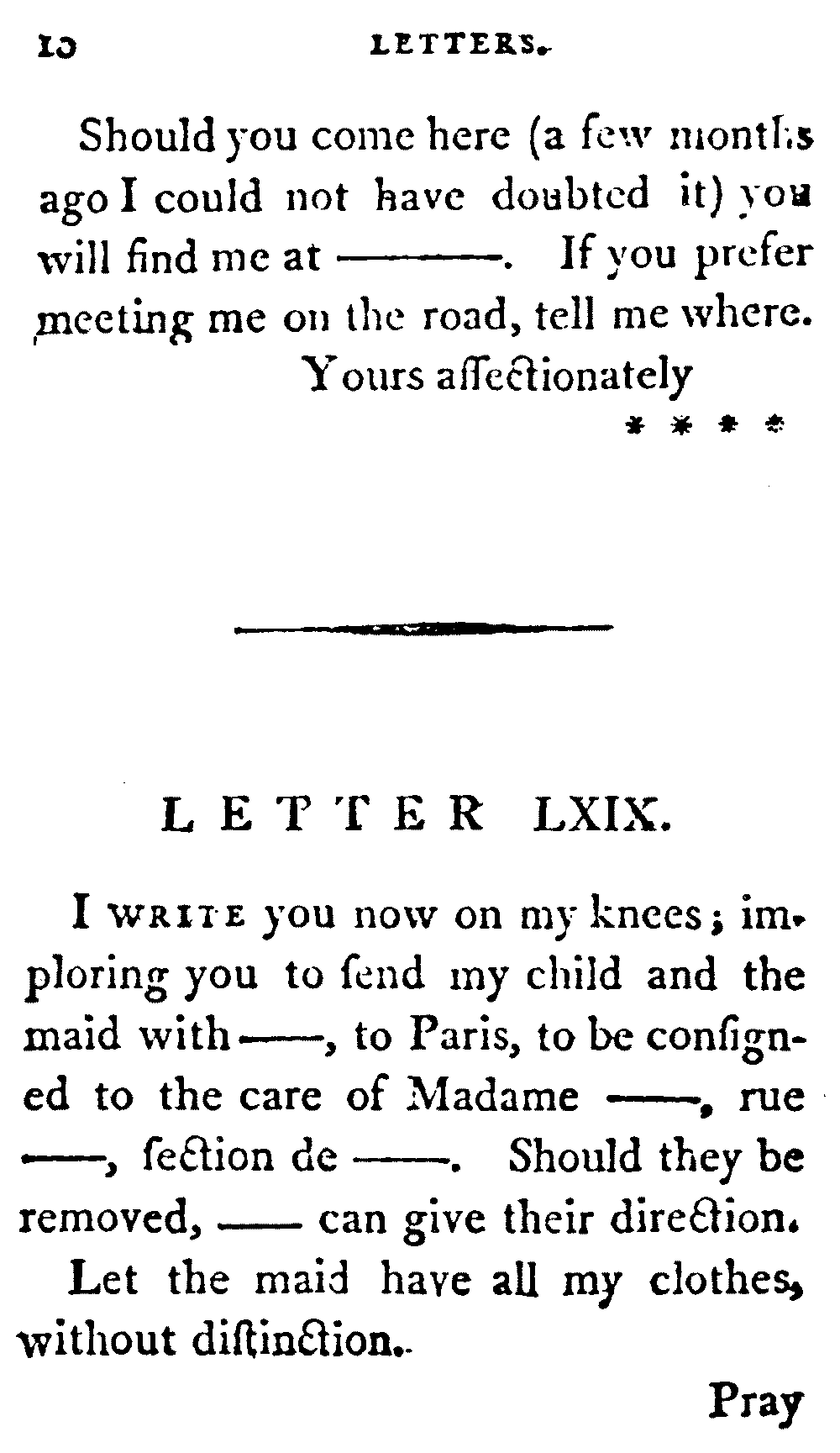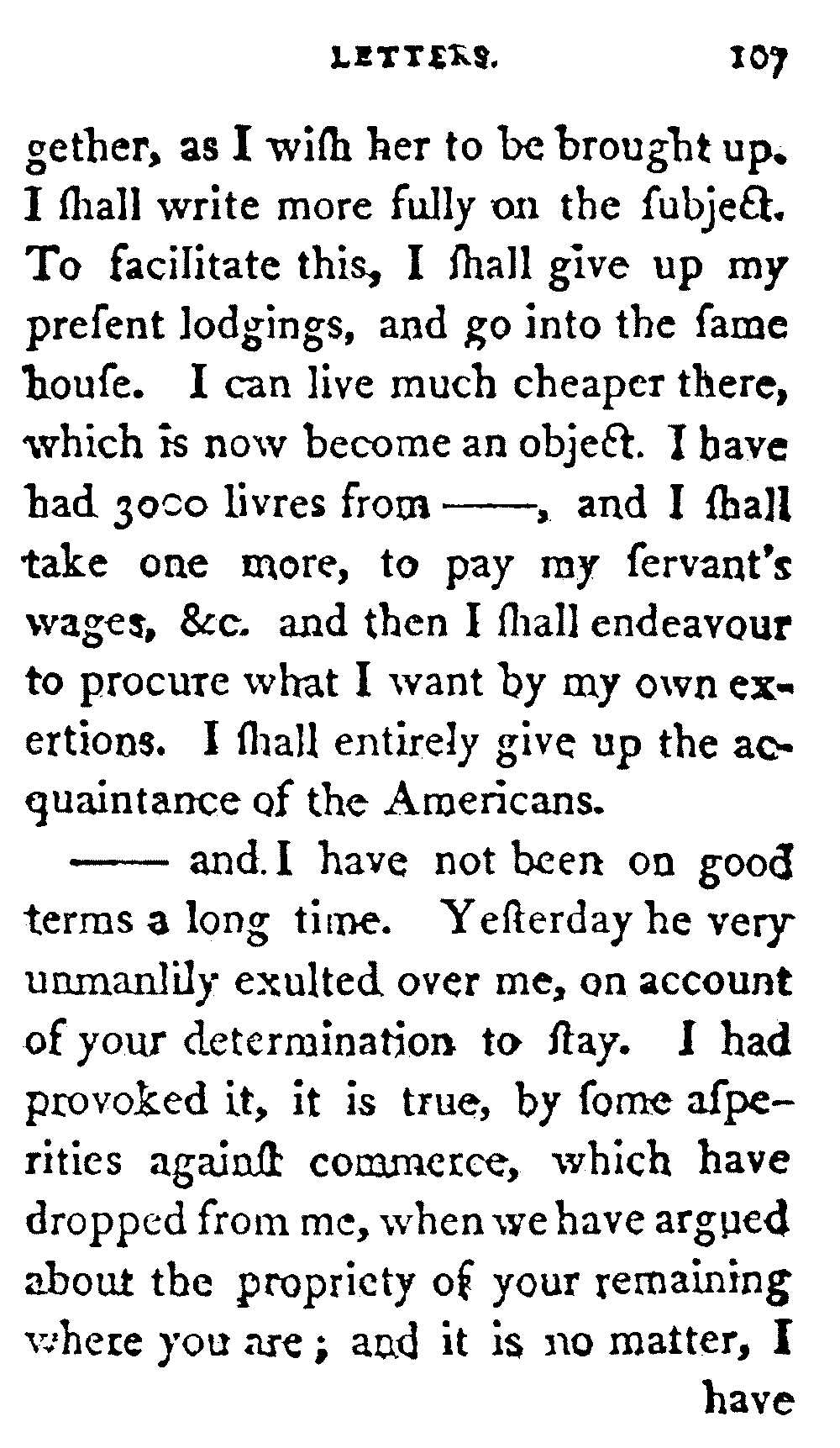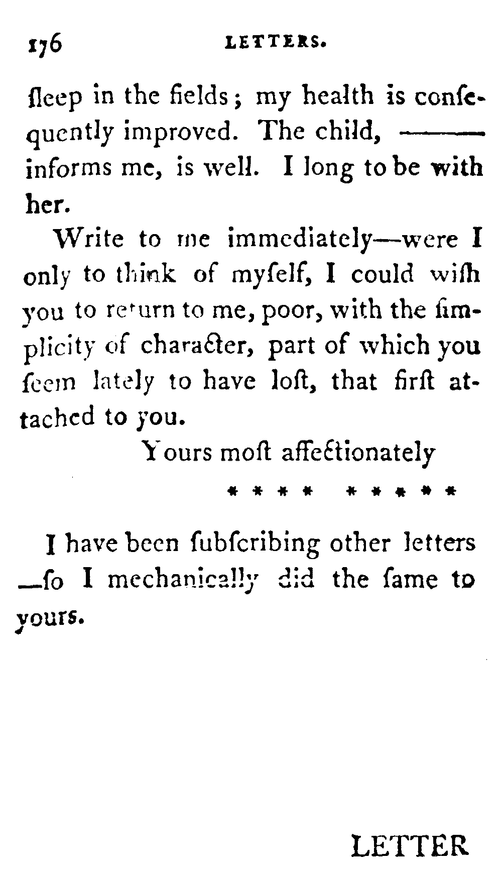 The books she had obtained, were[21] soon devoured, by one who had no other resource to escape from sorrow, and the feverish dreams of ideal wretchedness or felicity, which equally weaken the intoxicated sensibility. Writing was then the only alternative, and she wrote some rhapsodies descriptive of the state of her mind; but the events of her past life pressing on her, she resolved circumstantially to relate them, with the sentiments that experience, and more matured reason, would naturally suggest. They might perhaps instruct her daughter, and shield her from the misery, the tyranny, her mother knew not how to avoid.
