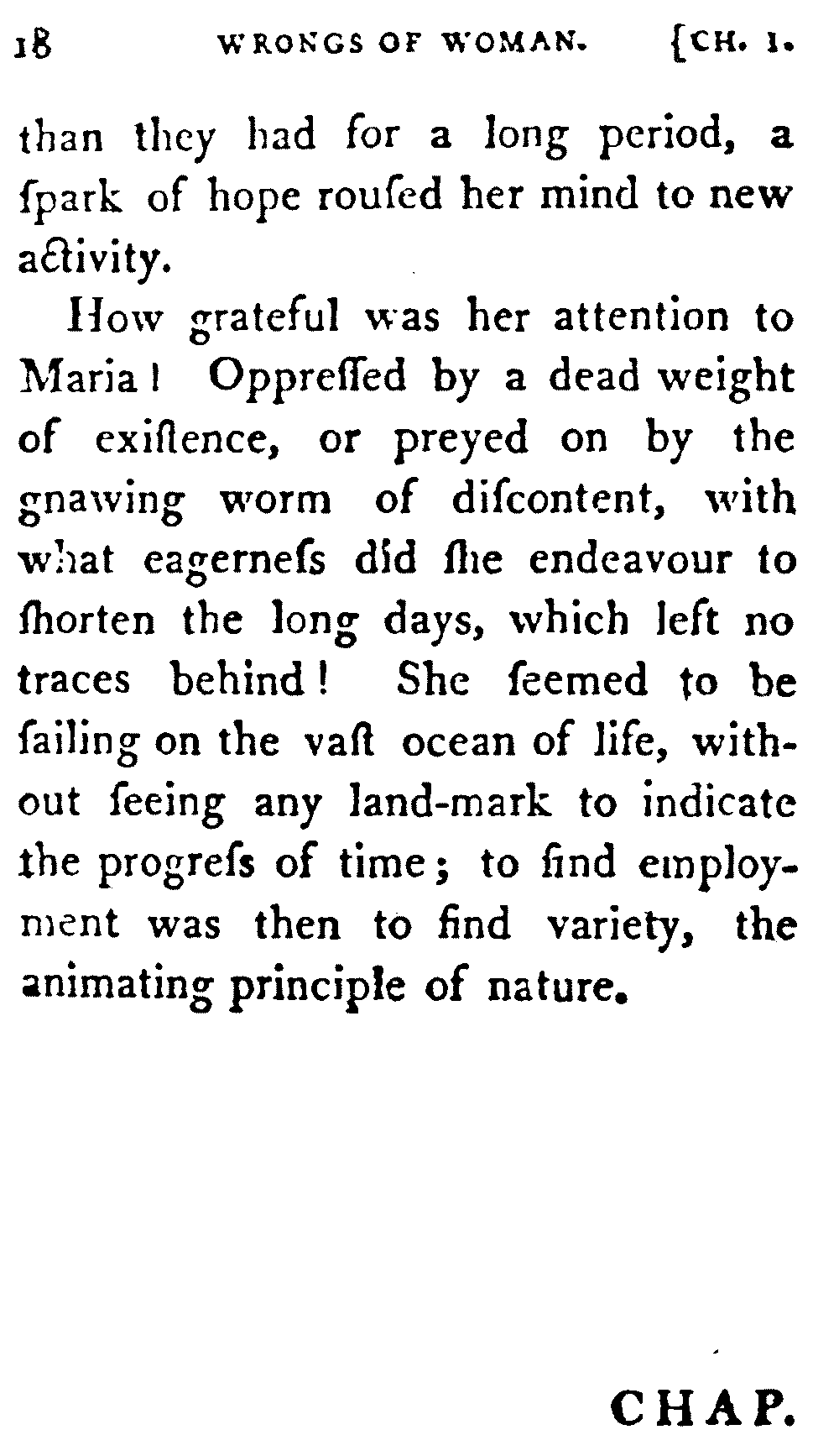 How grateful was her attention to Maria! Oppressed by a dead weight of existence, or preyed on by the gnawing worm of discontent, with what eagerness did she endeavour to shorten the long days, which left no traces behind! She seemed to be sailing on the vast ocean of life, without seeing any land-mark to indicate the progress of time; to find employment was then to find variety, the animating principle of nature.