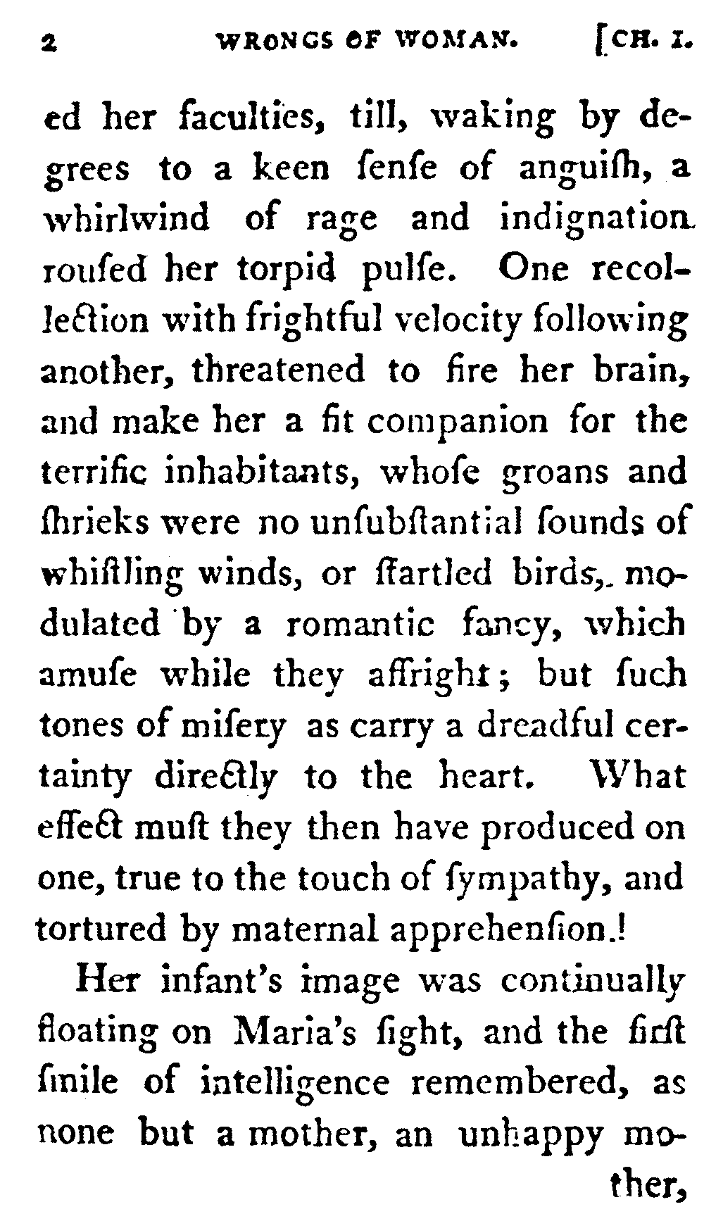 Surprise, astonishment, that bordered on distraction, seemed to have suspend[2]ed her faculties, till, waking by degrees to a keen sense of anguish, a whirlwind of rage and indignation roused her torpid pulse. One recollection with frightful velocity following another, threatened to fire her brain, and make her a fit companion for the terrific inhabitants, whose groans and shrieks were no unsubstantial sounds of whistling winds, or startled birds, modulated by a romantic fancy, which amuse while they affright; but such tones of misery as carry a dreadful certainty directly to the heart. What effect must they then have produced on one, true to the touch of sympathy, and tortured by maternal apprehension!