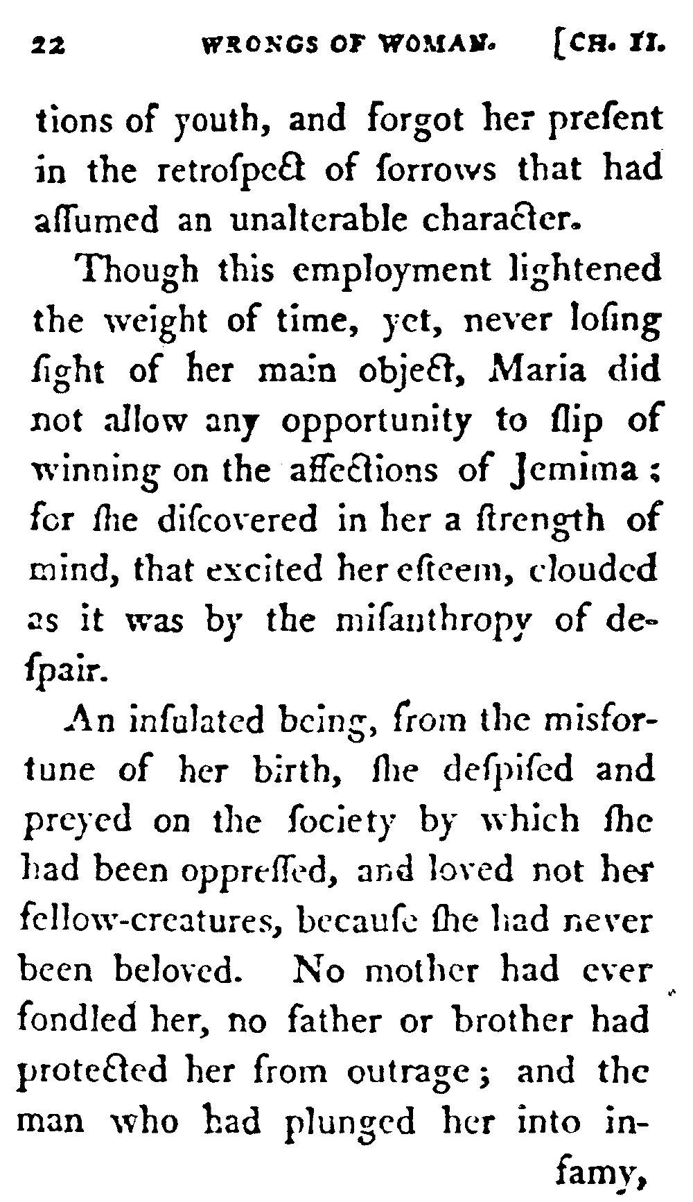 Though this employment lightened the weight of time, yet, never losing sight of her main object, Maria did not allow any opportunity to slip of winning on the affections of Jemima; for she discovered in her a strength of mind, that excited her esteem, clouded as it was by the misanthropy of despair.