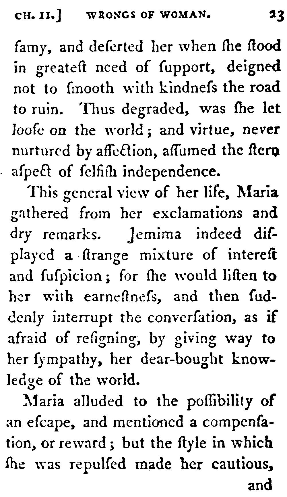 This general view of her life, Maria gathered from her exclamations and dry remarks. Jemima indeed displayed a strange mixture of interest and suspicion; for she would listen to her with earnestness, and then suddenly interrupt the conversation, as if afraid of resigning, by giving way to her sympathy, her dear-bought knowledge of the world.