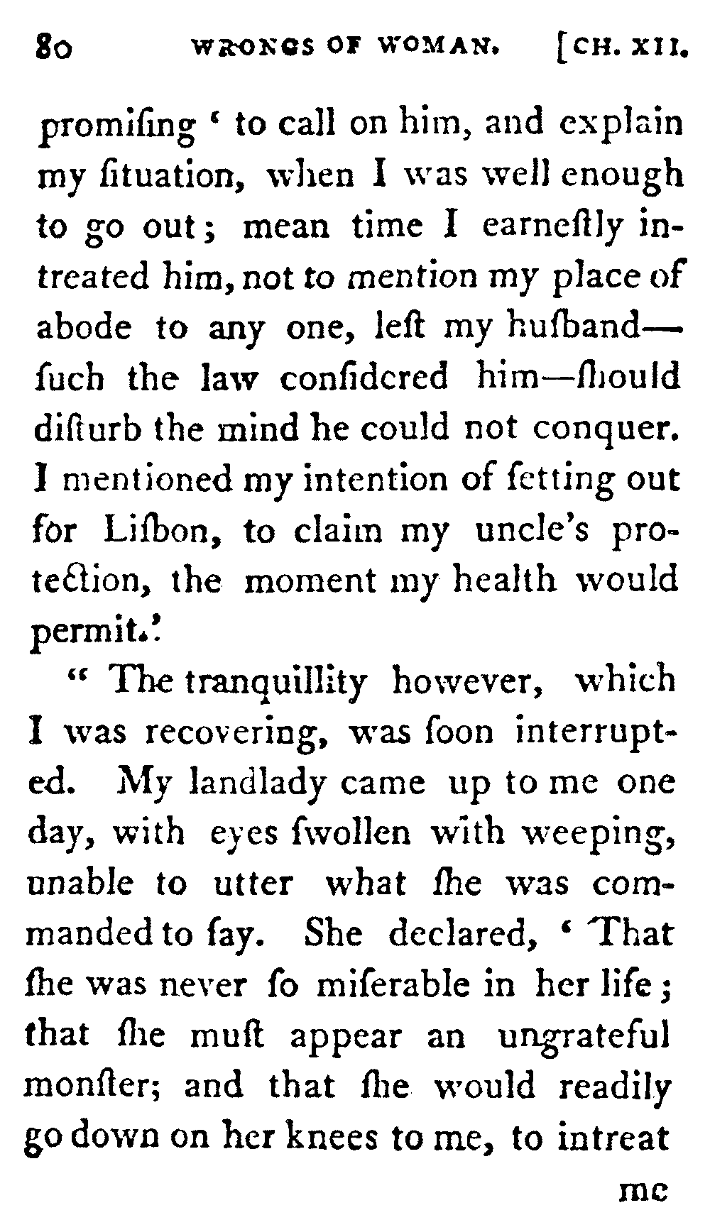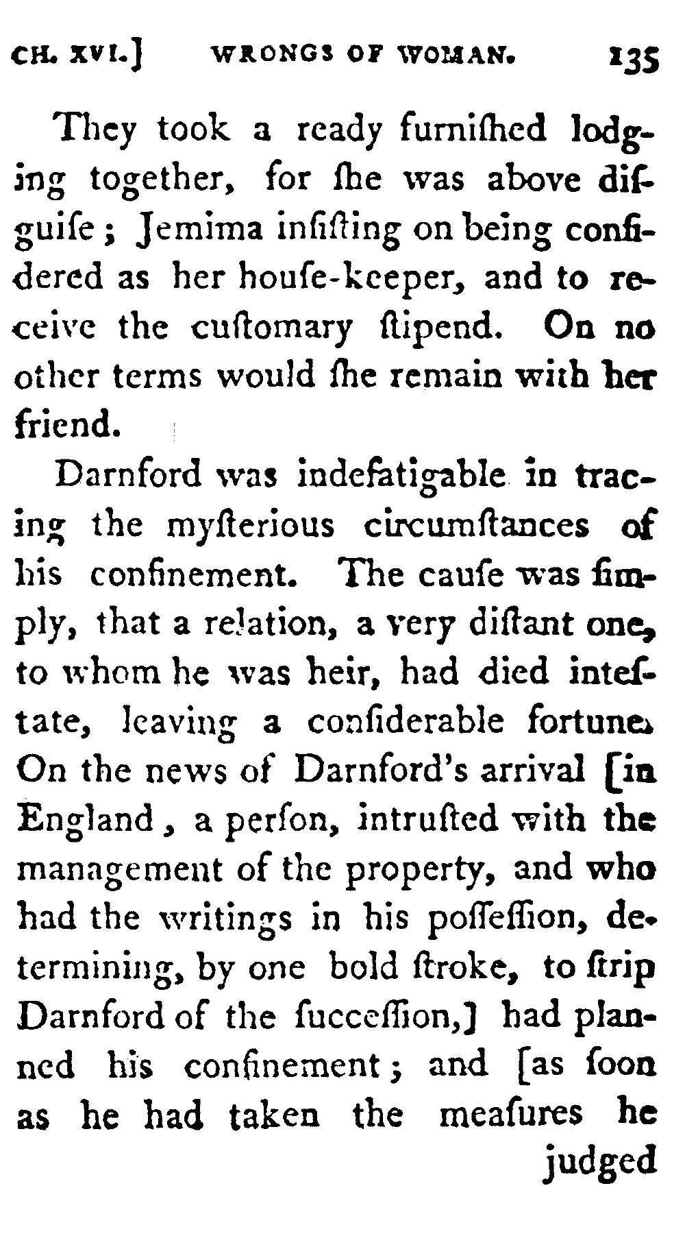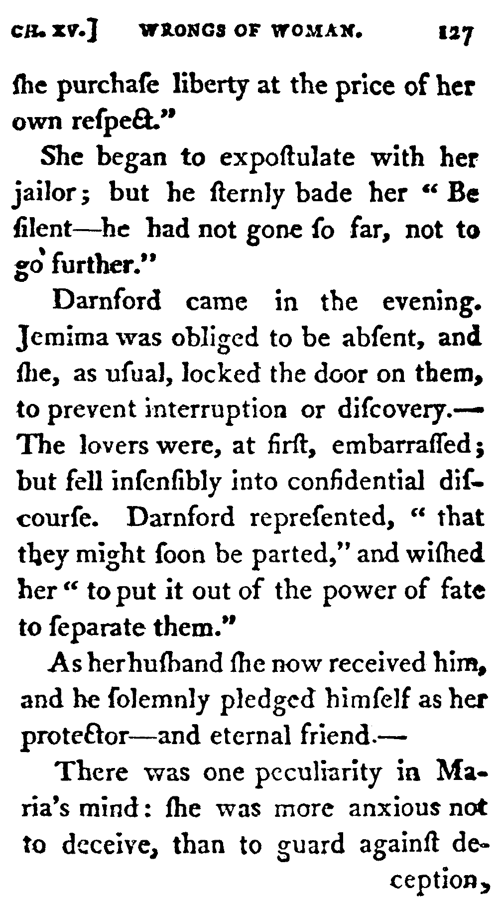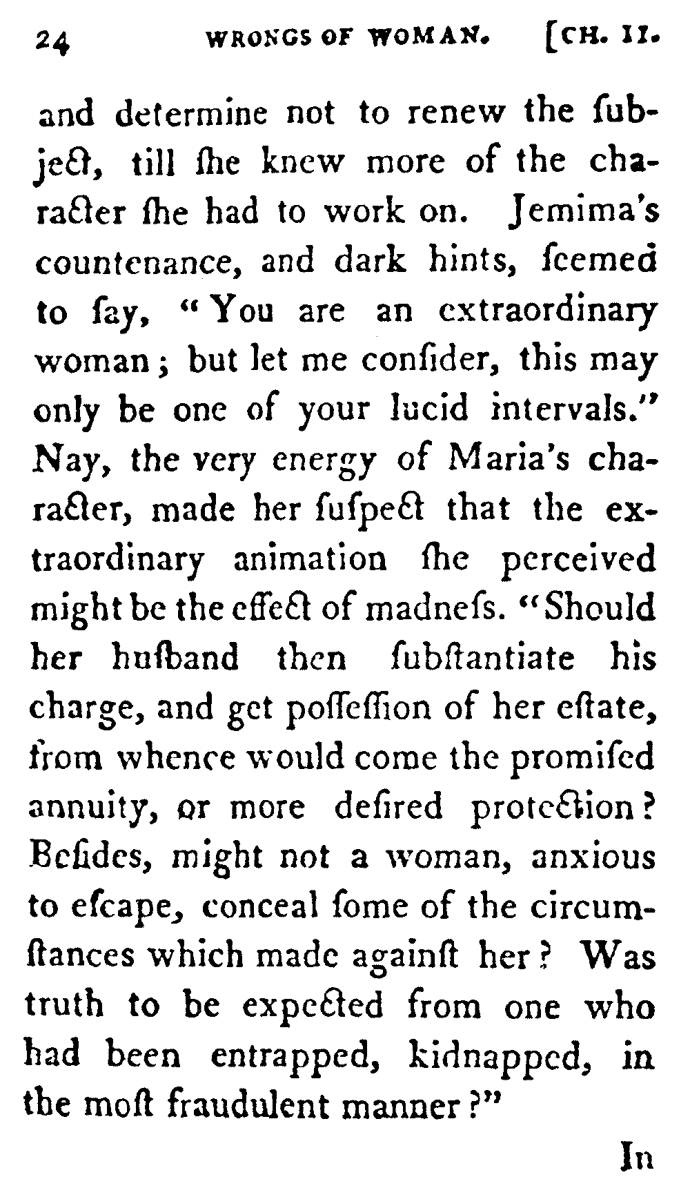 Maria alluded to the possibility of an escape, and mentioned a compensation, or reward; but the style in which she was repulsed made her cautious,[24] and determine not to renew the subject, till she knew more of the character she had to work on. Jemima's countenance, and dark hints, seemed to say, "You are an extraordinary woman; but let me consider, this may only be one of your lucid intervals." Nay, the very energy of Maria's character, made her suspect that the extraordinary animation she perceived might be the effect of madness. "Should her husband then substantiate his charge, and get possession of her estate, from whence would come the promised annuity, or more desired protection? Besides, might not a woman, anxious to escape, conceal some of the circumstances which made against her? Was truth to be expected from one who had been entrapped, kidnapped, in the most fraudulent manner?"