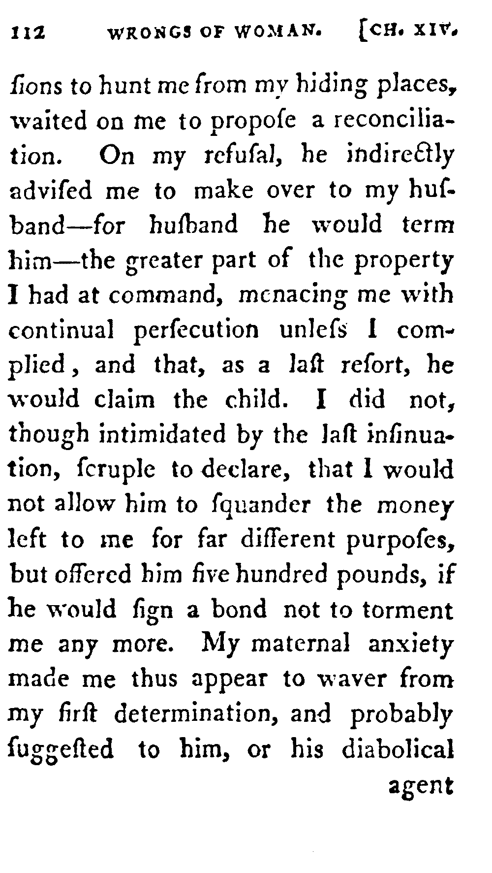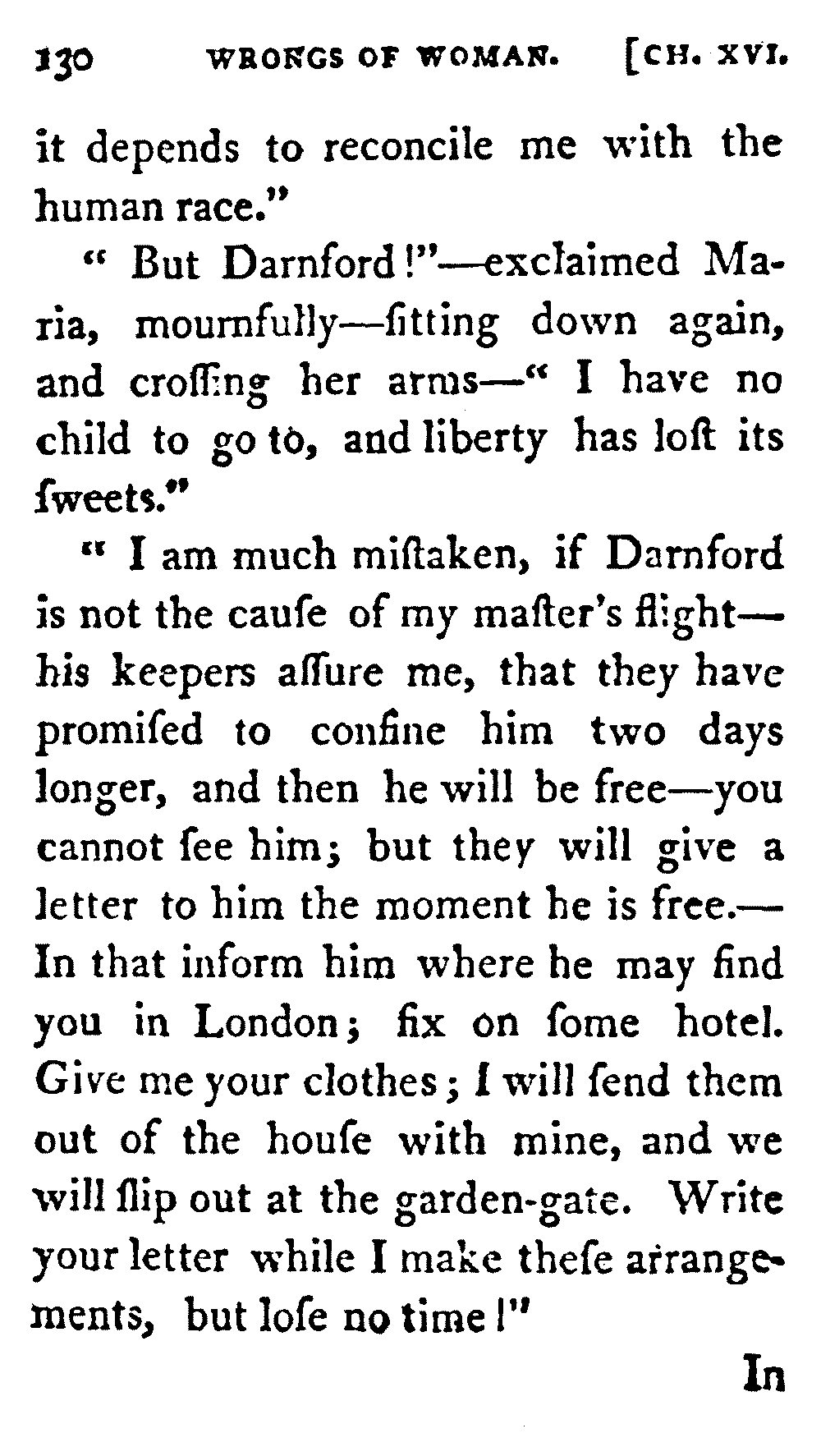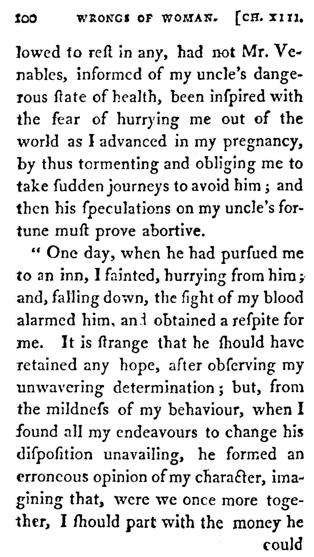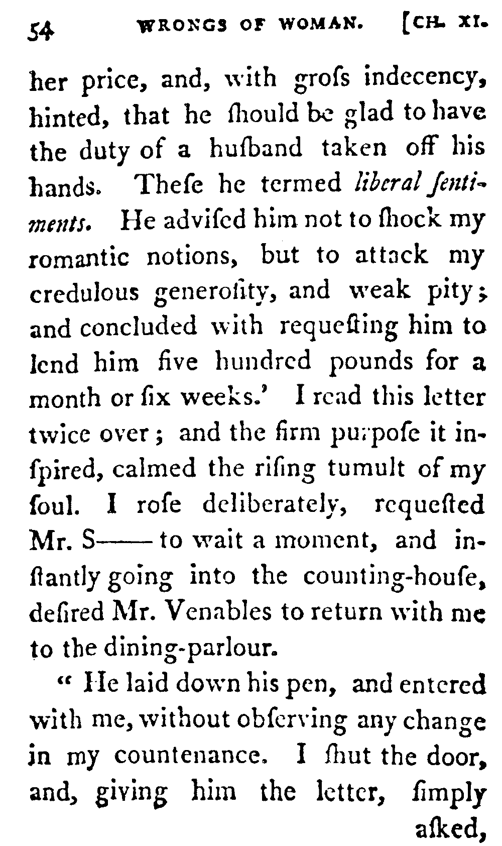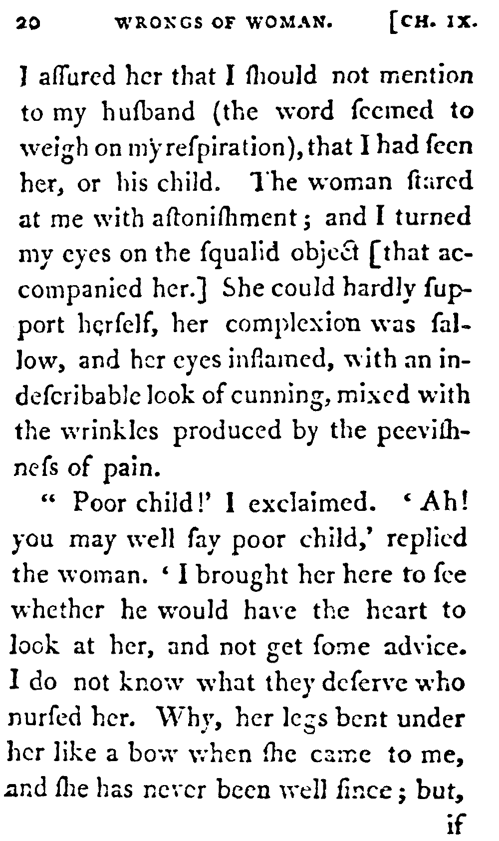 Maria alluded to the possibility of an escape, and mentioned a compensation, or reward; but the style in which she was repulsed made her cautious,[24] and determine not to renew the subject, till she knew more of the character she had to work on. Jemima's countenance, and dark hints, seemed to say, "You are an extraordinary woman; but let me consider, this may only be one of your lucid intervals." Nay, the very energy of Maria's character, made her suspect that the extraordinary animation she perceived might be the effect of madness. "Should her husband then substantiate his charge, and get possession of her estate, from whence would come the promised annuity, or more desired protection? Besides, might not a woman, anxious to escape, conceal some of the circumstances which made against her? Was truth to be expected from one who had been entrapped, kidnapped, in the most fraudulent manner?"