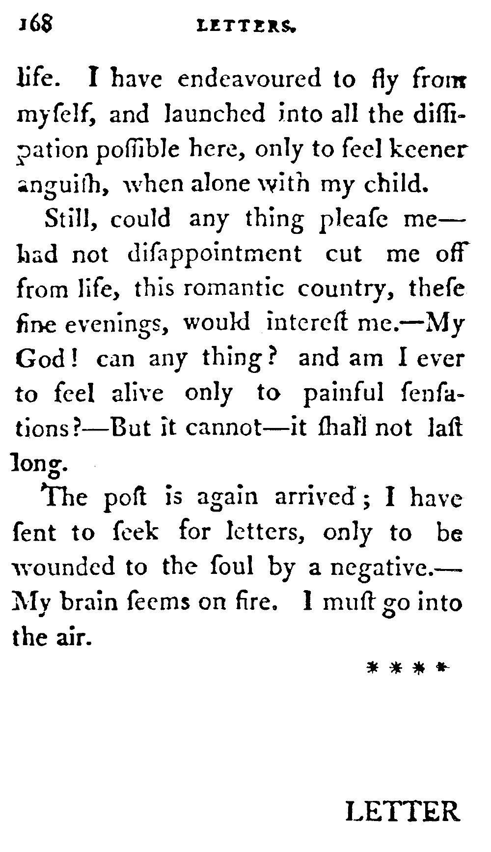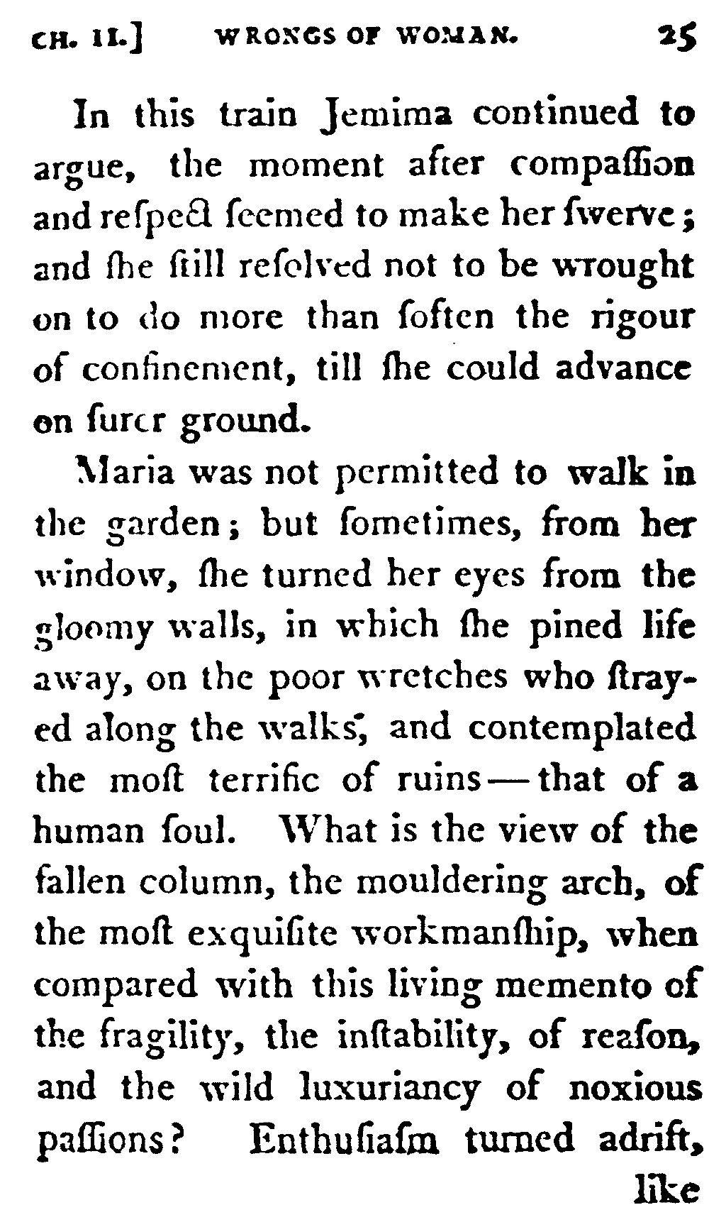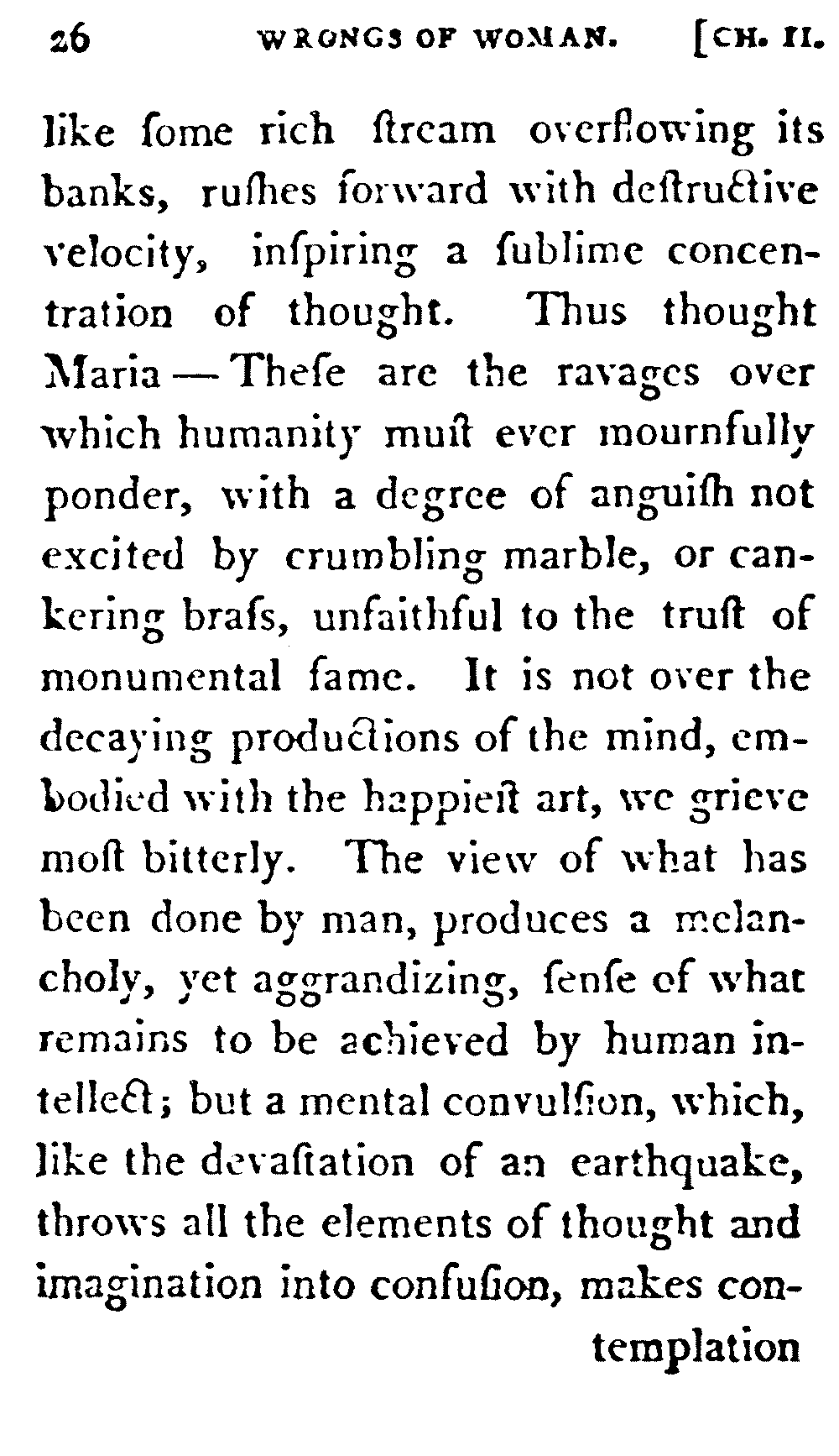 Maria was not permitted to walk in the garden; but sometimes, from her window, she turned her eyes from the gloomy walls, in which she pined life away, on the poor wretches who strayed along the walks, and contemplated the most terrific of ruins—that of a human soul. What is the view of the fallen column, the mouldering arch, of the most exquisite workmanship, when compared with this living memento of the fragility, the instability, of reason, and the wild luxuriancy of noxious passions? Enthusiasm turned adrift,[26] like some rich stream overflowing its banks, rushes forward with destructive velocity, inspiring a sublime concentration of thought. Thus thought Maria—These are the ravages over which humanity must ever mournfully ponder, with a degree of anguish not excited by crumbling marble, or cankering brass, unfaithful to the trust of monumental fame. It is not over the decaying productions of the mind, embodied with the happiest art, we grieve most bitterly. The view of what has been done by man, produces a melancholy, yet aggrandizing, sense of what remains to be achieved by human intellect; but a mental convulsion, which, like the devastation of an earthquake, throws all the elements of thought and imagination into confusion, makes con[27]templation giddy, and we fearfully ask on what ground we ourselves stand.