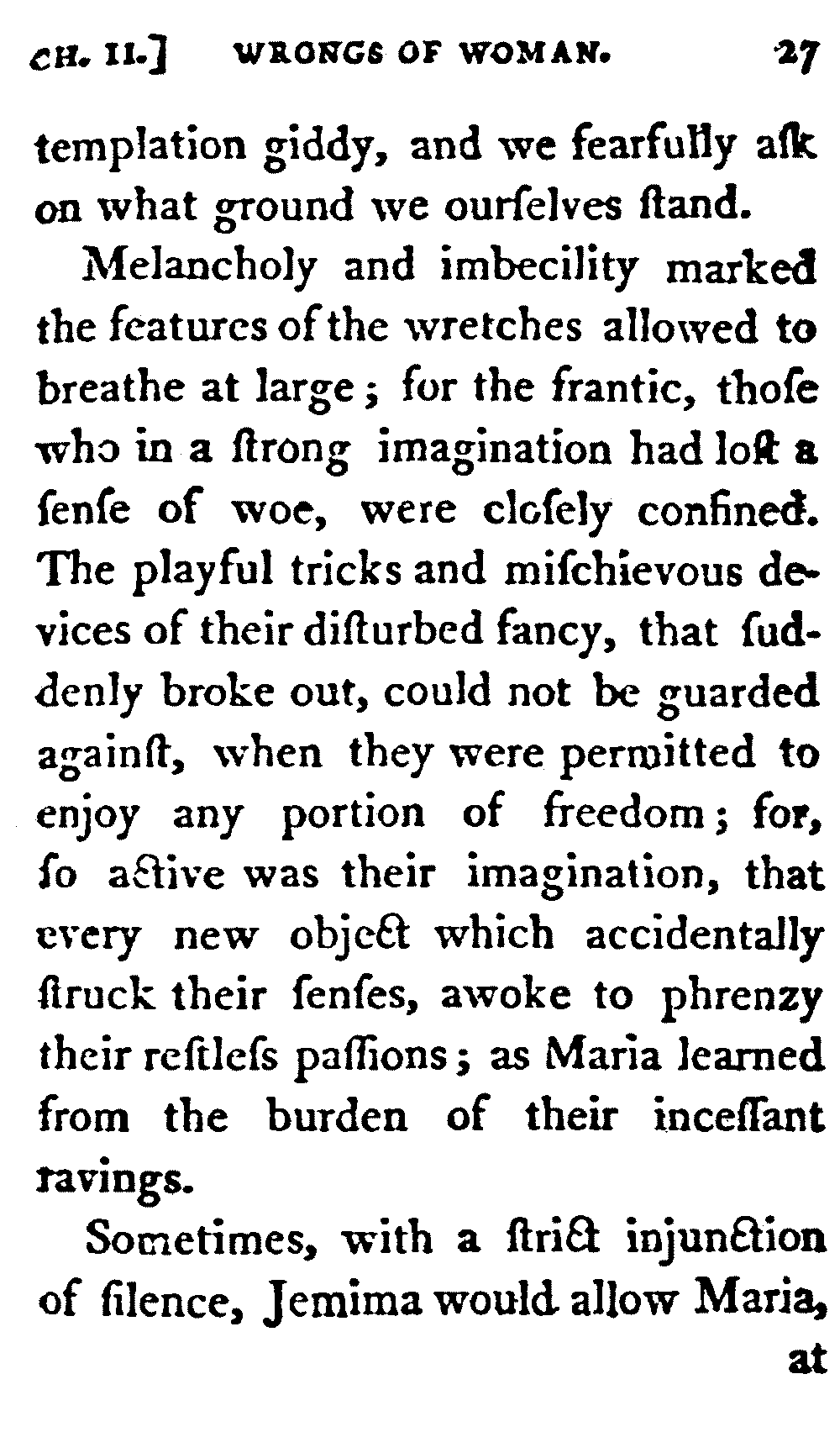 Melancholy and imbecility marked the features of the wretches allowed to breathe at large; for the frantic, those who in a strong imagination had lost a sense of woe, were closely confined. The playful tricks and mischievous devices of their disturbed fancy, that suddenly broke out, could not be guarded against, when they were permitted to enjoy any portion of freedom; for, so active was their imagination, that every new object which accidentally struck their senses, awoke to phrenzy their restless passions; as Maria learned from the burden of their incessant ravings.