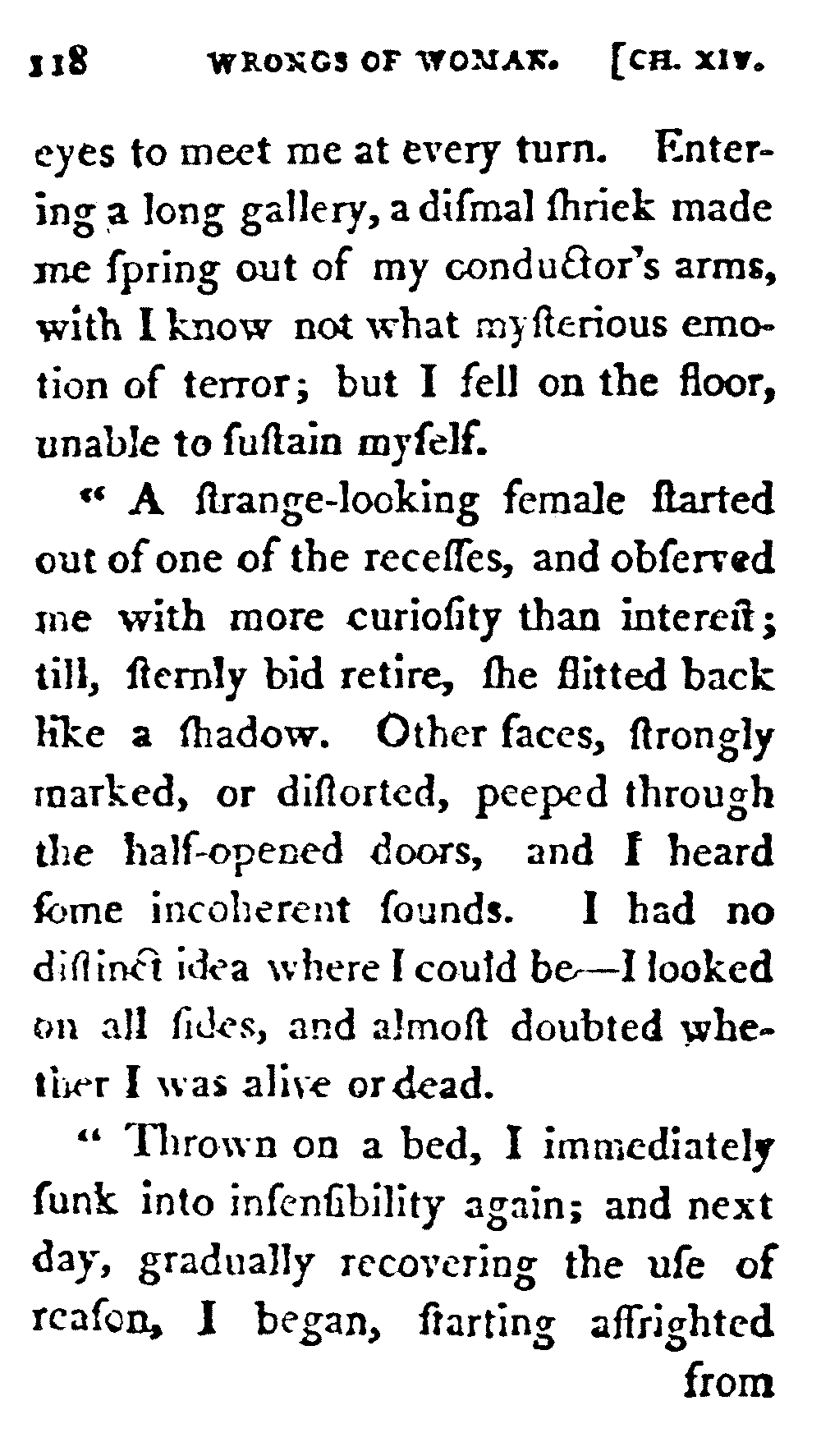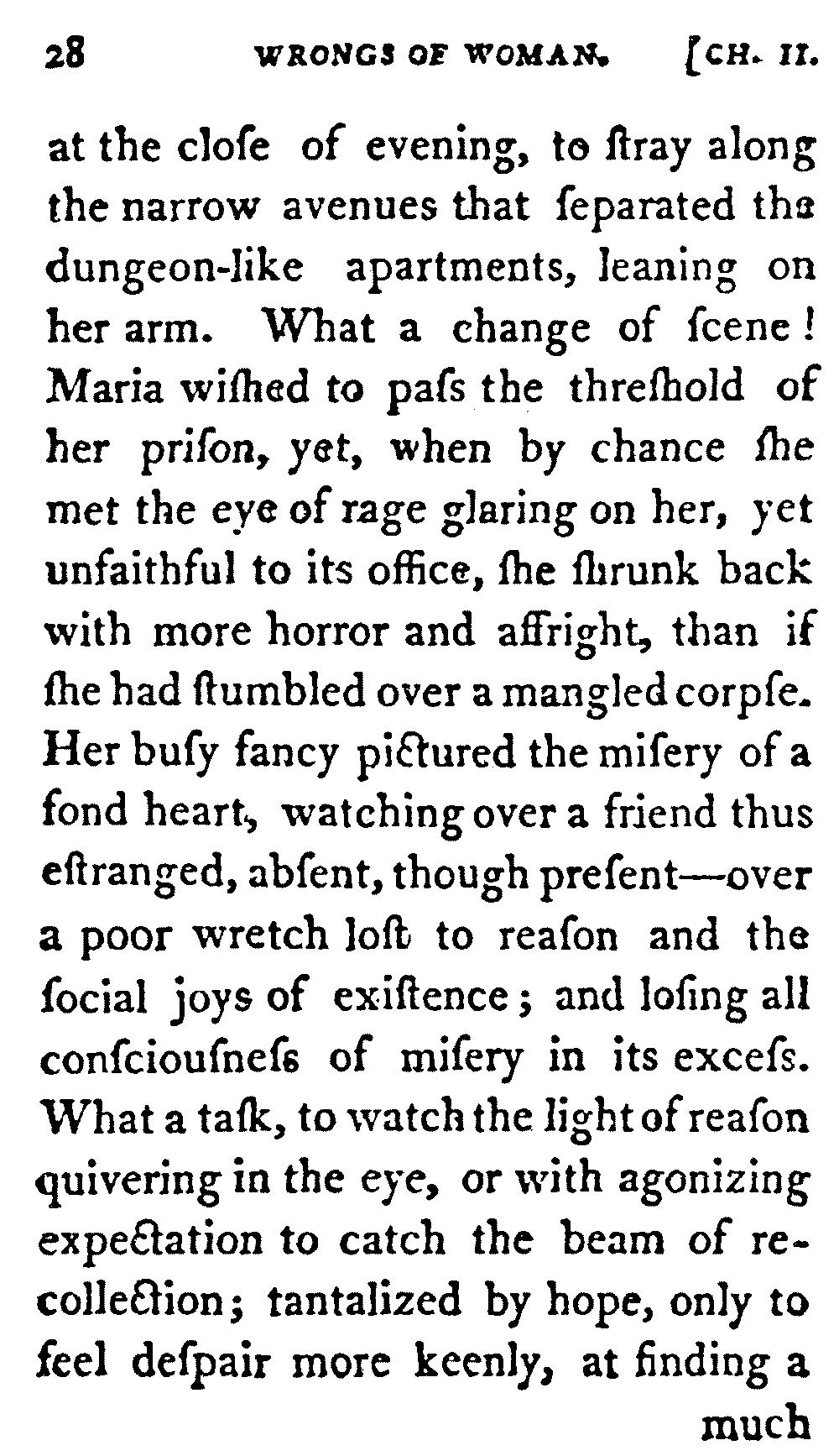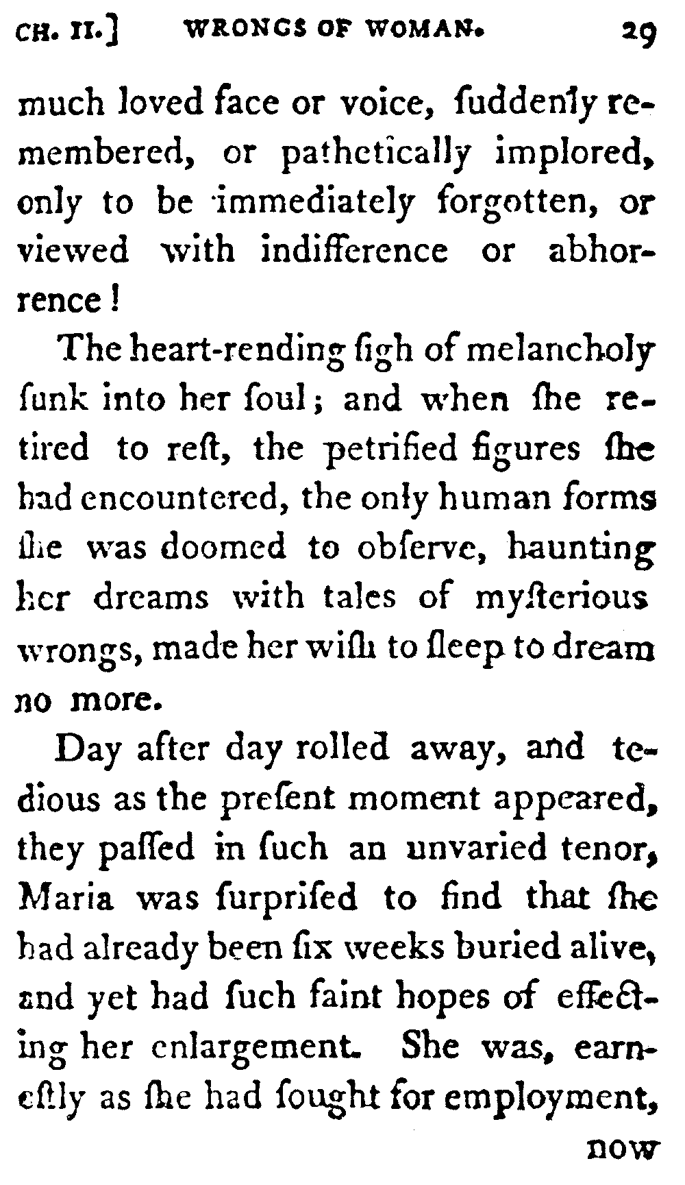 Sometimes, with a strict injunction of silence, Jemima would allow Maria,[28] at the close of evening, to stray along the narrow avenues that separated the dungeon-like apartments, leaning on her arm. What a change of scene! Maria wished to pass the threshold of her prison, yet, when by chance she met the eye of rage glaring on her, yet unfaithful to its office, she shrunk back with more horror and affright, than if she had stumbled over a mangled corpse. Her busy fancy pictured the misery of a fond heart, watching over a friend thus estranged, absent, though present—over a poor wretch lost to reason and the social joys of existence; and losing all consciousness of misery in its excess. What a task, to watch the light of reason quivering in the eye, or with agonizing expectation to catch the beam of recollection; tantalized by hope, only to feel despair more keenly, at finding a[29] much loved face or voice, suddenly remembered, or pathetically implored, only to be immediately forgotten, or viewed with indifference or abhorrence!