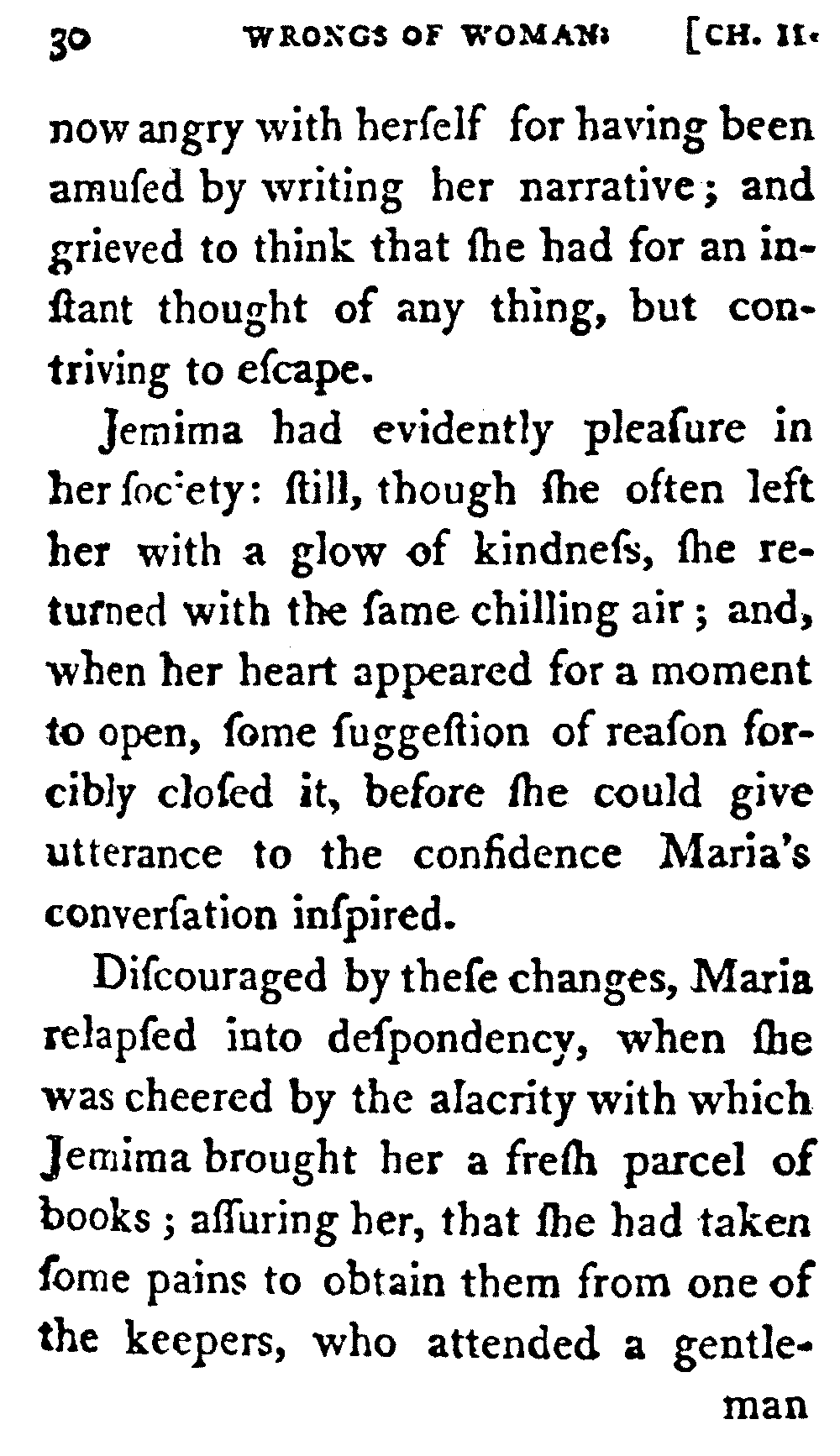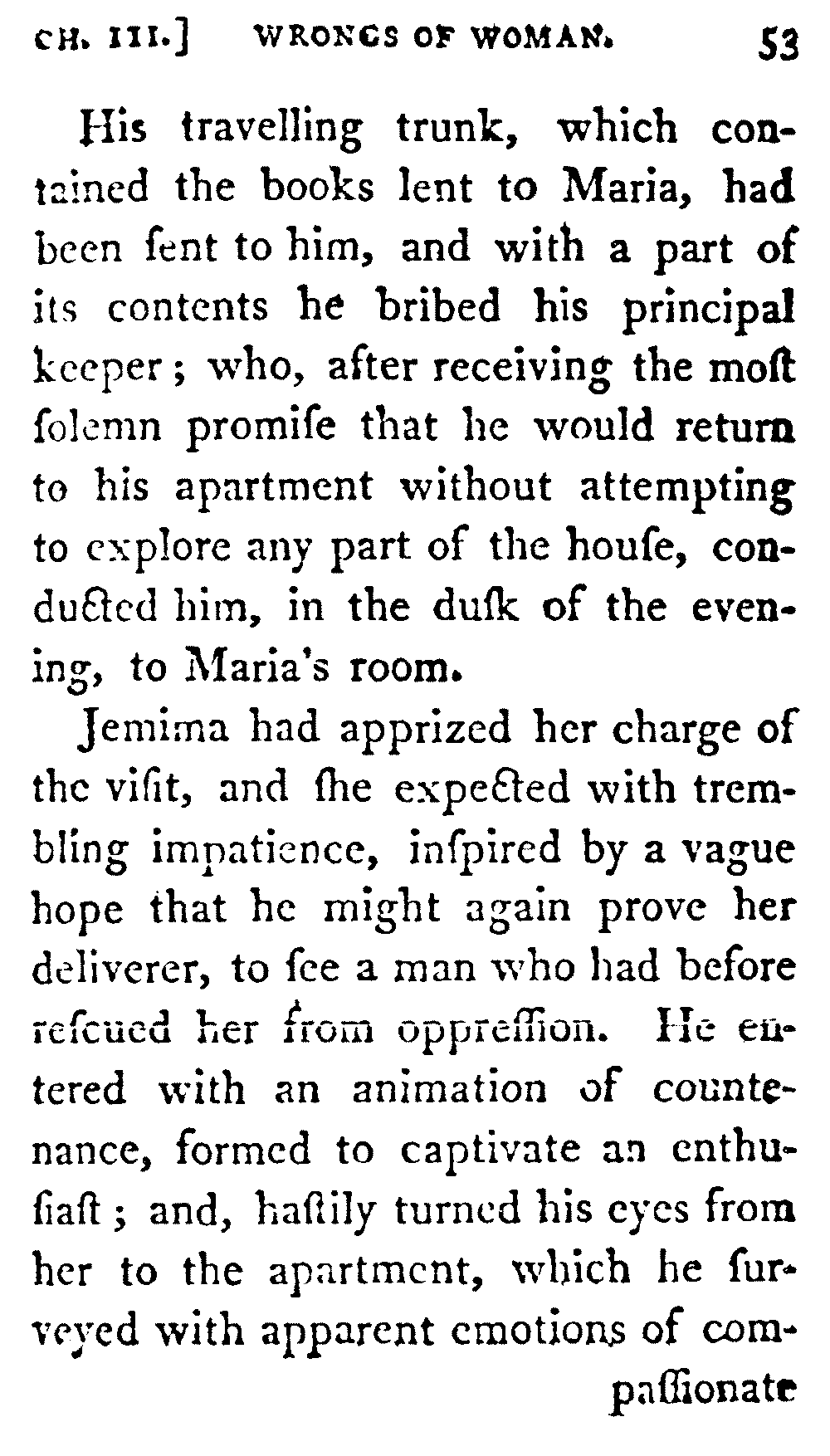 Discouraged by these changes, Maria relapsed into despondency, when she was cheered by the alacrity with which Jemima brought her a fresh parcel of books; assuring her, that she had taken some pains to obtain them from one of the keepers, who attended a gentle[31]man confined in the opposite corner of the gallery.