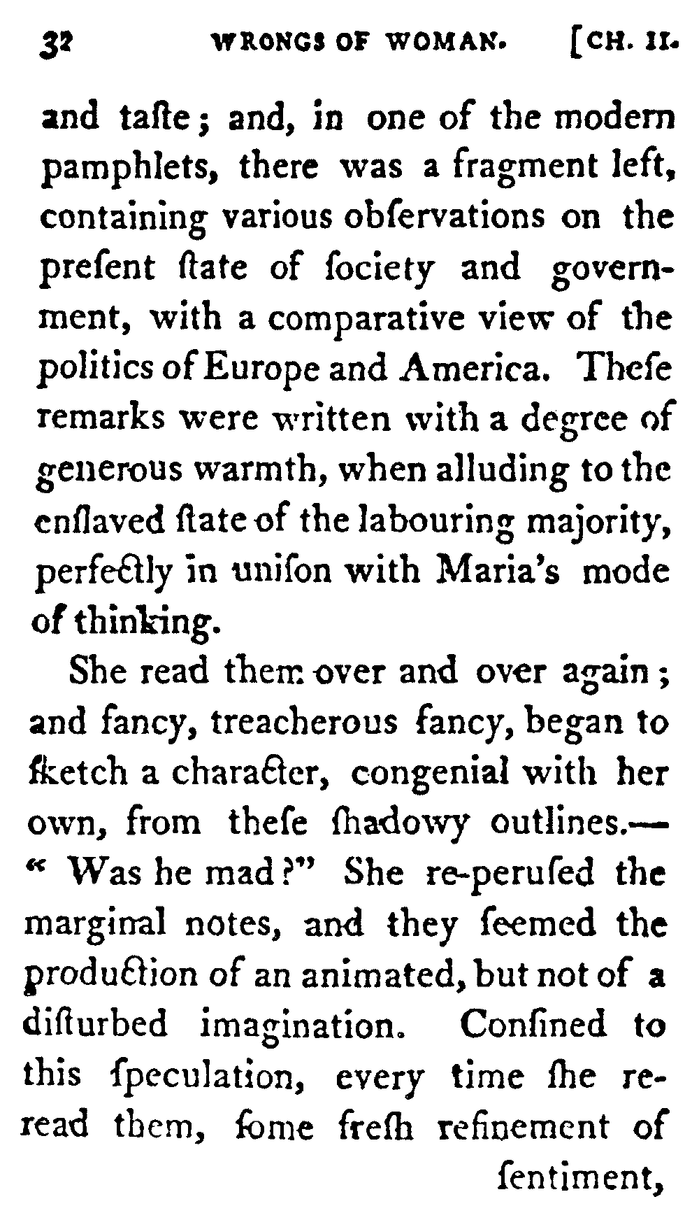 Dryden's Fables, Milton's Paradise Lost, with several modern productions, composed the collection. It was a mine of treasure. Some marginal notes, in Dryden's Fables, caught her attention: they were written with force[32] and taste; and, in one of the modern pamphlets, there was a fragment left, containing various observations on the present state of society and government, with a comparative view of the politics of Europe and America. These remarks were written with a degree of generous warmth, when alluding to the enslaved state of the labouring majority, perfectly in unison with Maria's mode of thinking.