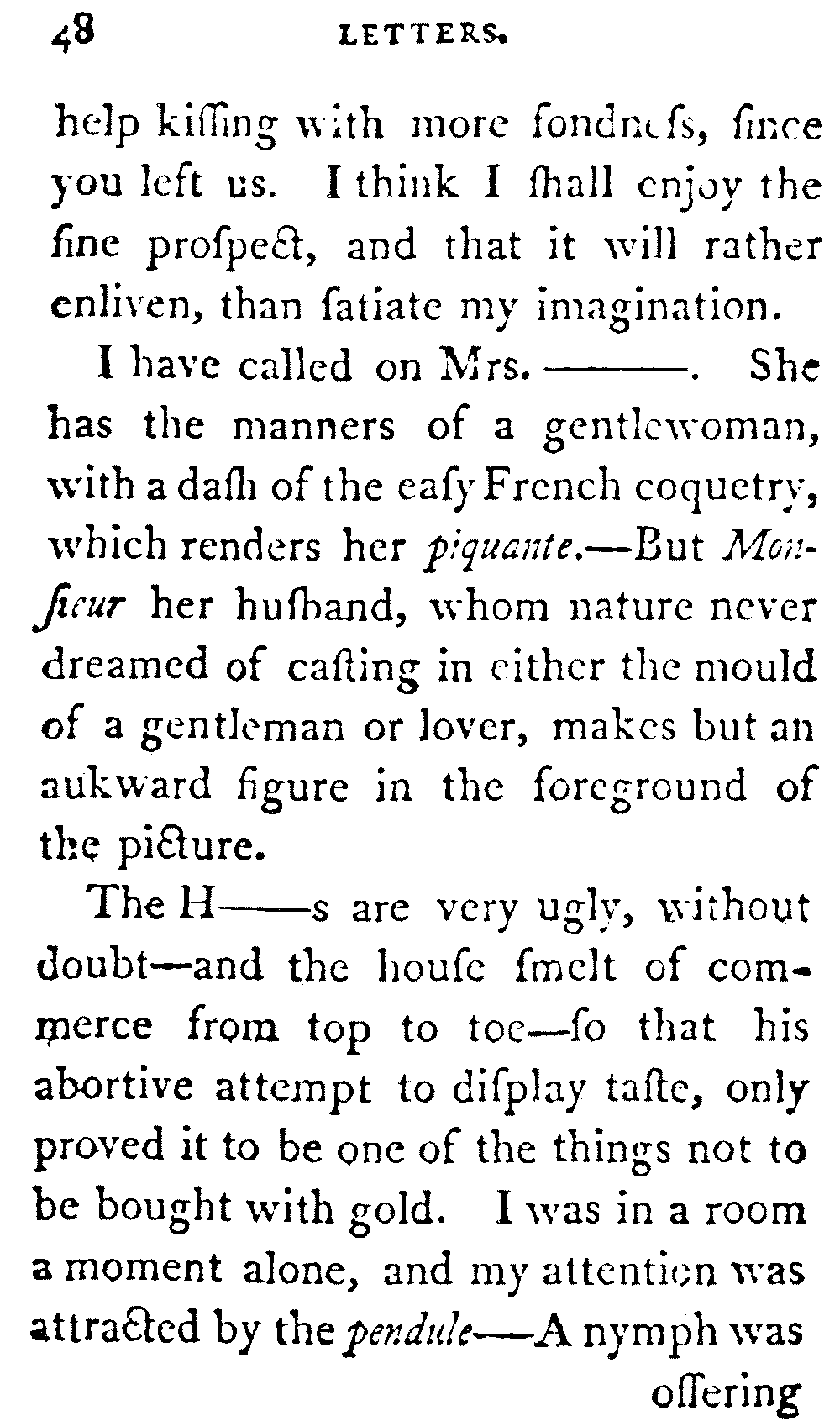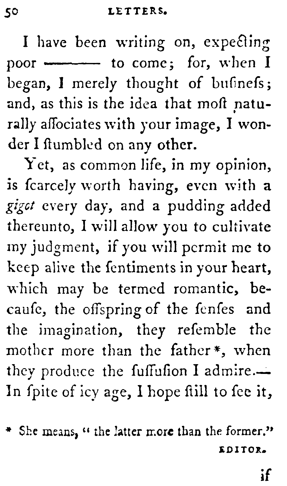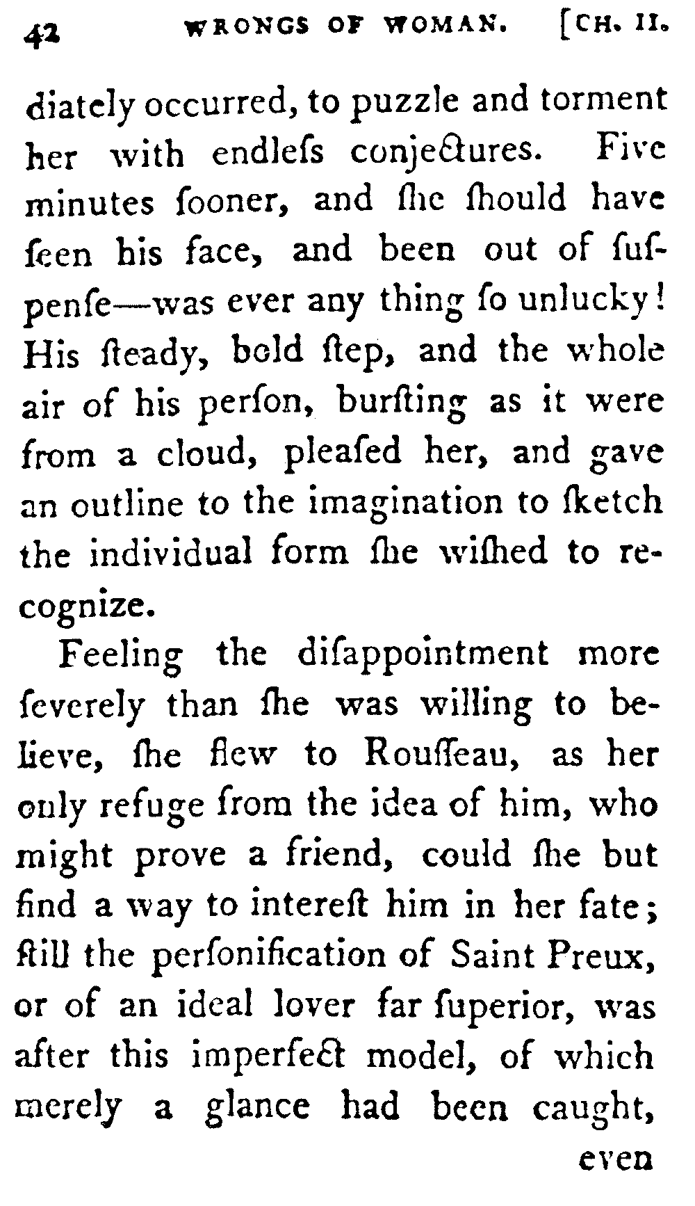 She read them over and over again; and fancy, treacherous fancy, began to sketch a character, congenial with her own, from these shadowy outlines.—"Was he mad?" She re-perused the marginal notes, and they seemed the production of an animated, but not of a disturbed imagination. Confined to this speculation, every time she re-read them, some fresh refinement of[33] sentiment, or acuteness of thought impressed her, which she was astonished at herself for not having before observed.