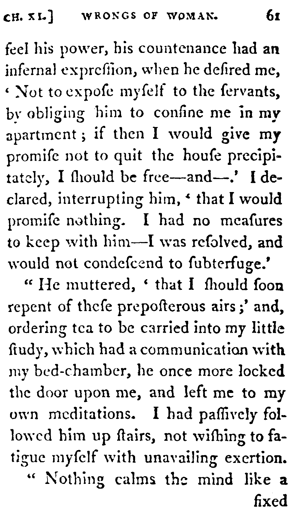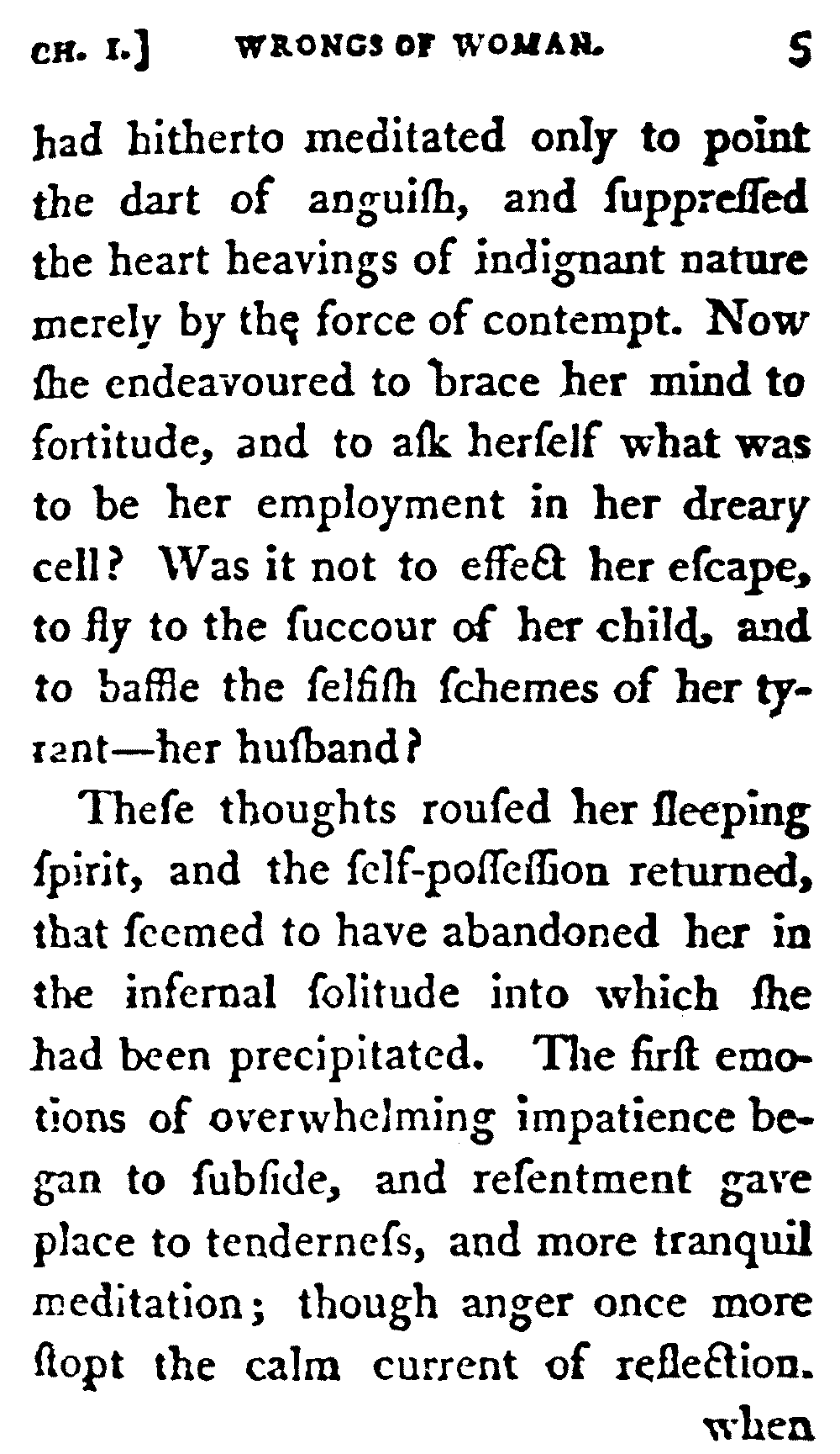 After being two days the prey of impetuous, varying emotions, Maria began to reflect more calmly on her present situation, for she had actually been rendered incapable of sober reflection, by the discovery of the act of atrocity of which she was the victim. She could not have imagined, that, in all the fermentation of civilized depravity, a similar plot could have entered a human mind. She had been stunned by an unexpected blow; yet life, however joyless, was not to be indolently resigned, or misery endured without exertion, and proudly termed patience. She[5] had hitherto meditated only to point the dart of anguish, and suppressed the heart heavings of indignant nature merely by the force of contempt. Now she endeavoured to brace her mind to fortitude, and to ask herself what was to be her employment in her dreary cell? Was it not to effect her escape, to fly to the succour of her child, and to baffle the selfish schemes of her tyrant—her husband?