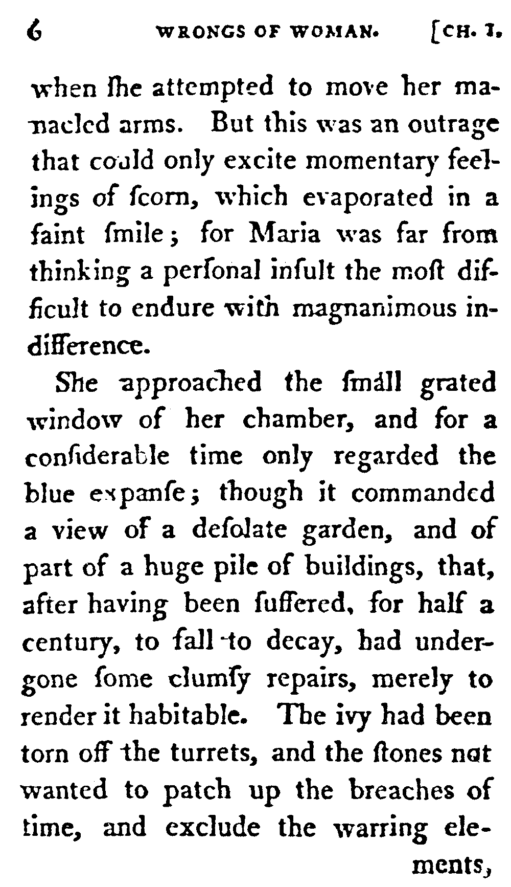 These thoughts roused her sleeping spirit, and the self-possession returned, that seemed to have abandoned her in the infernal solitude into which she had been precipitated. The first emotions of overwhelming impatience began to subside, and resentment gave place to tenderness, and more tranquil meditation; though anger once more stopt the calm current of reflection,[6] when she attempted to move her manacled arms. But this was an outrage that could only excite momentary feelings of scorn, which evaporated in a faint smile; for Maria was far from thinking a personal insult the most difficult to endure with magnanimous indifference.