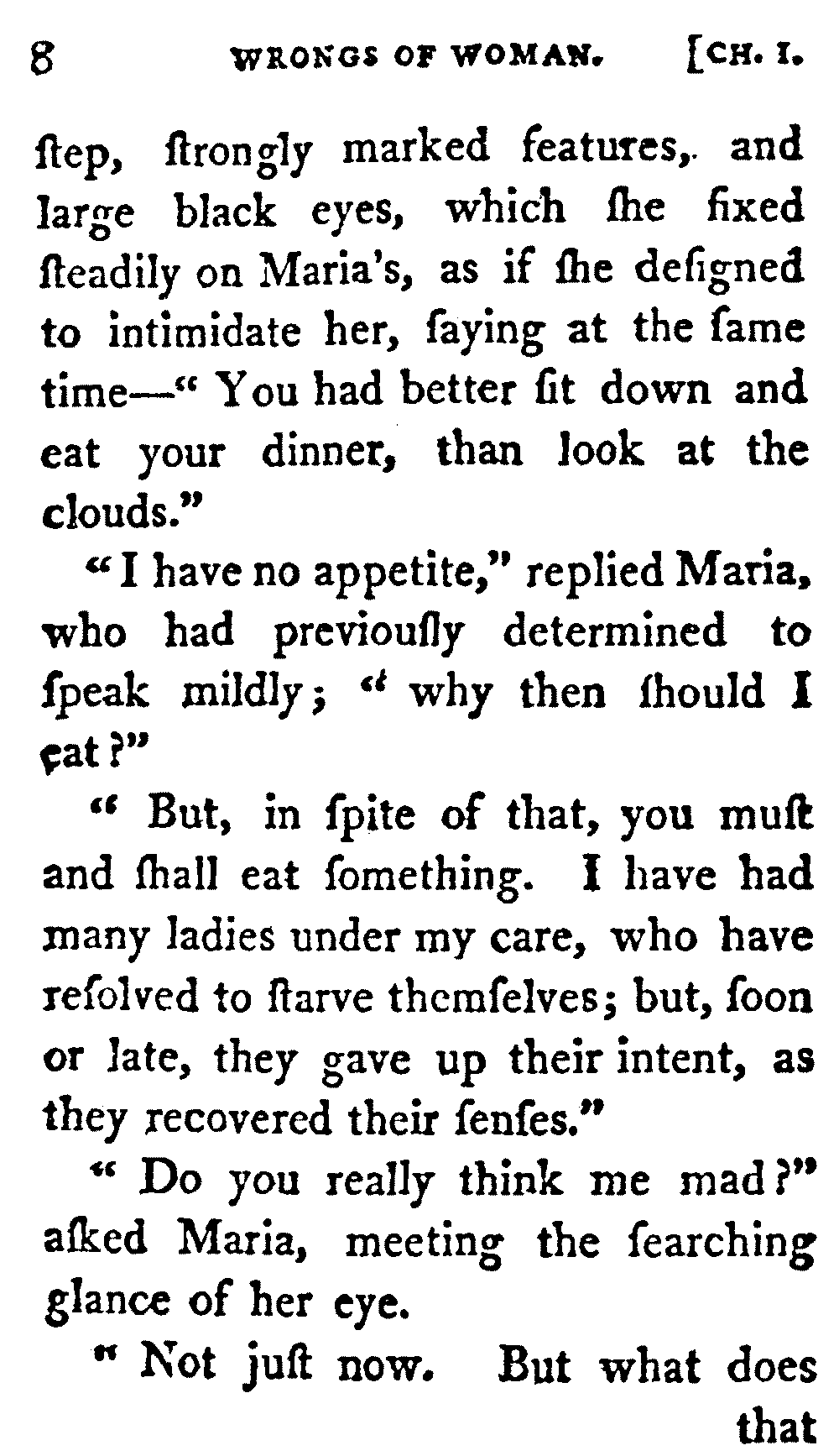 "Not just now. But what does[9] that prove?—only that you must be the more carefully watched, for appearing at times so reasonable. You have not touched a morsel since you entered the house."—Maria sighed intelligibly.—"Could any thing but madness produce such a disgust for food?"